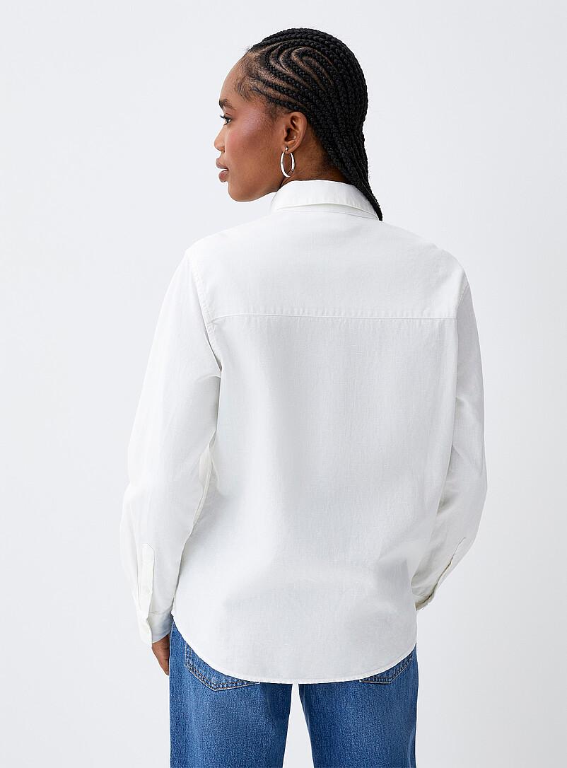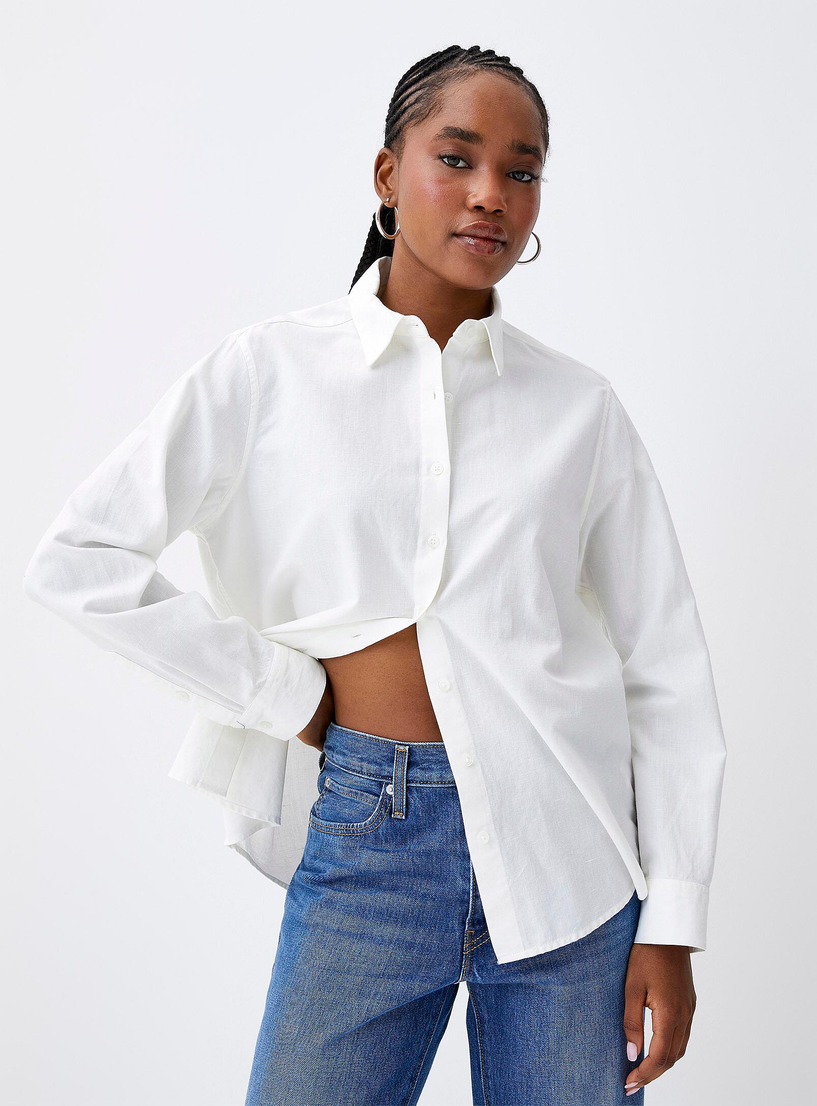 Twik - Touch of linen loose oxford shirt Twik Twik by Simons: an exclusive designed in Canada Piqué fabric in a cotton and linen blend Buttons down the front Rounded hem Loose fit The size of the item pictured is small
