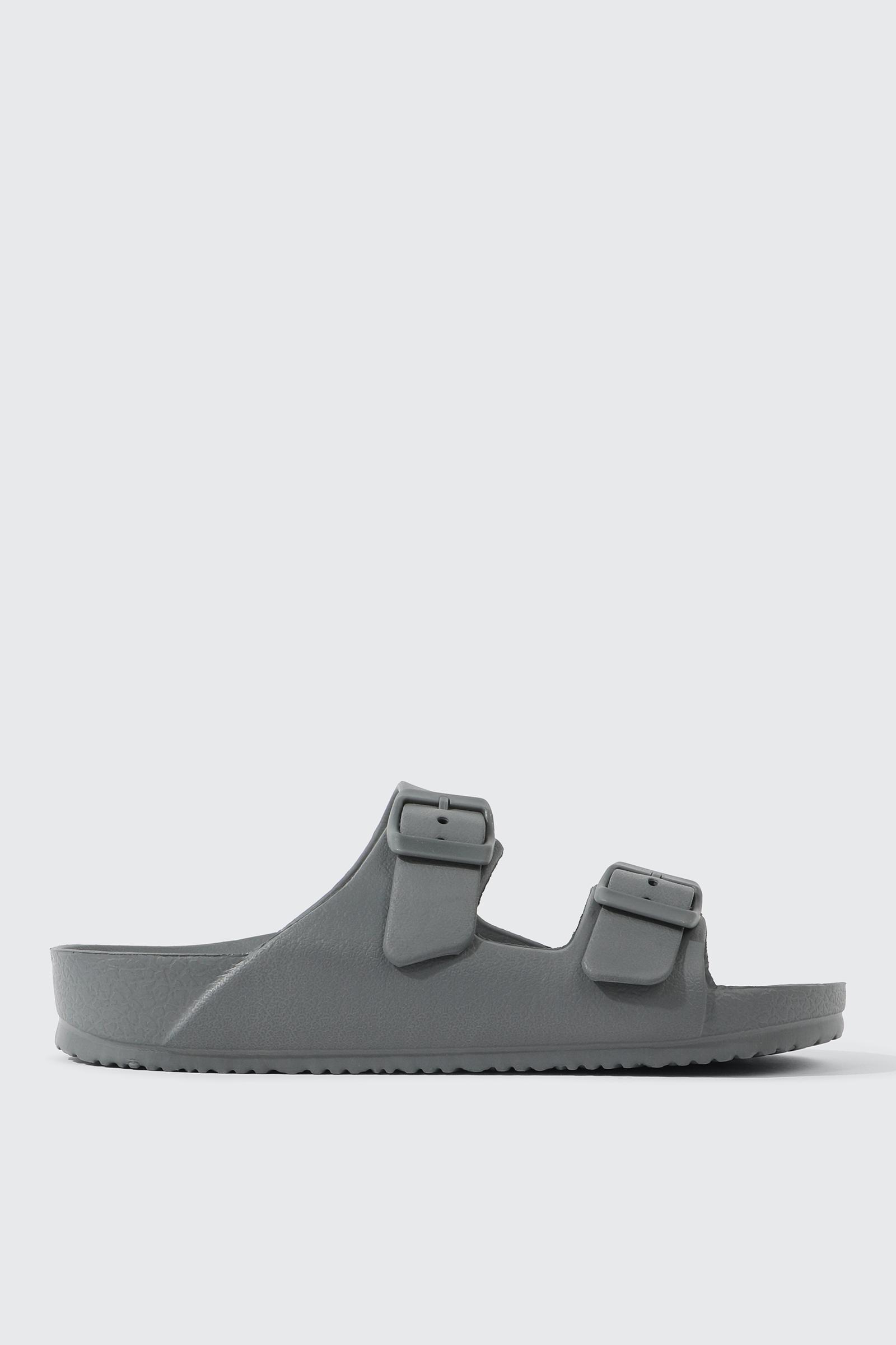 Eco-conscious slide sandals. Two adjustable straps with buckles Lightweight Water-resistant Upper: EVA and recycled plastic bottles Lining and outsole: EVA | Ardene Two-Strap Sandals in Dark Grey | Size 7 | Eco-Conscious