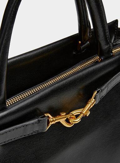 Rebecca Minkoff at Simons Genuine leather Zip on top Grab handles and removable, adjustable crossbody strap Large slit pockets inside Studs on the bottom of the bag Signature dust bag included