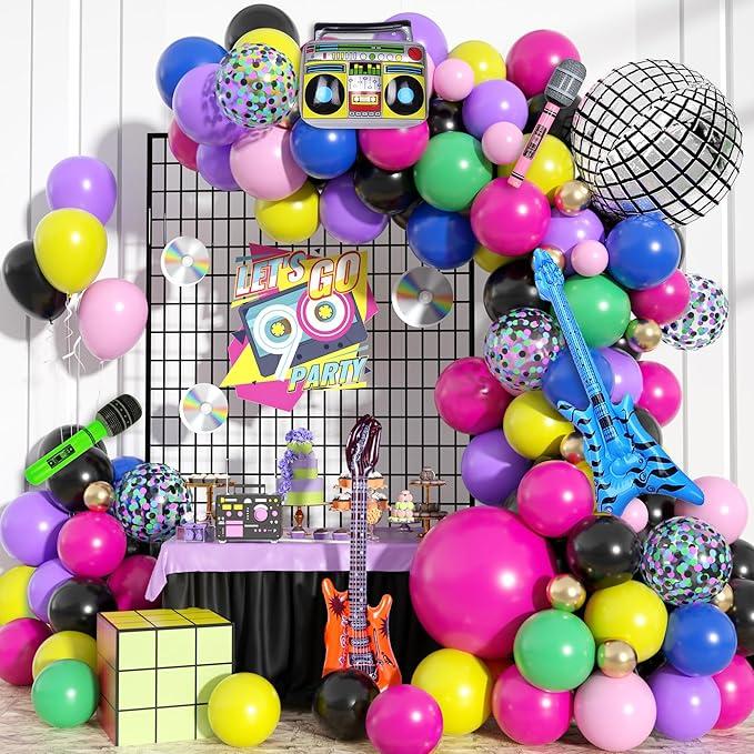 80s 90s Theme Balloon Garland Kit - This 82pcs 5 inch/10 inch/12inch/18inch latex balloons pack include 5 inch balloons (pink*5, metallic gold*8), 10 inch balloons (pink*10, blue*5, yellow*10, purple*10, black*10, green*5, hot pink*10), 12 inch balloons (confetti*5), 18 inch balloon(hot pink*1), 6pcs foil balloons(red guitar, blue bass, green microphone, pink microphone, disco ball, boom box),16ft balloon strip tape (1 roll), 100pcs glue dot (1 roll). Disclosure: We are a participant in the Amazon Services LLC Associates Program, an affiliate advertising program designed to provide a means for us to earn fees by linking to Amazon.ca and Affiliate sites.