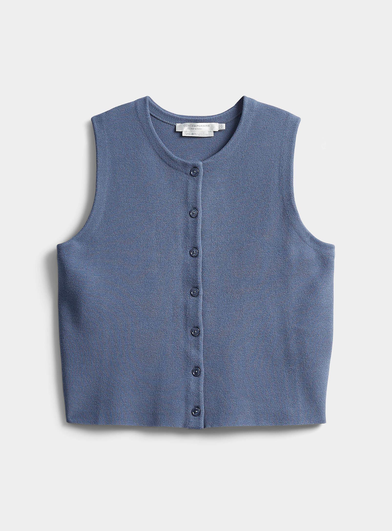 Contemporaine - Thick knit buttoned sweater vest Contemporaine Contemporaine by Simons: an exclusive designed in Canada Thick stretch knit in a reprocessed viscose blend Regular fit Crew neck Shiny tone-on-tone buttons The size of the item pictured is small