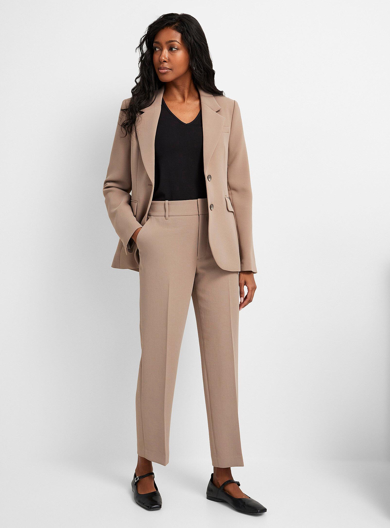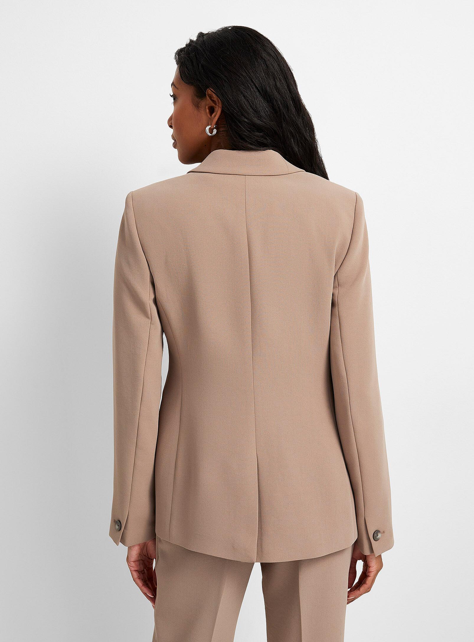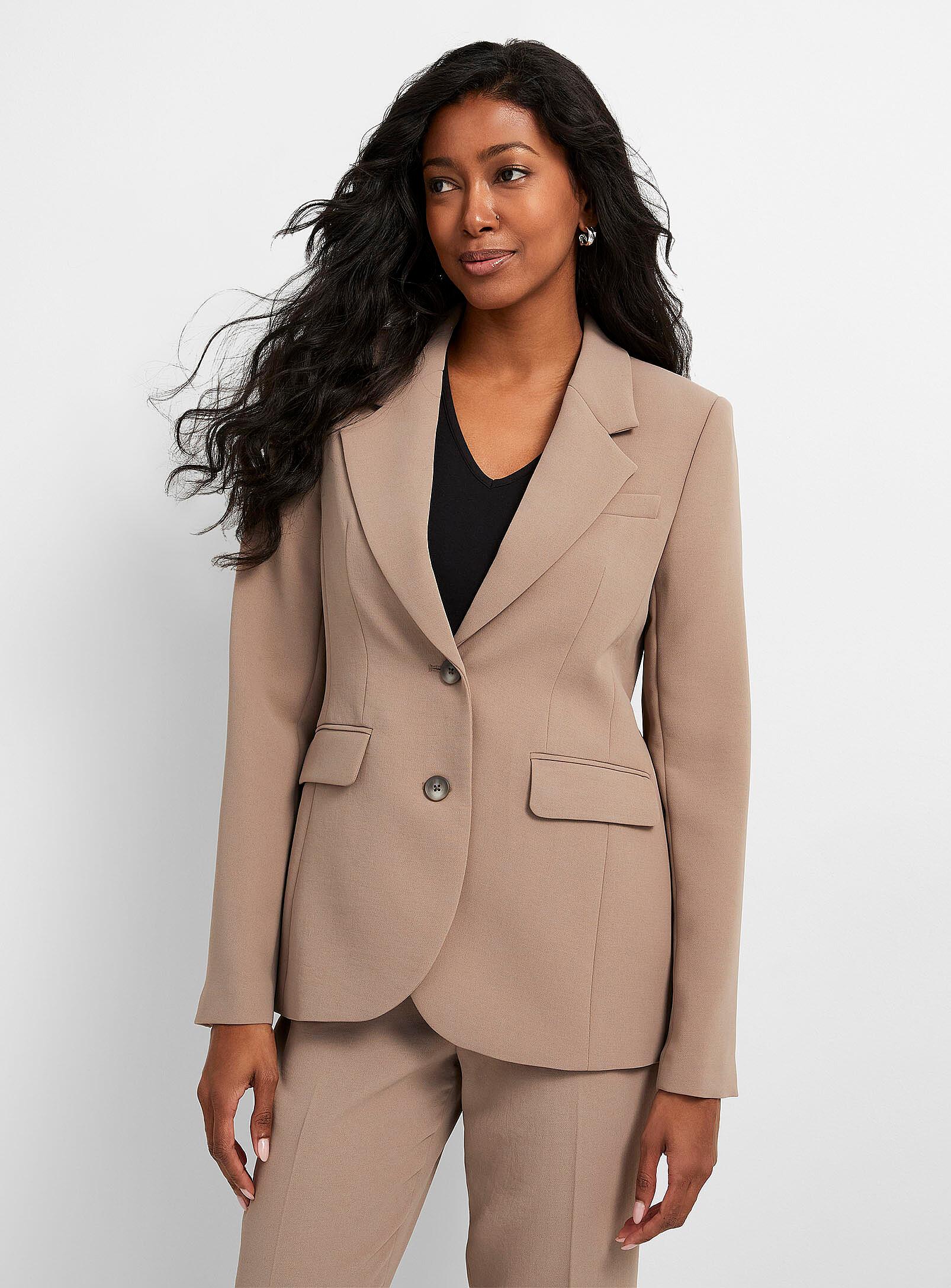Women > Jackets & Blazersbr>Contemporaine - Two-button textured stretch crepe blazer Contemporainebr>b>Contemporaine by Simons: an exclusive designed in Canada/b>br>ul>li>Stretch polyester crepe made from recycled plastic bottles, fine satiny lining/li>li>Regular fit/li>li>Simple closure with two marbled buttons/li>li>Flap pockets and slit pocket at the chest/li>li>Notch collar/li>li>Built-in shoulder pads/li>li>Matching shorts also available: 9718-220257/li>li>Matching trouser also available: 9718-220252/li>/ul>br>br>The size of the item pictured is 4