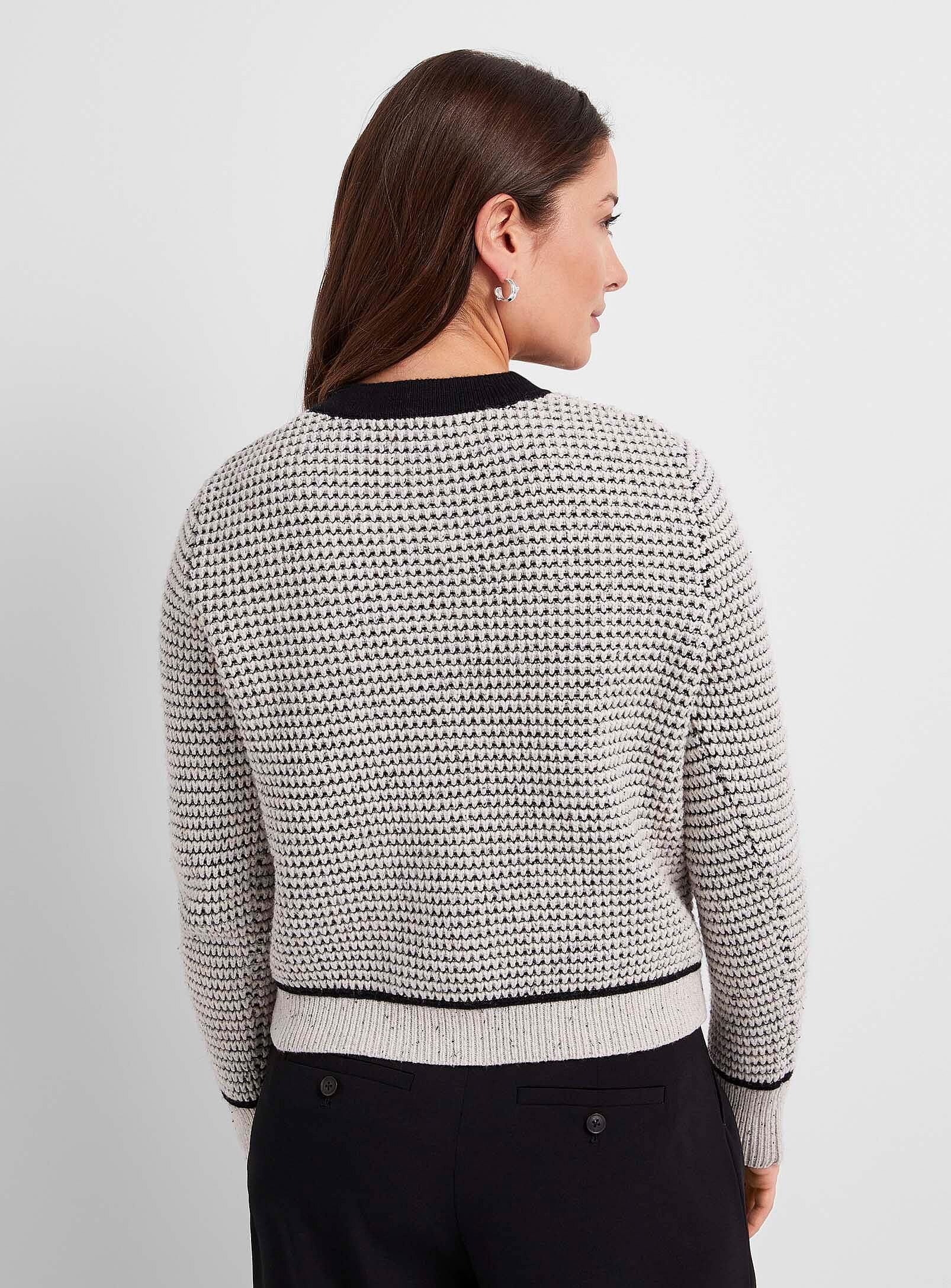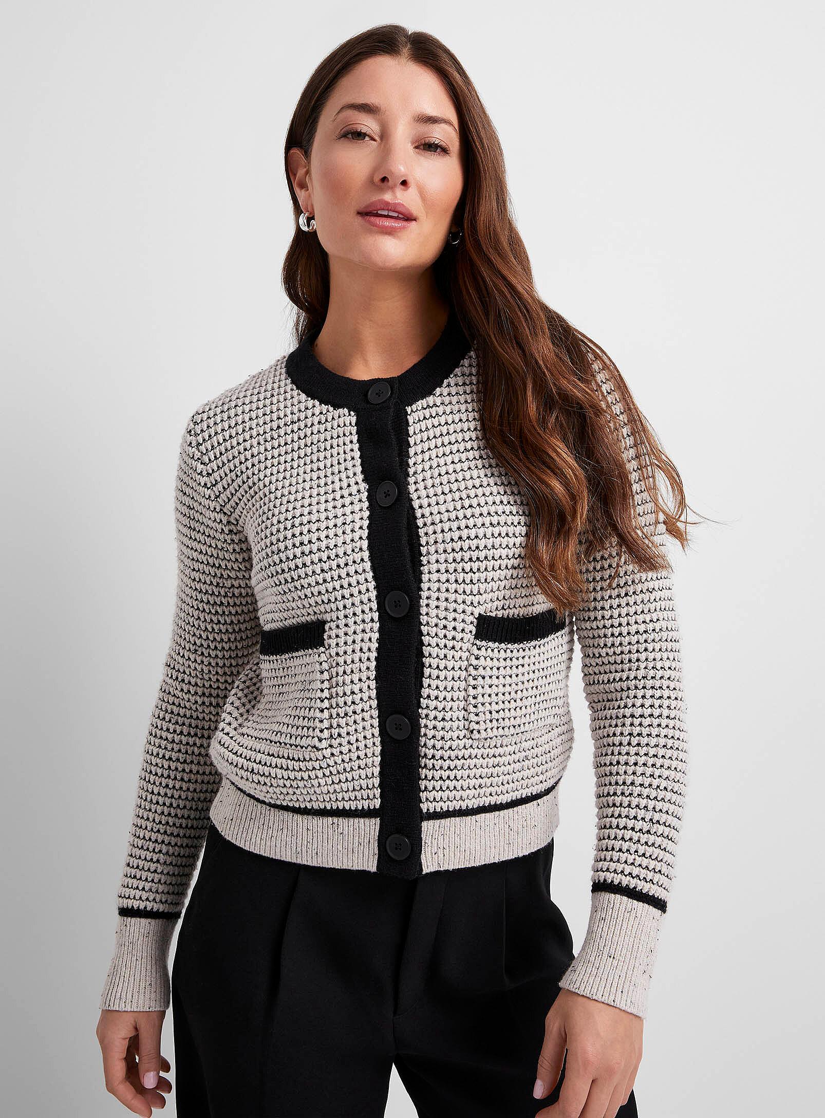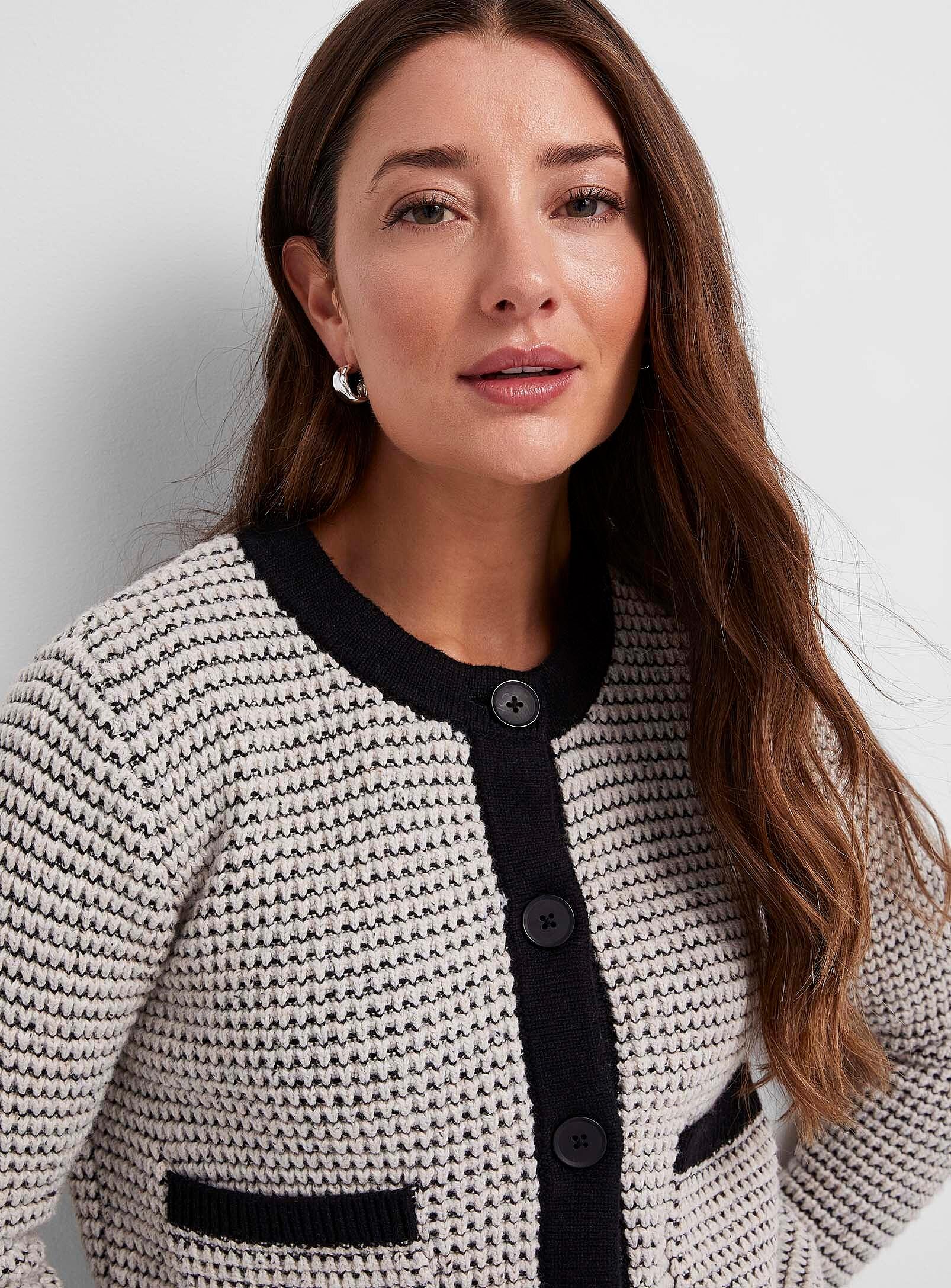 Women > Sweatersbr>InWear - Contrasting edging textured cardigan InWearbr>ul>li>InWear, a Danish brand at Contemporaine/li>li>Thick knit in a cotton and viscose blend with a touch of wool/li>li>Boxy fit with crew neck and long sleeves/li>li>Buttons down the front/li>li>Patch front pockets/li>li>Speckled ribbed edging/li>/ul>br>br>The size of the item pictured is small