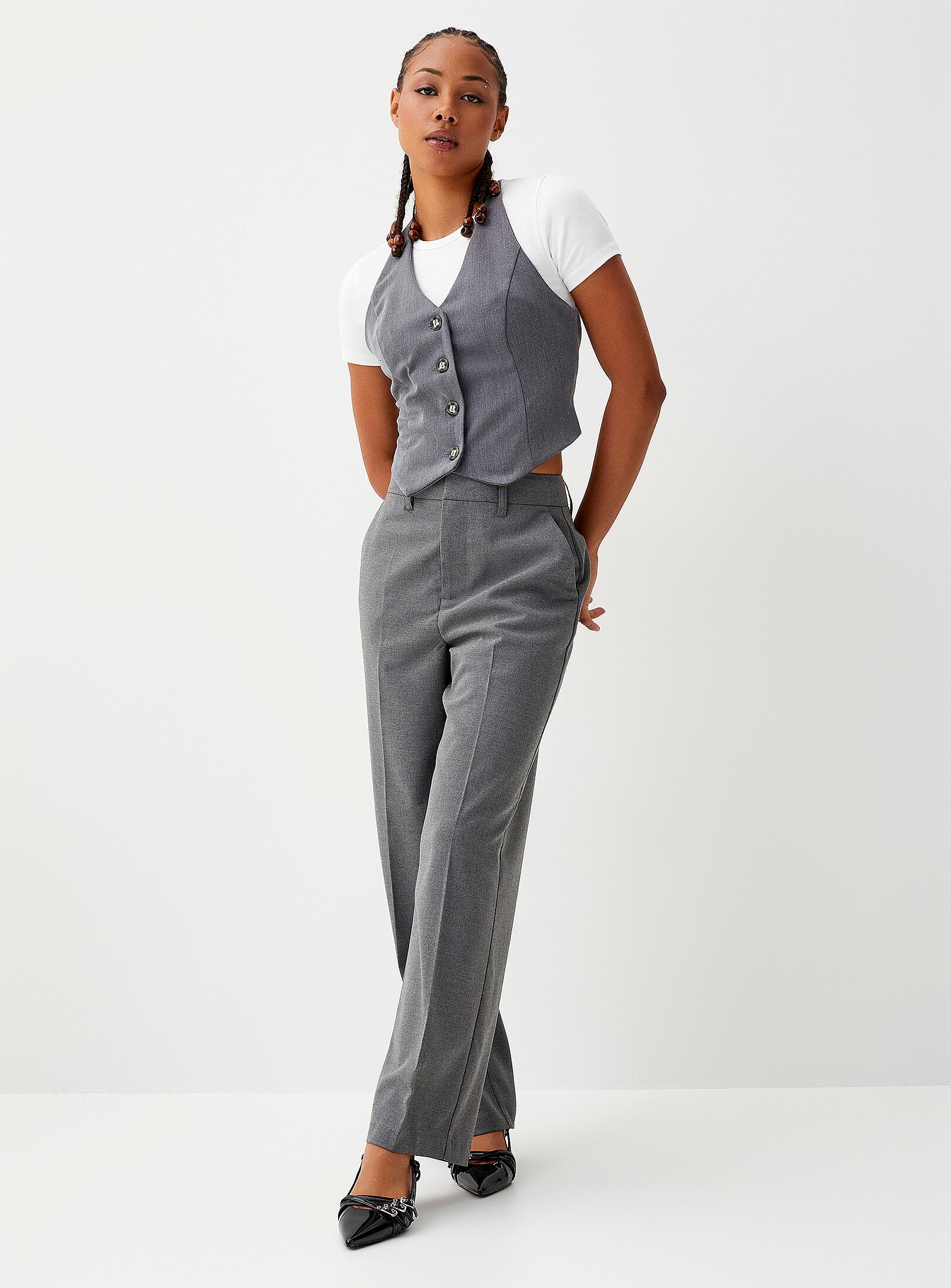 Twik - High-rise straight-leg dress pant Twik Twik by Simons: an exclusive designed in Canada Supple and stretch fabric in a recycled polyester blend Slit pockets at the front and trompe-l'oeil piped pockets at the back Rise: 11.5" (30 cm) Inseam length: 28.5" (72.5 cm) The size of the item pictured is small