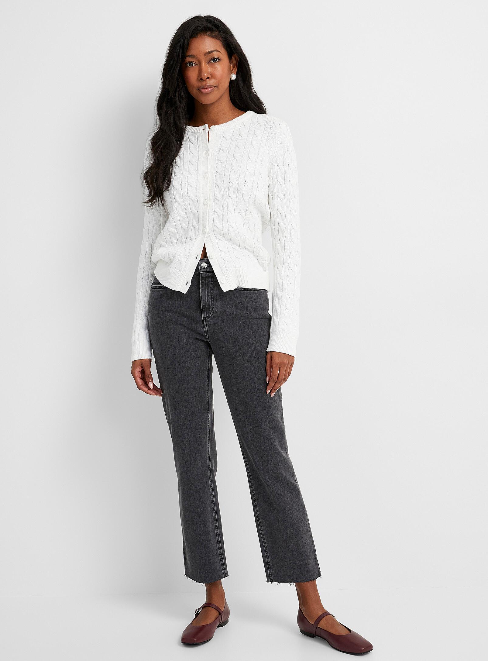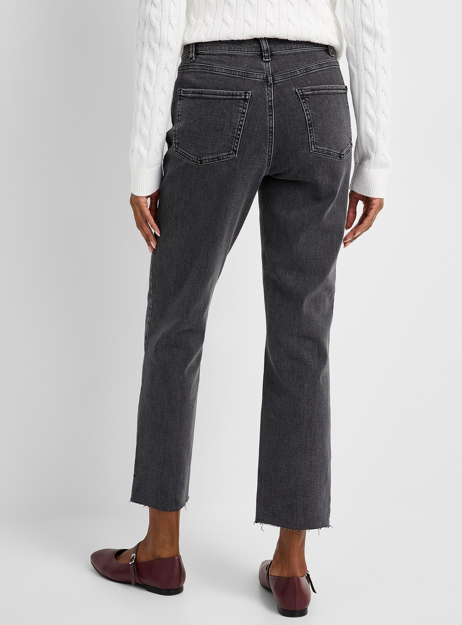 Women > Jeansbr>Contemporaine - Frayed-hem grey jean Fit: Straight leg, high rise Contemporainebr>b>Contemporaine by Simons: an exclusive designed in Canada/b>br>br>b>Fit/b>ul>li>Straight leg/li>li>High rise/li>/ul>br>b>Fabric/b>ul>li>Stretch denim in a blend of regenerative and reprocessed cotton/li>li>EIM© score*: 21 (low impact)/li>li>Medium-grey wash/li>/ul>br>b>Details/b>ul>li>5-pocket design/li>li>Tonal seams/li>li>Frayed trim/li>/ul>br>*The EIM© score measures the environmental impact of its treatment and denim wash processes. A score between 0 and 33 is considered to be low impact.br>br>The size of the item pictured is 28