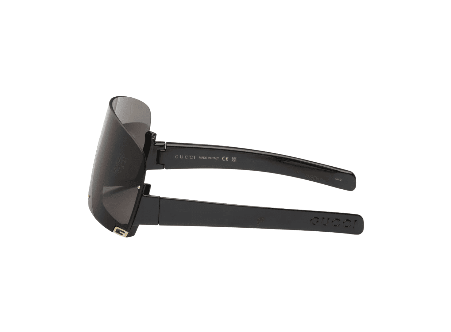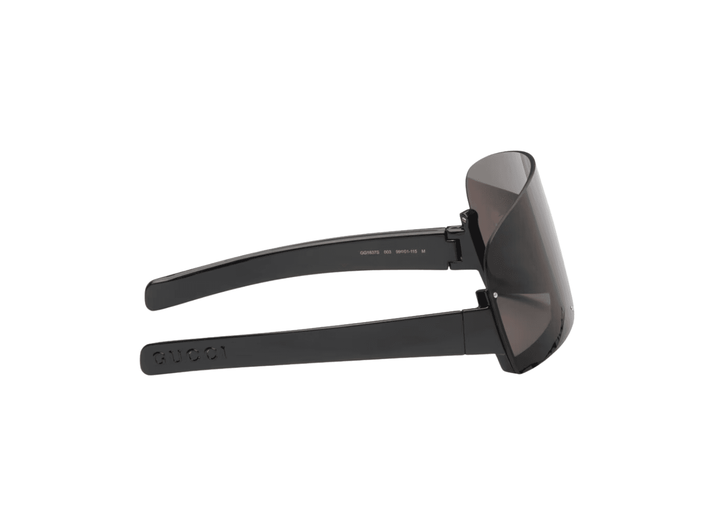 Shield-style semi-rimless polymer-frame sunglasses in black. · Logo etched at gray lens · 100% UVA/UVB protection · Integrated nose pads · Logo hardware at face · Logo embossed at temple tips · Includes case · Size: 99.1 115