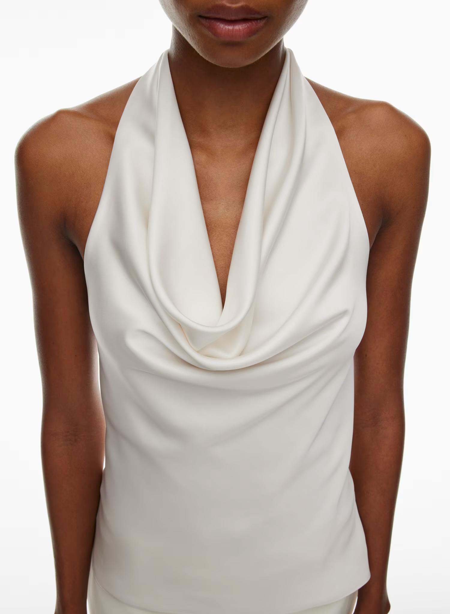 This is a cowlneck halter top. It's cut from drapey satin with a lustrous, glossy sheen that’s extremely soft to the touch. This fabric is made with Naia™ Renew — luxurious fibre made with recycled materials and wood pulp sourced from responsibly managed forests and produced through an environmentally low-impact process that reduces carbon and water footprint, while also helping divert waste from landfills.