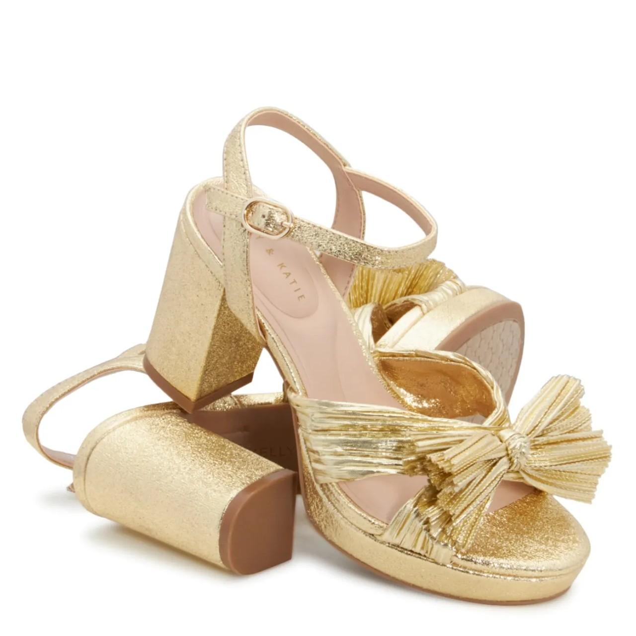 Show off your graceful look with these women's Kelly & Katie Heather gold evening sandals. Designed with a fabric upper, adjustable buckle strap closure, round open toe, synthetic lining, lightly cushioned footbed, platform and block heel and a synthetic sole. This style is exclusive to Designer Brands Canada.