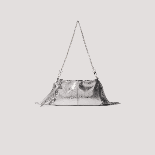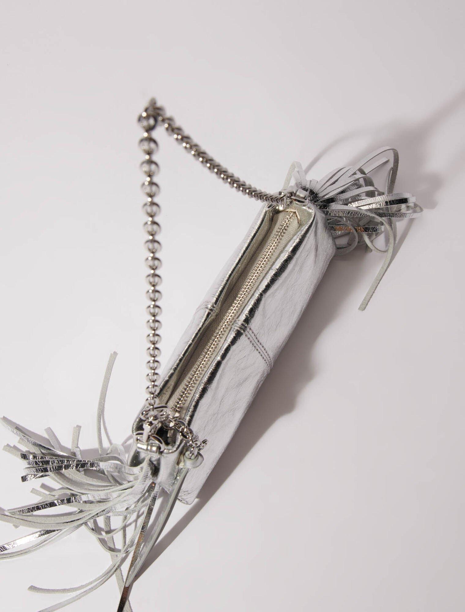 The signature Miss M bag is now available in a chic and practical clutch version.Crafted in metallic crackled leather, it features a detachable silver chain handle so it can be hand-held or carried over the shoulder, with Maje's signature fringing on the sides.A leather pull tab trimmed with a clover tassel opens the zipped fastening, so you can slip in all your essentials. Metallic crackled leather clutch bag with fringes Removable chain for carrying over the shoulder Zip fastening Fringes Dimensions: 22 x 11 x 5 cm