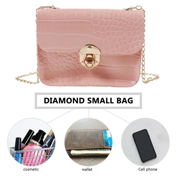 Women Mini Cross Body Diamond Pattern PU Leather Small Square Shoulder Bags Casual Chain Satchel Bag (Pink)