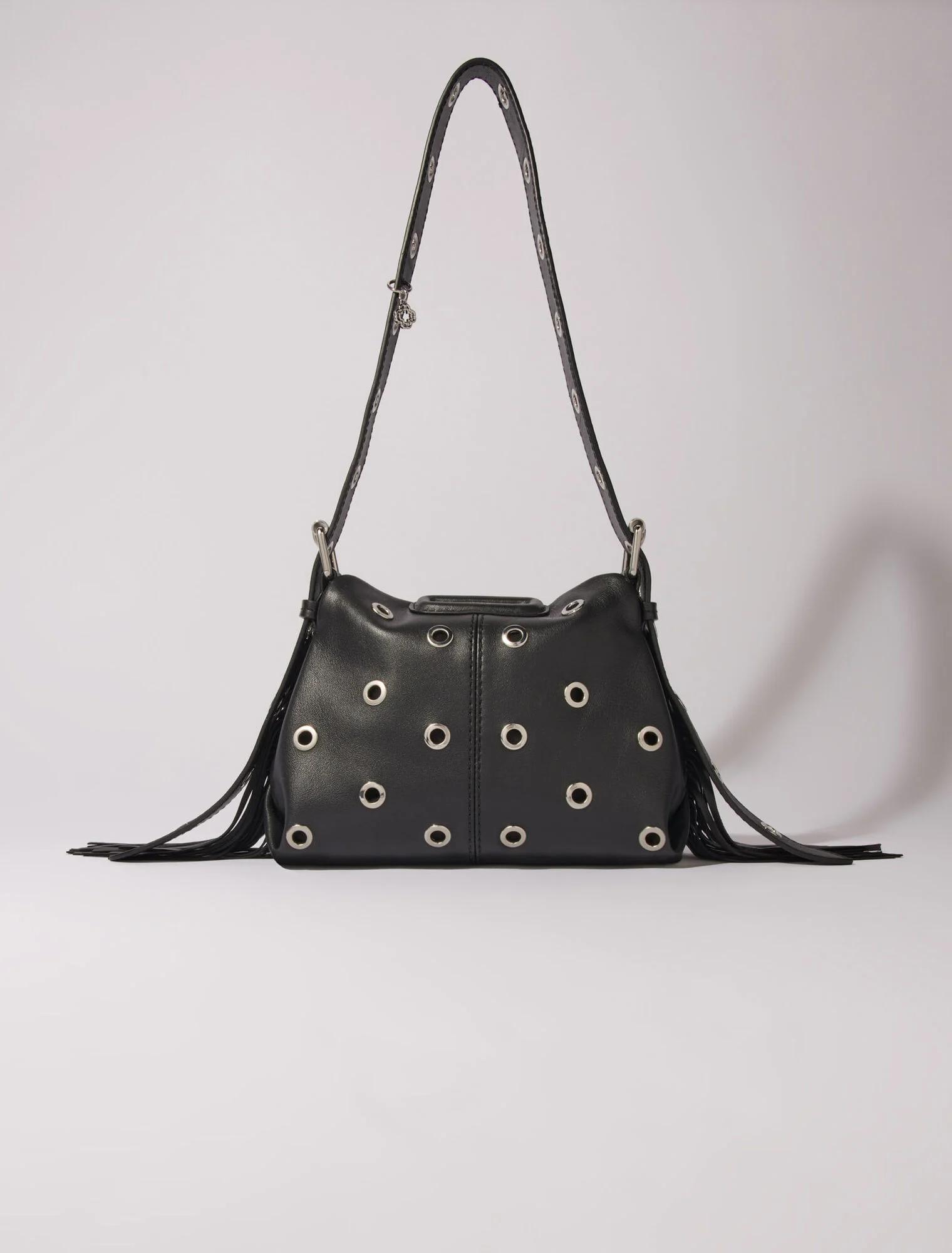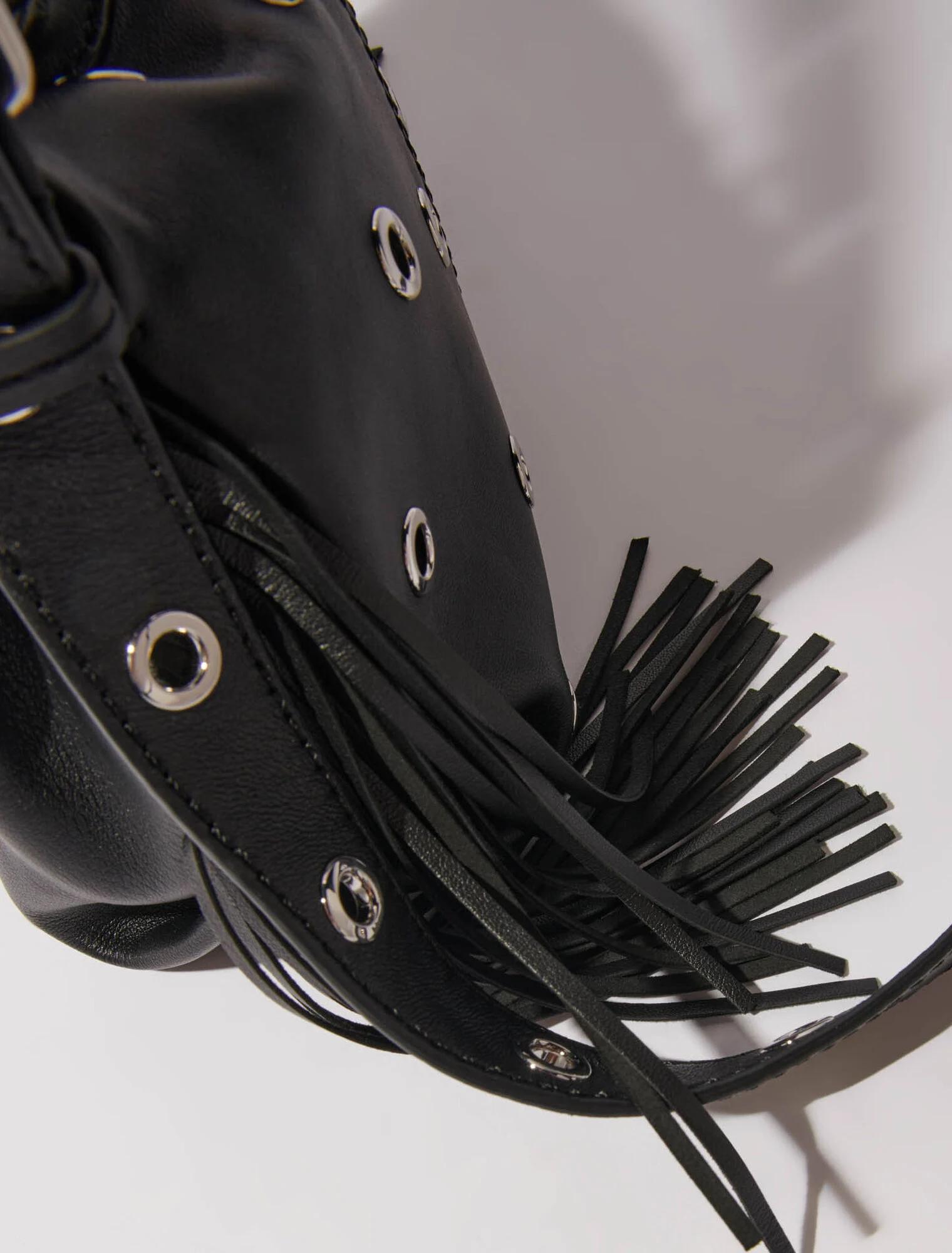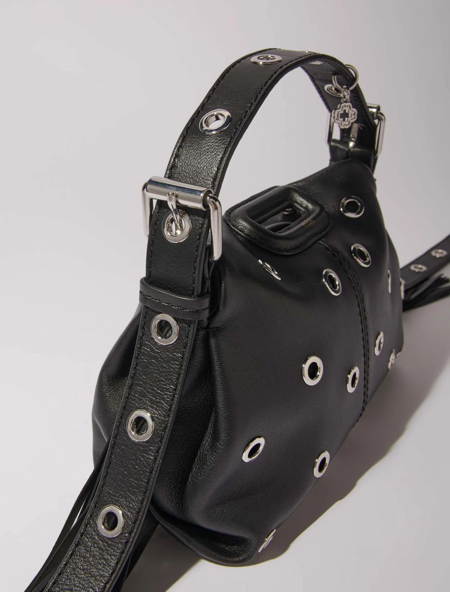 Maje's latest fashion statement is the Miss M, available this season in plain leather accentuated with eyelets. Judith Milgrom has designed the it bag of a generation with all the hallmarks of the classic M bag — rectangular leather handles, fringing and detailed topstitching. It has the cool Maje look and is designed to be the ultimate versatile accessory, coming in two sizes and a variety of fabrics and colours. Thanks to the long and adjustable strap, adorned with eyelets, you can create a variety of styles! Carry it by hand for a casual look, short or longer on your shoulder for a classic touch, or wear it crossbody for a stylish metropolitan vibe. The Miss M is set off by details that make all the difference: large, bold buckles at either end of the handles and a discreet piercing.