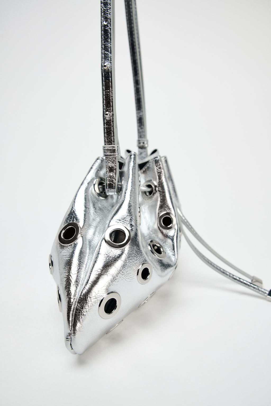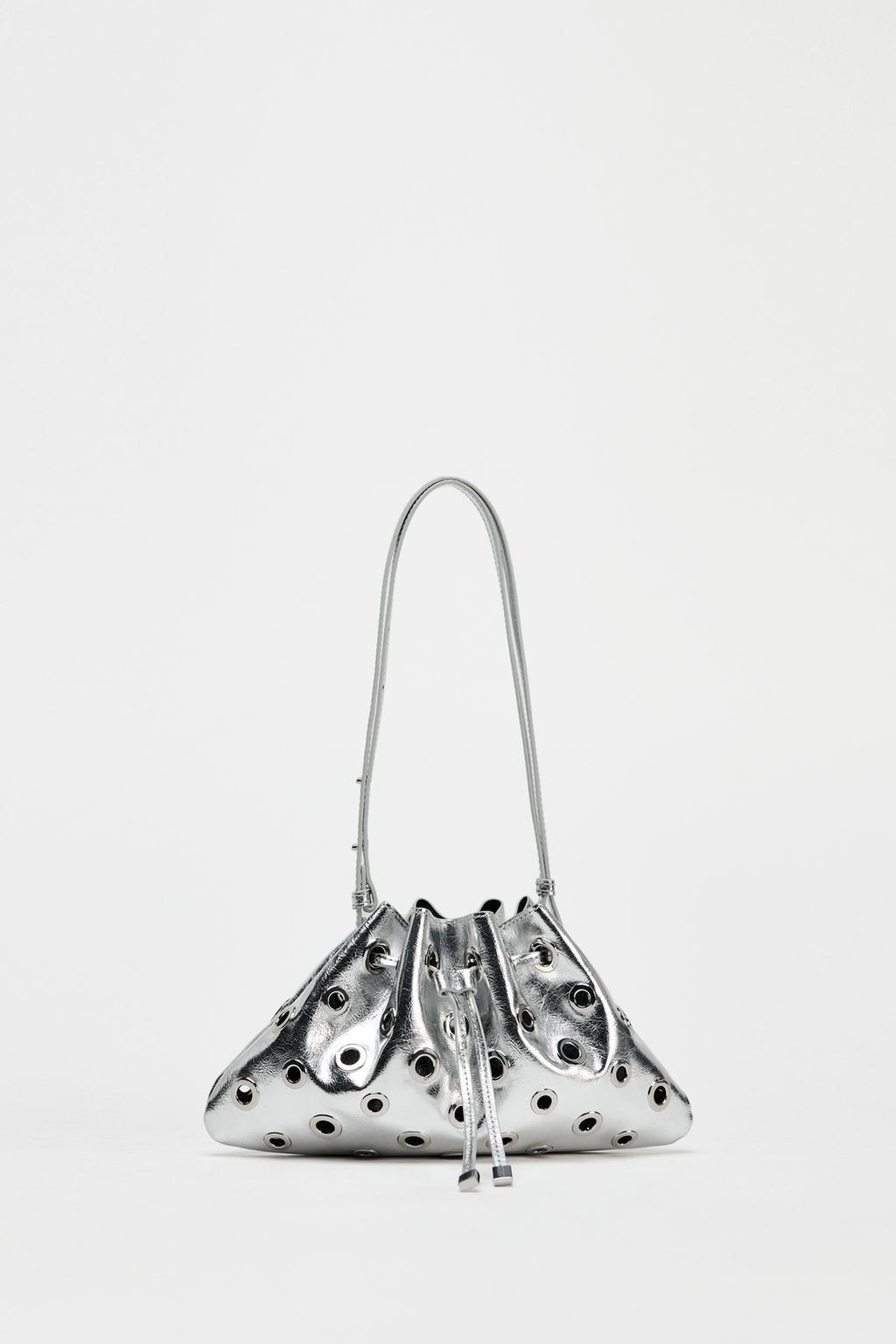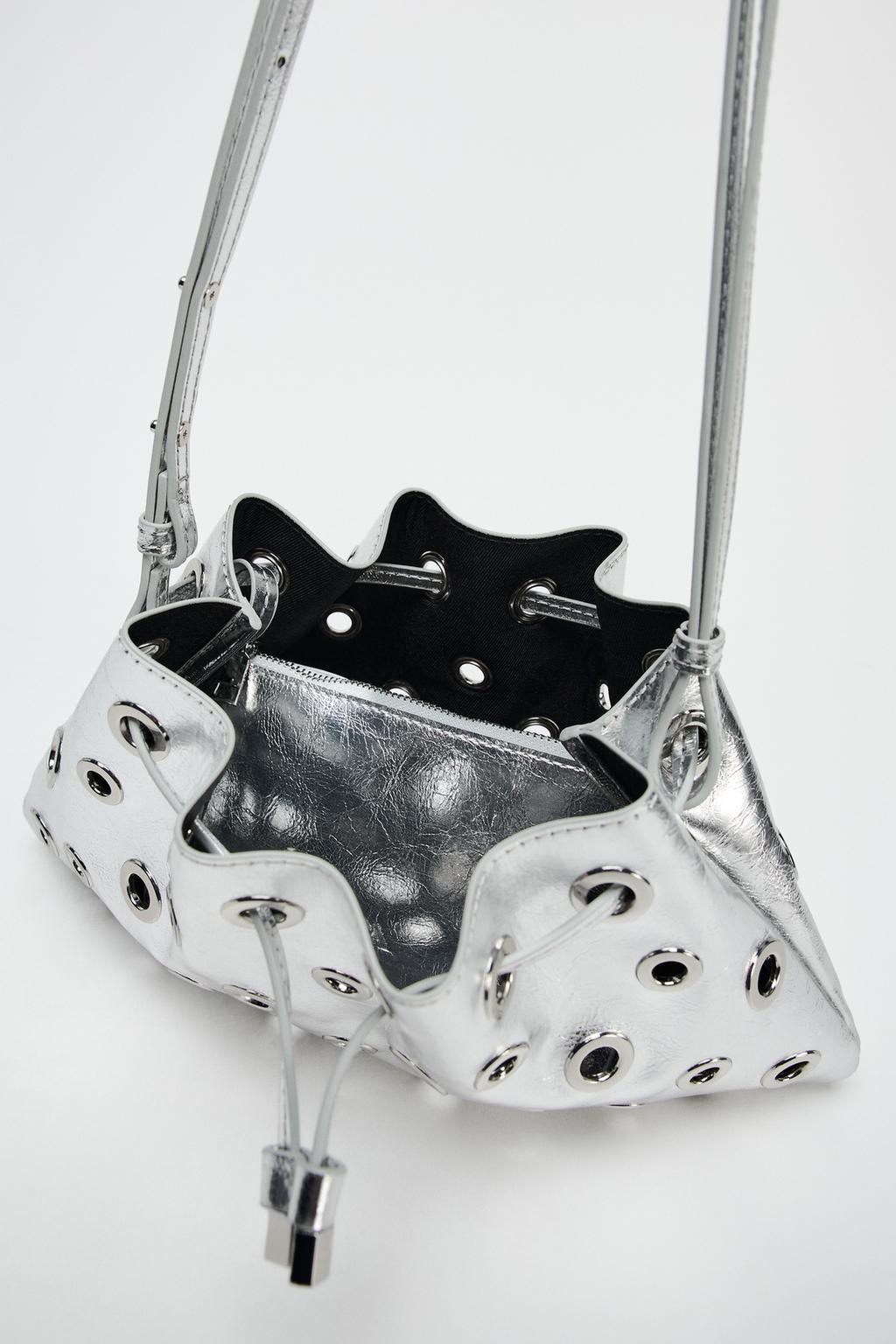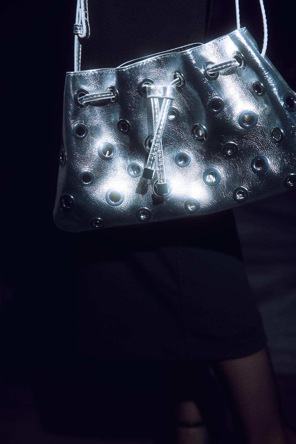 Tonal crystal embellished exterior with satin lining Imported Drawstring toggle closure One main compartment Detachable chain shoulder strap Measures approx 8" / 20 cm W x 11" / 28 cm H x 4" / 10 cm D Shoulder strap with a 22" / 56 cm drop Revolve Style No. OLGR-WY201 Manufacturer Style No. OB2166_BLK