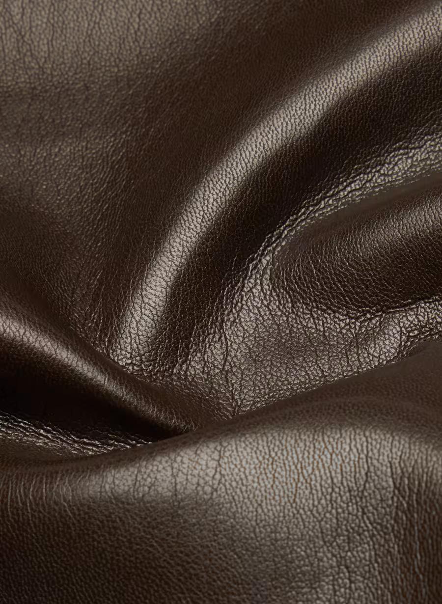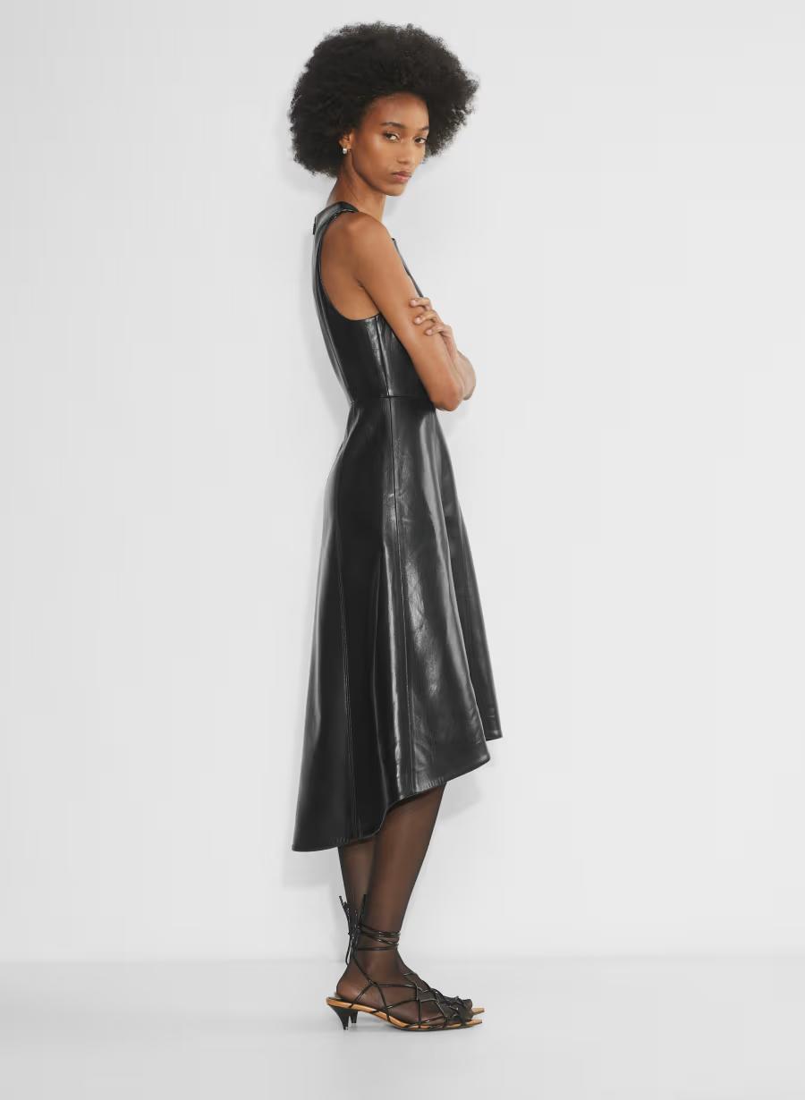 This is a fit-and-flare dress with a high-low hem and princess seams for shaping. It's made with UnReal Leather — our timeless, innovative fabric with an authentic drape and soft sheen. Looks and feels so real, it’s kind of unreal.