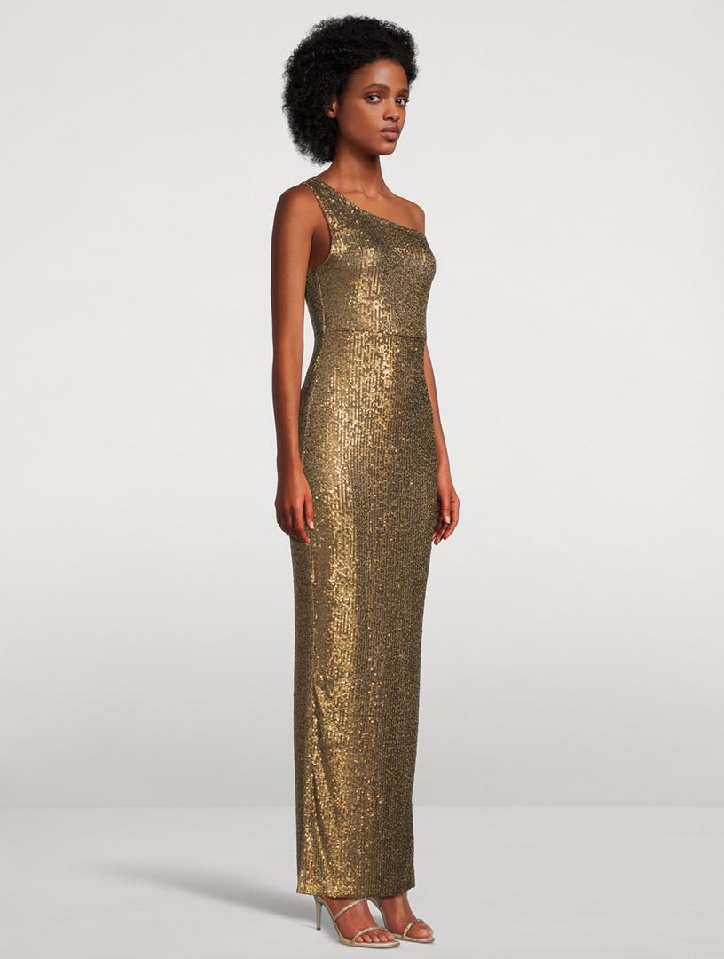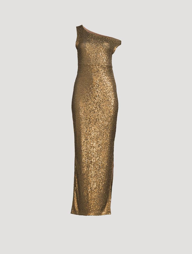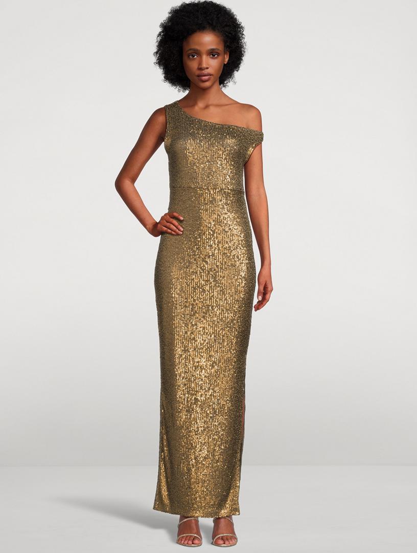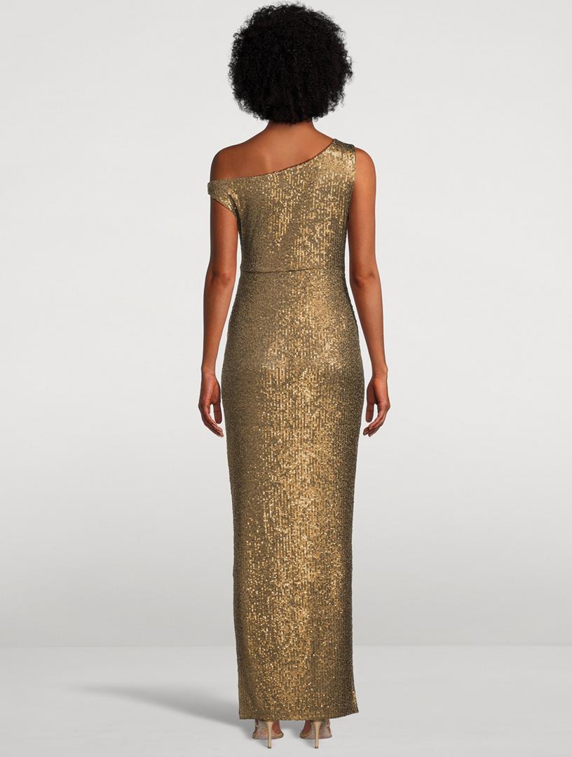 Exuding a glamorous elegance, this floor-grazing gown is crafted from a four-way stretch fabric with a shimmering metallic finish, so it both comfortable an chic. It has an asymmetric neckline designed to fall off the shoulder.