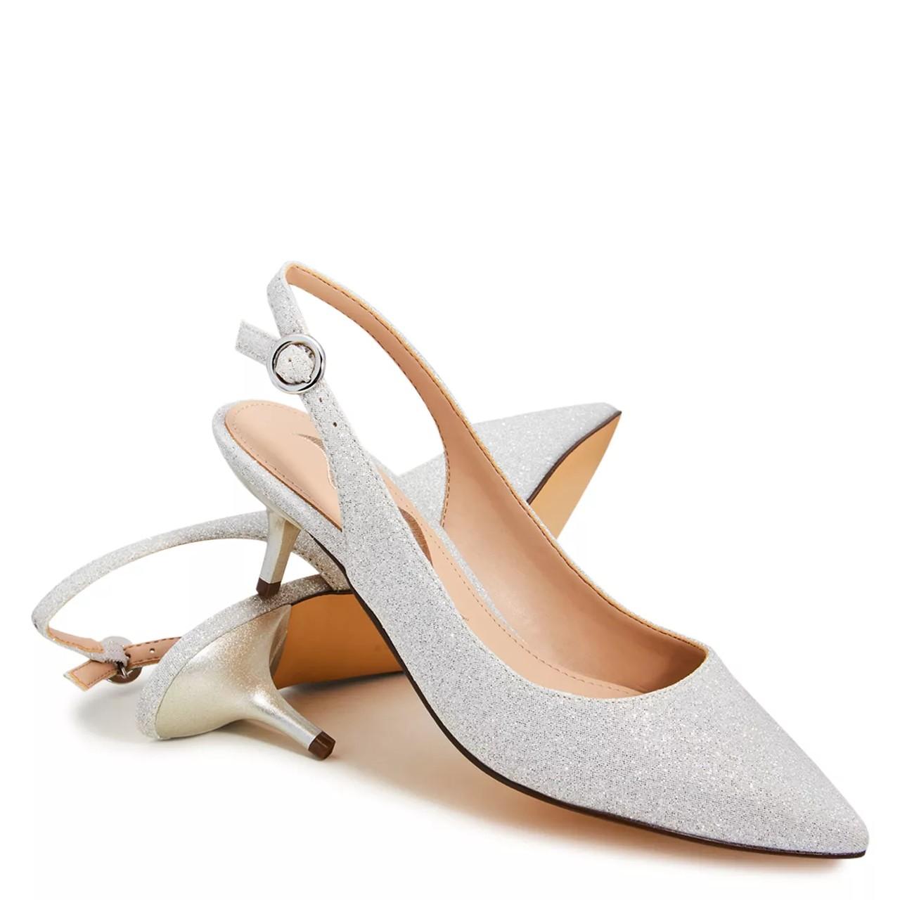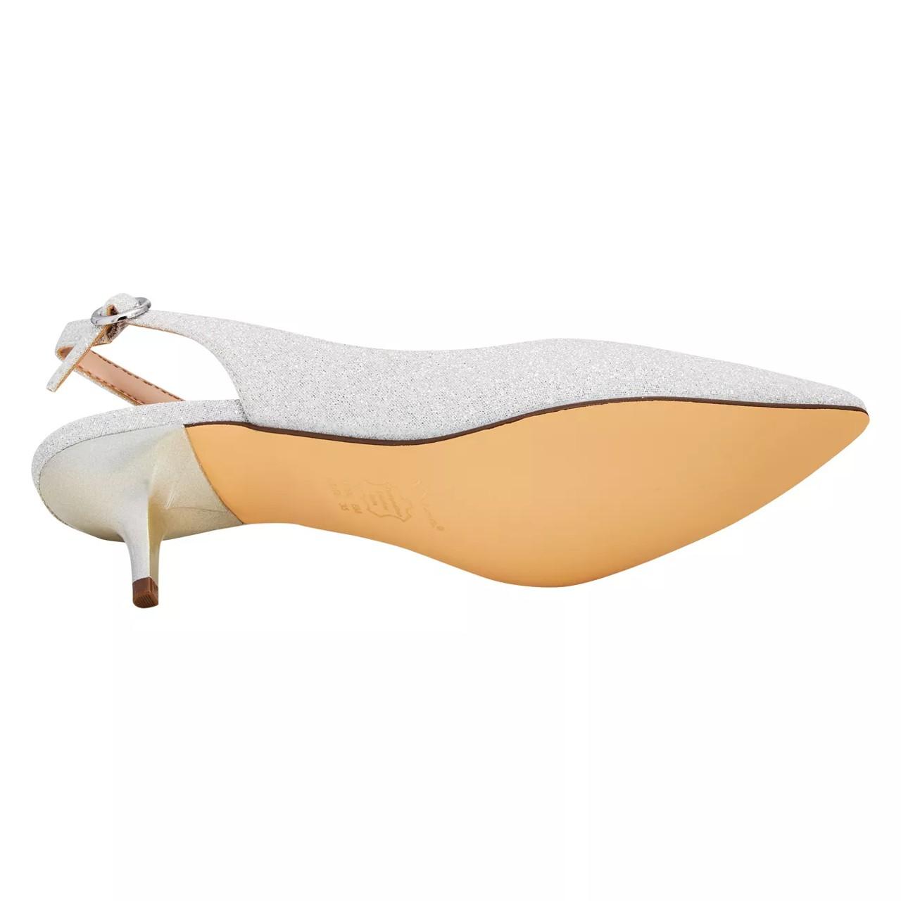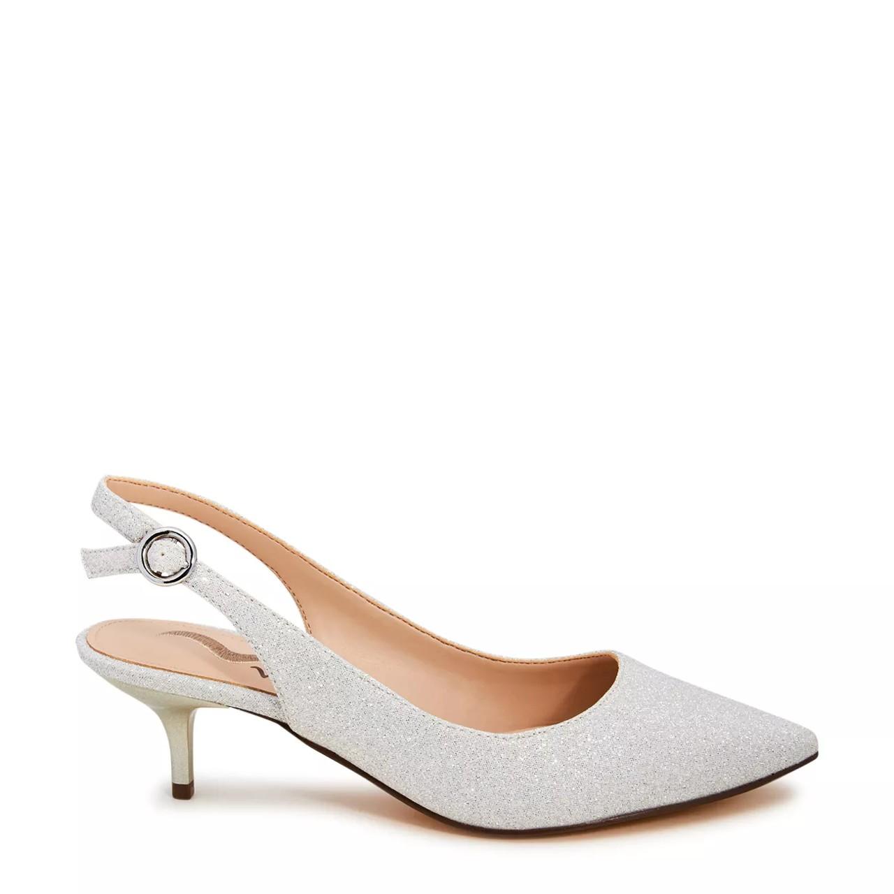 Exude a contemporary style with these women's N By Nina Sally silver slingback pumps. Glitter detailed synthetic upper with chic pointed toe defines these evening shoes that come with slingback strap with buckle closure for a precise fit, lightly cushioned footbed for comfort, and composition leather sole for lasting use. Self-covered kitten heel elevates the elegance.
