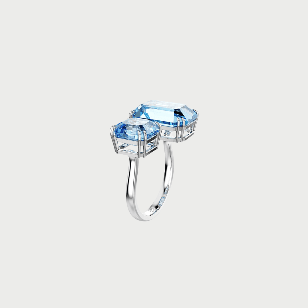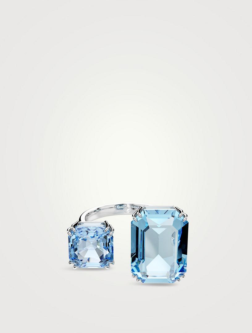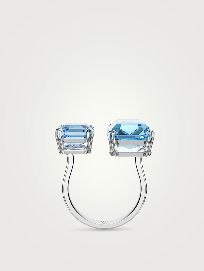 The open design of this cocktail ring is rhodium plated and features octagon- and square-cut crystals in blue. The subtle contrast in tones makes this a captivating choice. Rhodium Plated, Swarovski Crystal Imported