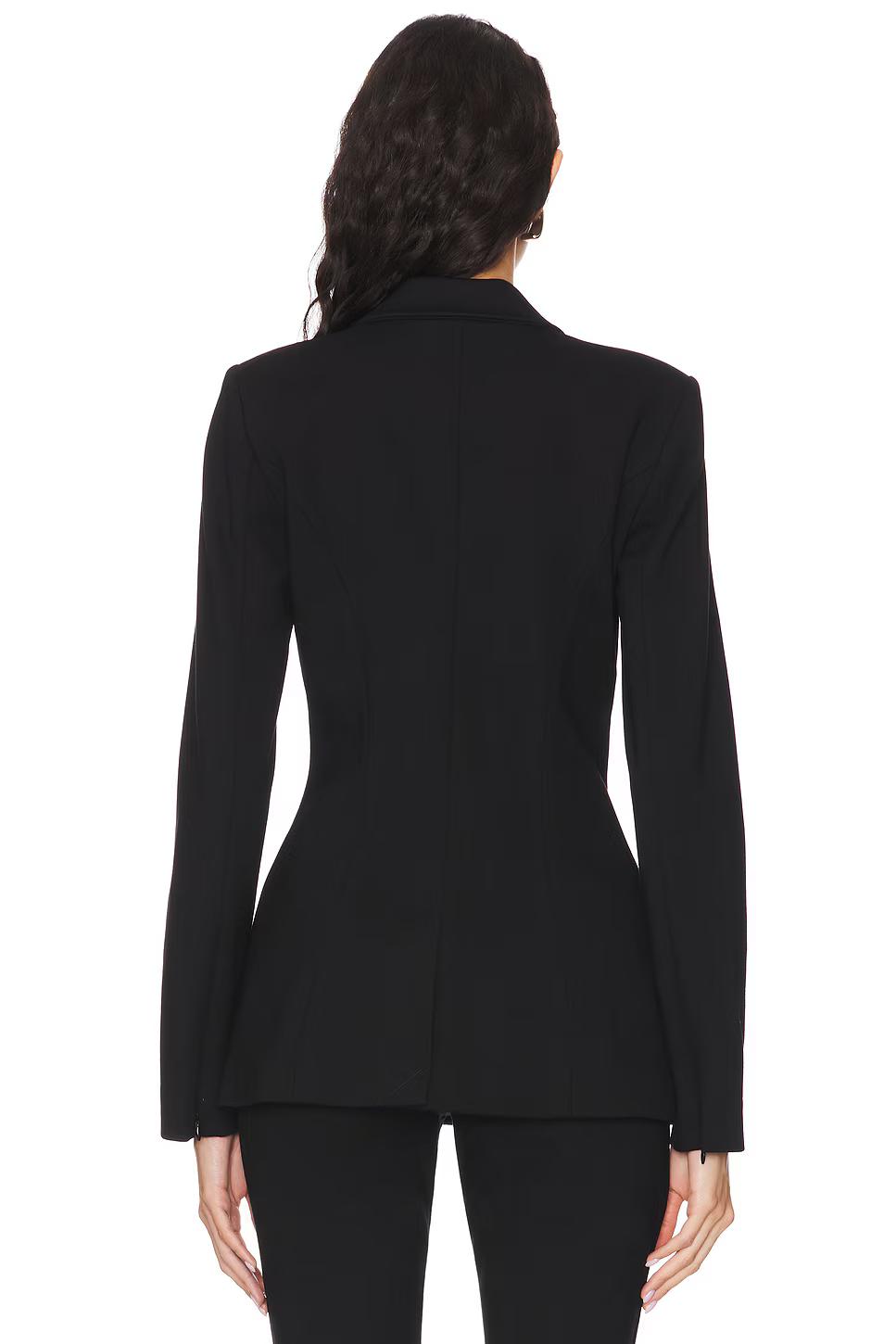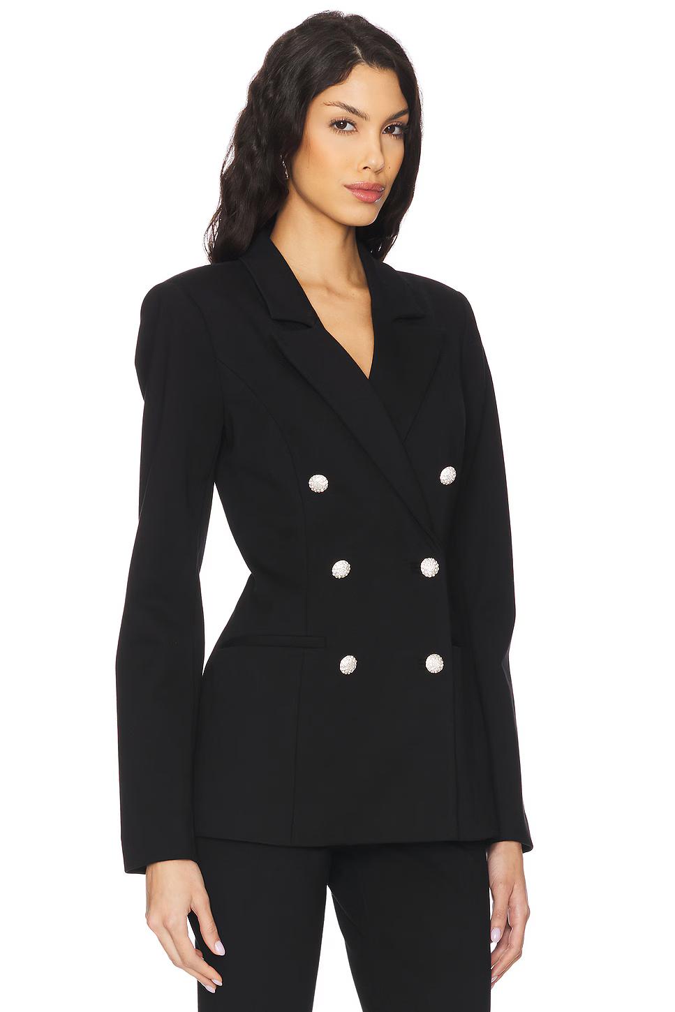 Self: 68% rayon, 27% nylon, 5% elastane Lining: 80% nylon, 20% elastane Made in Vietnam Hand wash cold Double-breasted front button closure Front welt pockets Back vent Rhinestone-embellished buttons Padded shoulders