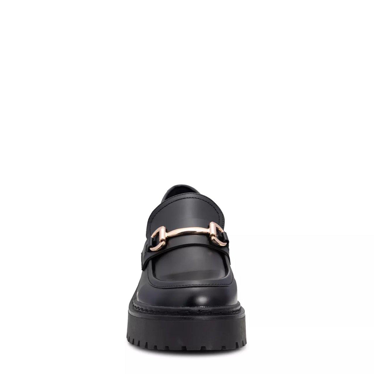 A sturdy block heel perfectly lofts these sleek and minimalistic women's Steve Madden Approach black Loafer that feature contrast horse bit hardware for a bold look. These casual slip-ons have synthetic upper and lining and traction sole for added stability. These lug sole loafers are a perfect match for you.
