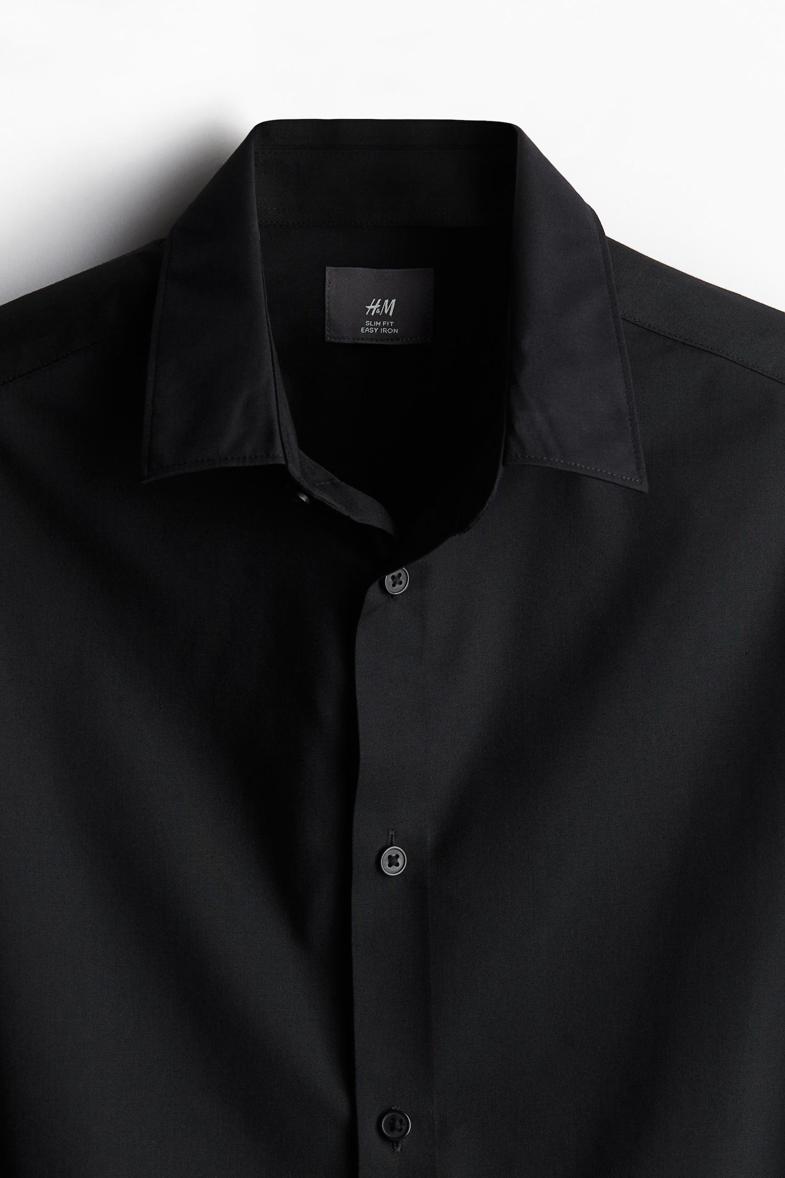 Slim-fit, easy-iron shirt in woven fabric with a fitted silhouette. Turn-down collar, classic button placket, and a yoke at back. Long sleeves, sleeve placket with link button, and adjustable cuffs with buttons. Gently rounded hem.