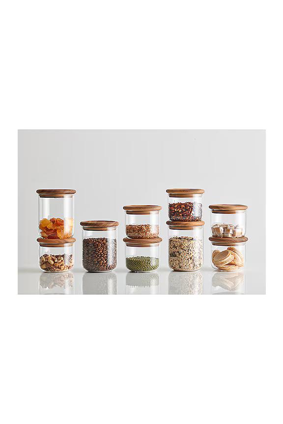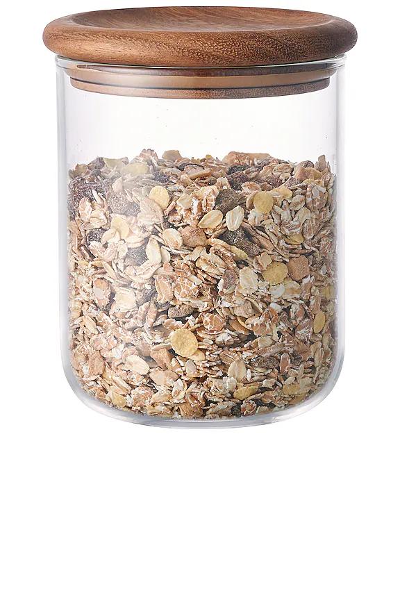 Baum is a heat-resistant glass canister with a wooden lid made of acacia. The gently curving form is comfortable to hold, and the lid is designed so that canisters stack stably. It comes with a silicone ring for tight sealing and is ideal for storing dried foods. Made in China