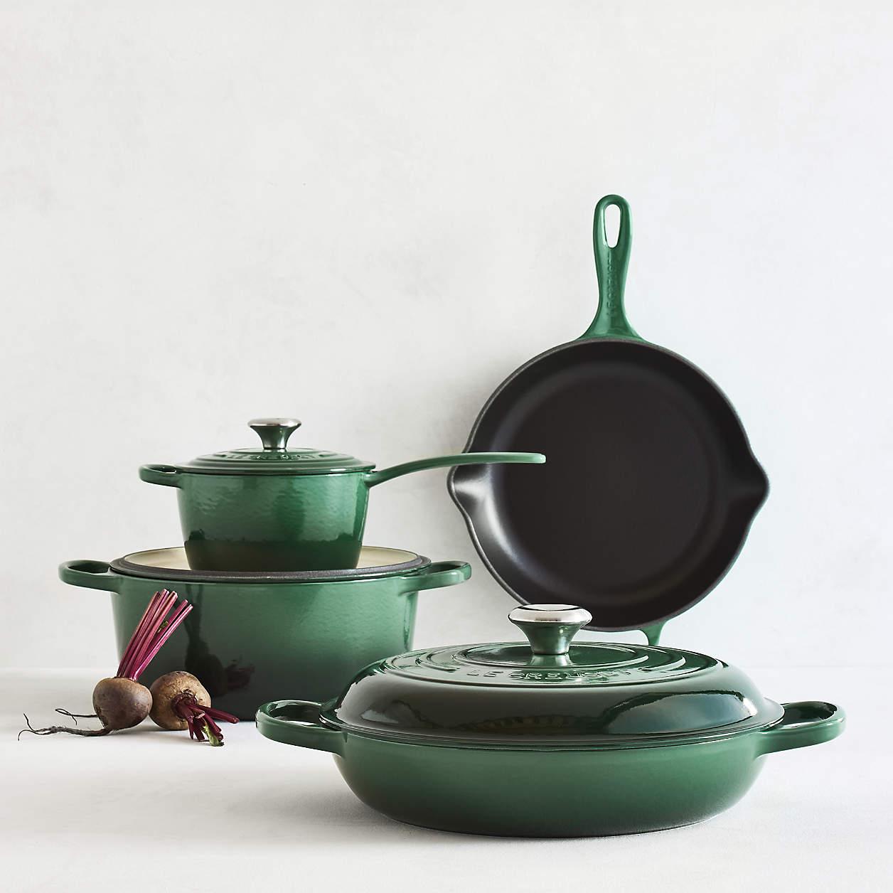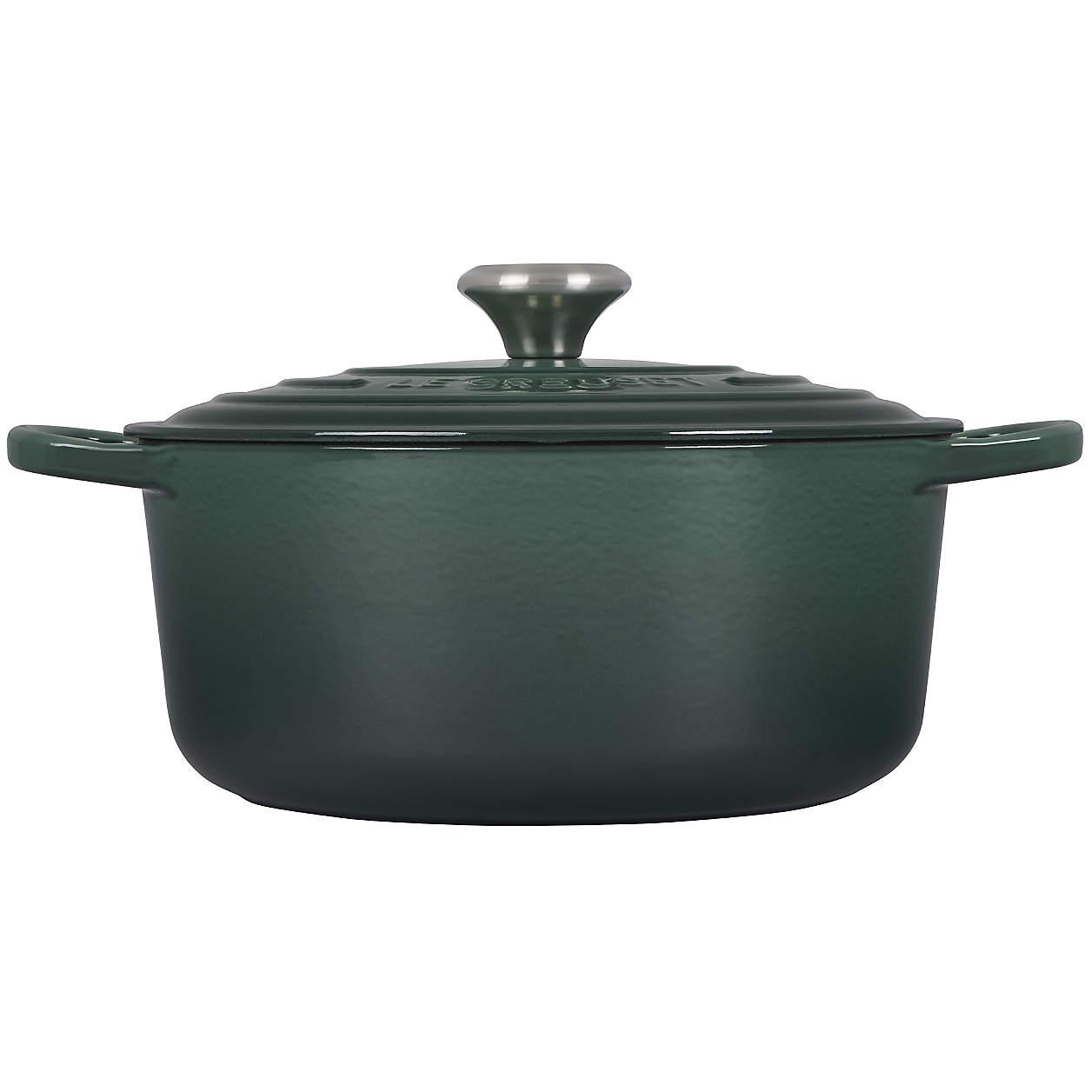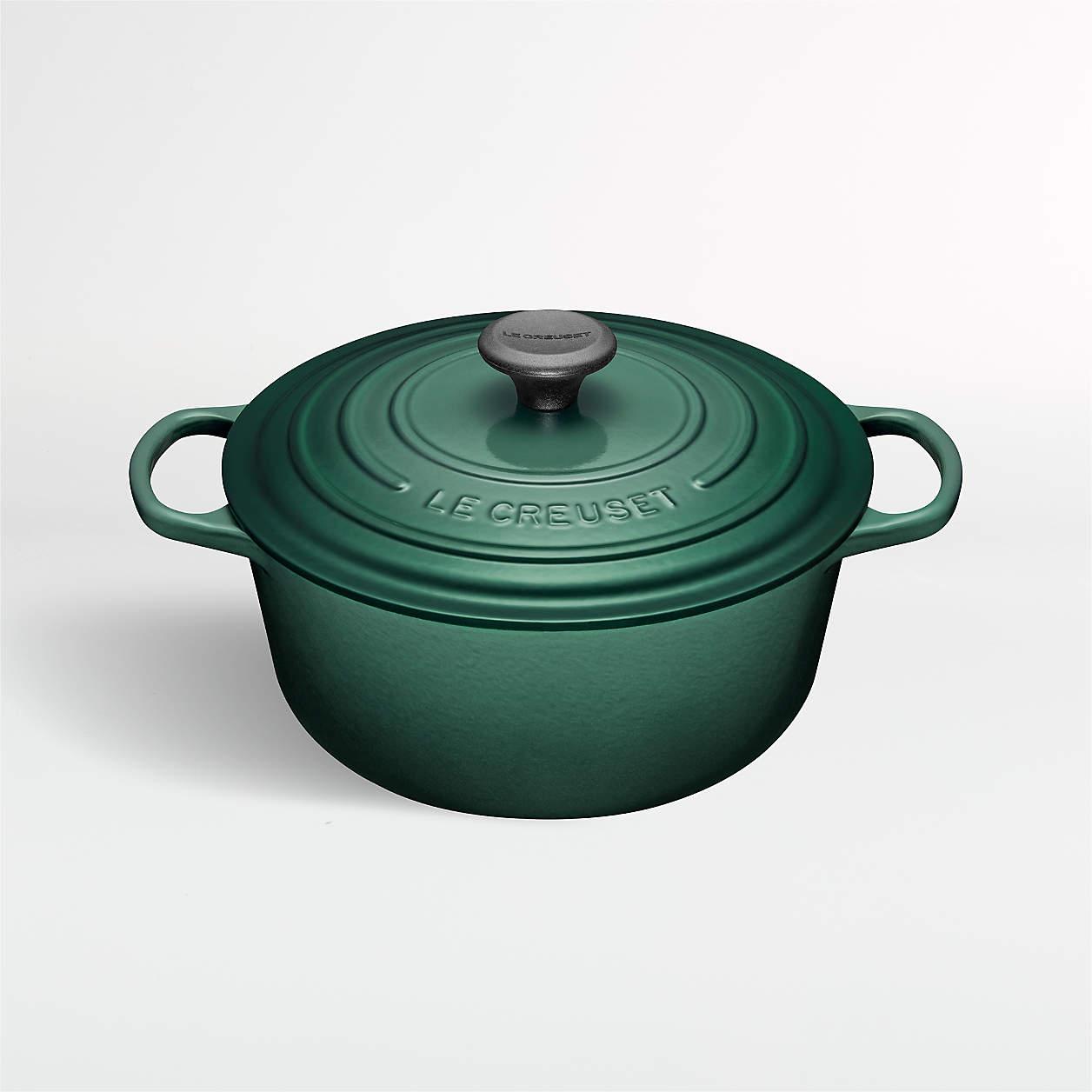 Enameled in artichoke-inspired deep green ombre, this cast iron Dutch oven is indispensable for slow-cooking, braising, searing, roasting or baking. Maintaining even and consistent heat, the pot has a smooth interior that promotes caramelization, resists stains and prevents sticking for easy cleanup. Sized to cook up five to six servings, the Dutch oven is ideal for family dinners or potlucks. Use it for whatever's on the menu, be it mushroom risotto, sourdough bread or roast chicken.
