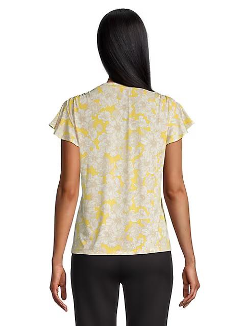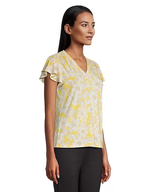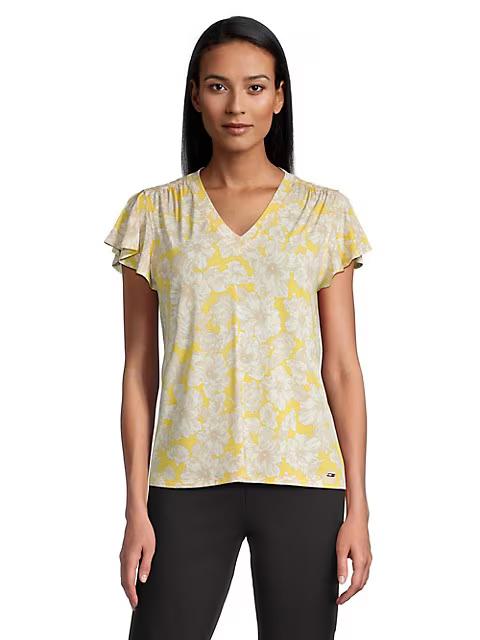A rich print, fluttery sleeves and flattering smocked shoulders elevates the profile of this lightweight tee. V-neck Smocked shoulders Short flutter sleeves Pullover Main: 60% recycled polyester 35% polyester 5% spandex Machine wash cold, gentle cycle, Dry flat. Imported