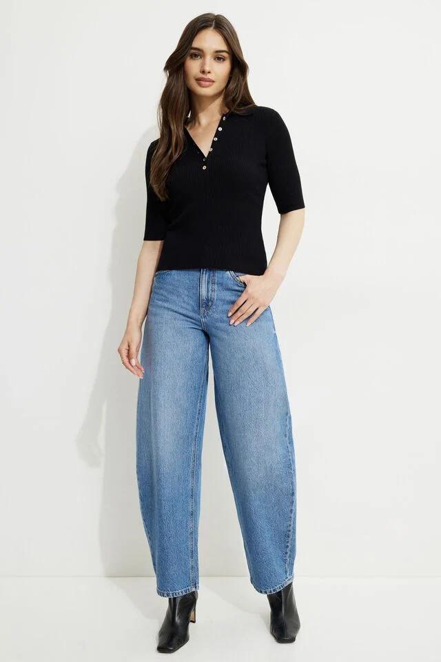 This rib knit polo is designed to have a fitted silhouette. Features Spread collar Mother-of-pearl button placket Quarter sleeves Size & Fit Fitted Model is wearing size XS Materials & Care 70% viscose, 30% nylon Hand wash, cold Imported