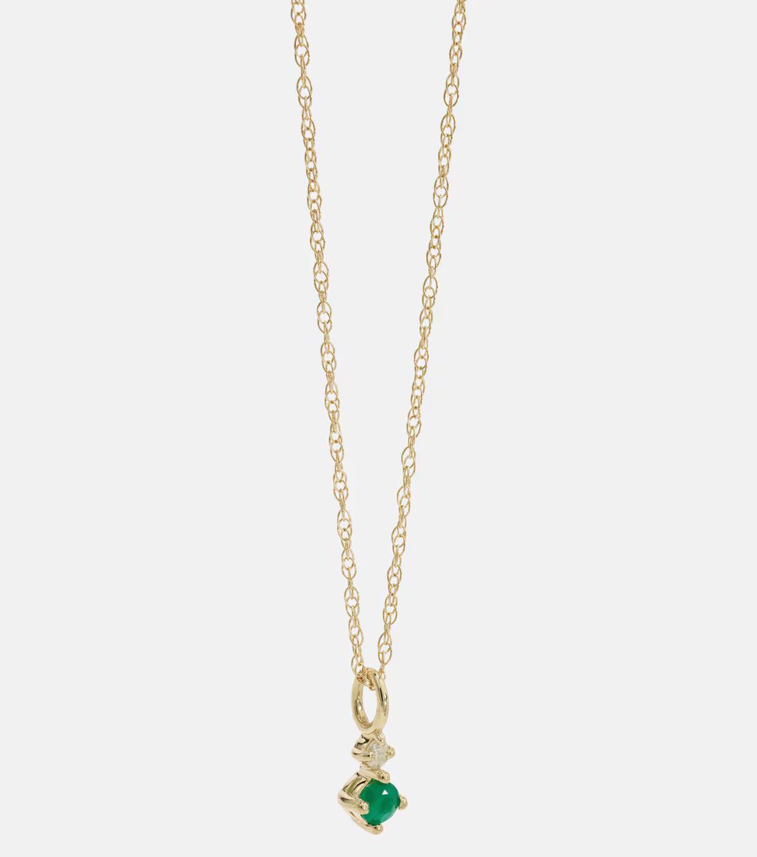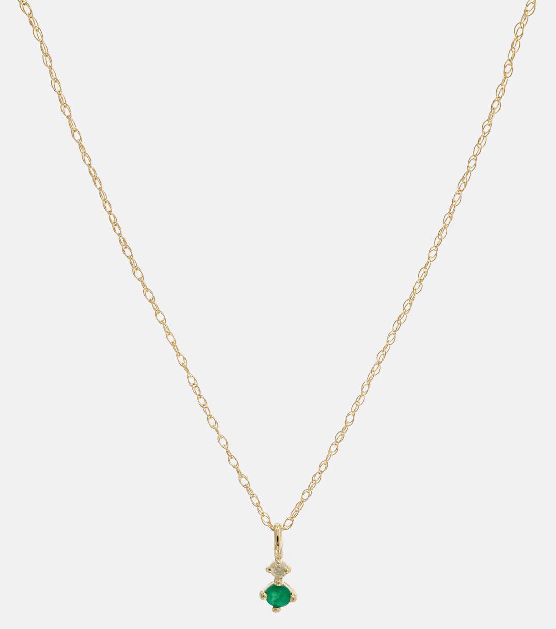 Material: 14kt yellow gold Made in the USA Stone I: emerald, round-cut, prong setting Stone I carat weight (ct): 0.11 Stone II: diamond, round-cut, prong setting