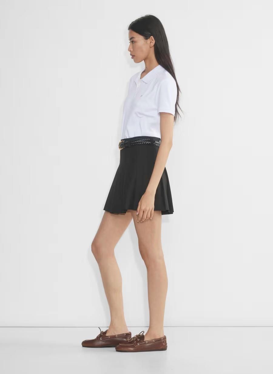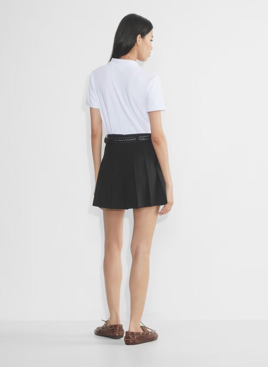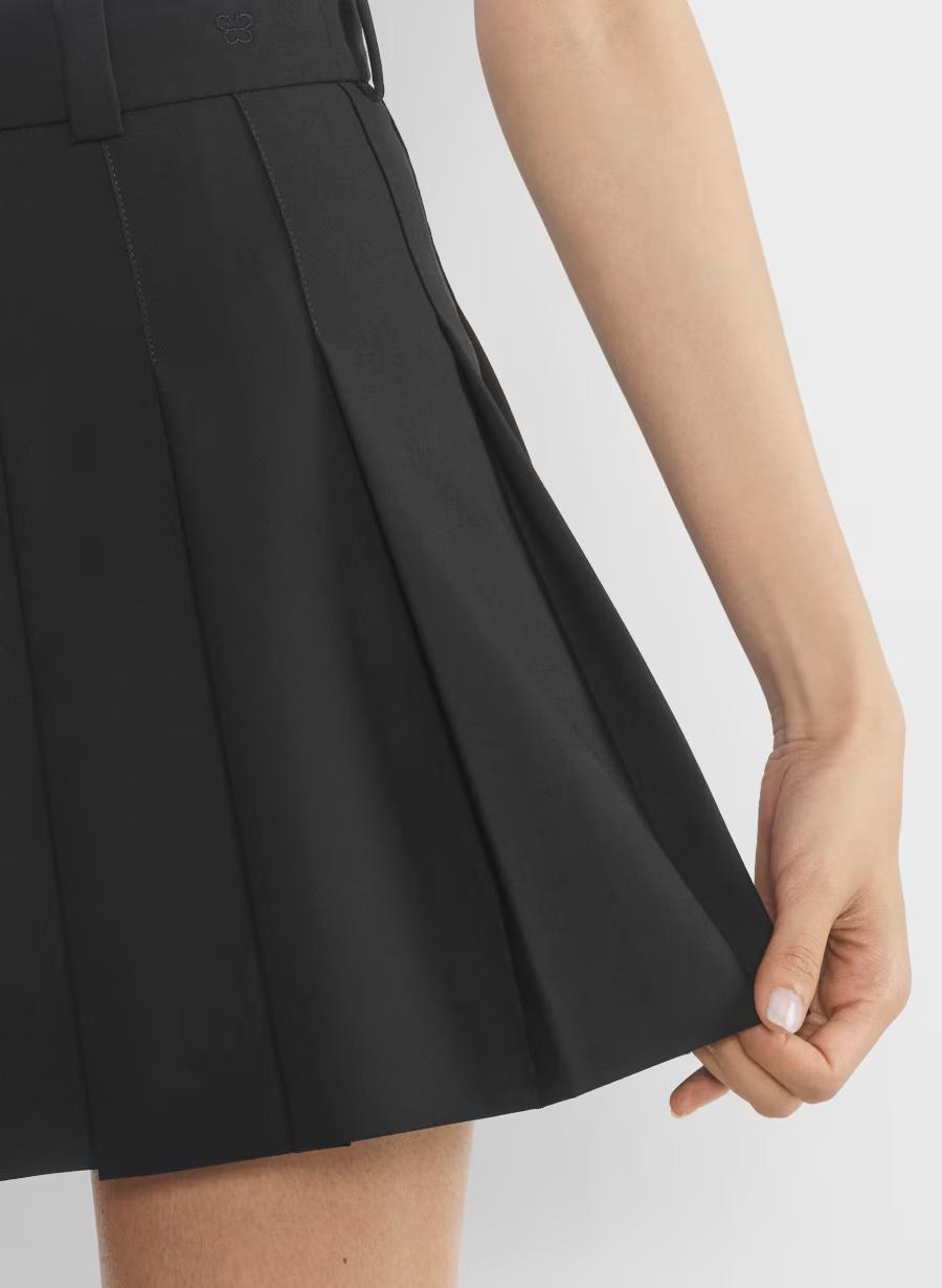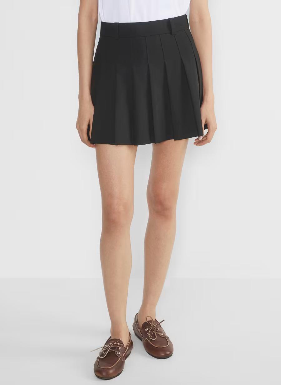 This is a high-rise pleated mini skirt with an invisible zip at the back. It’s cut from smooth, softly structured fabric made with recycled polyester and LENZING™ ECOVERO™ Viscose — material derived from controlled or certified wood sources and made with at least 50% less carbon emissions and water consumption than generic viscose.