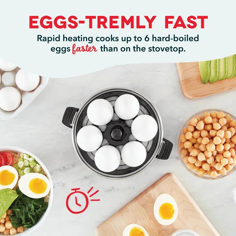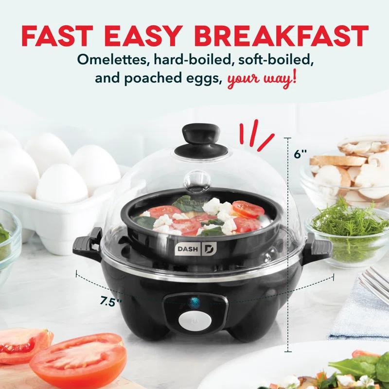 The Dash Rapid 6-Egg Cooker takes the hassle out of cooking eggs. Makeup to six soft, medium, and hard-boiled eggs in 12 minutes or less in a BPA-free egg tray. Poach up to 2 eggs with a separate, non-stick poaching tray. A bell sounds when cooking is complete. From boiled to poached, this compact countertop egg cooker does it all.