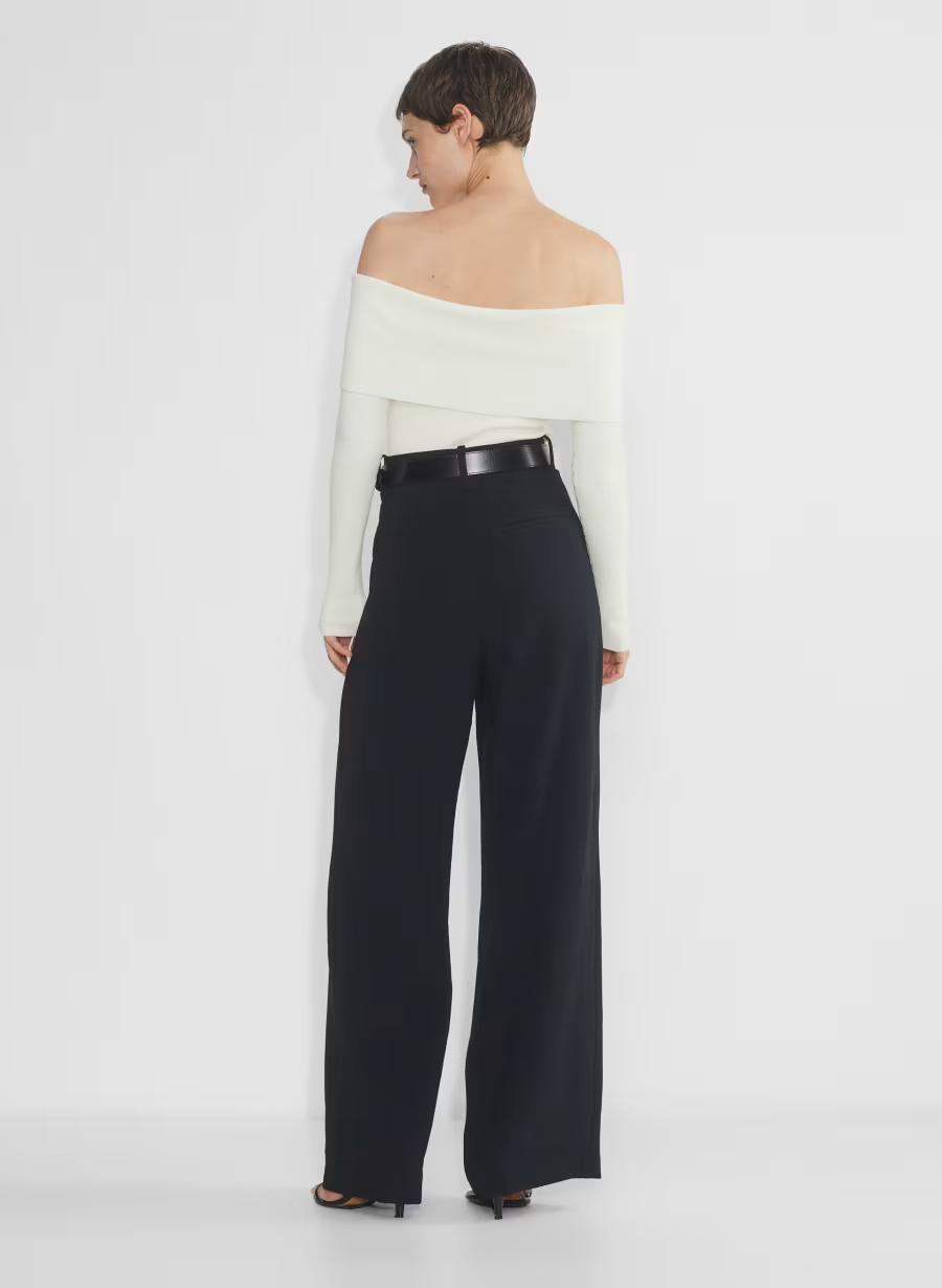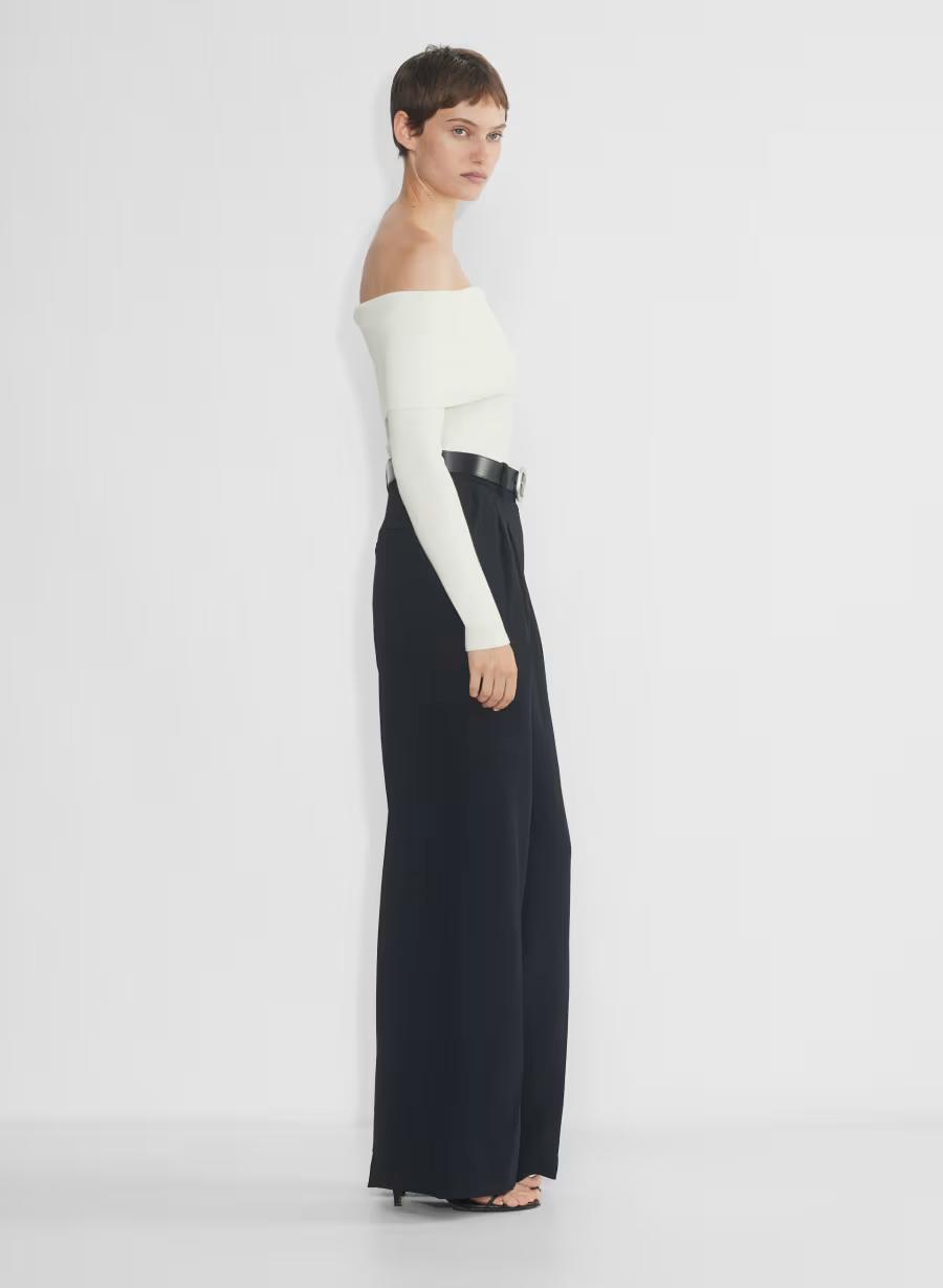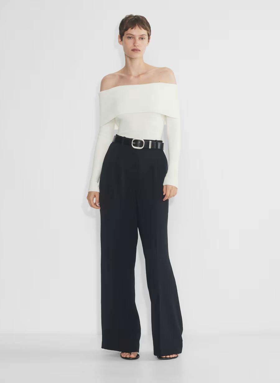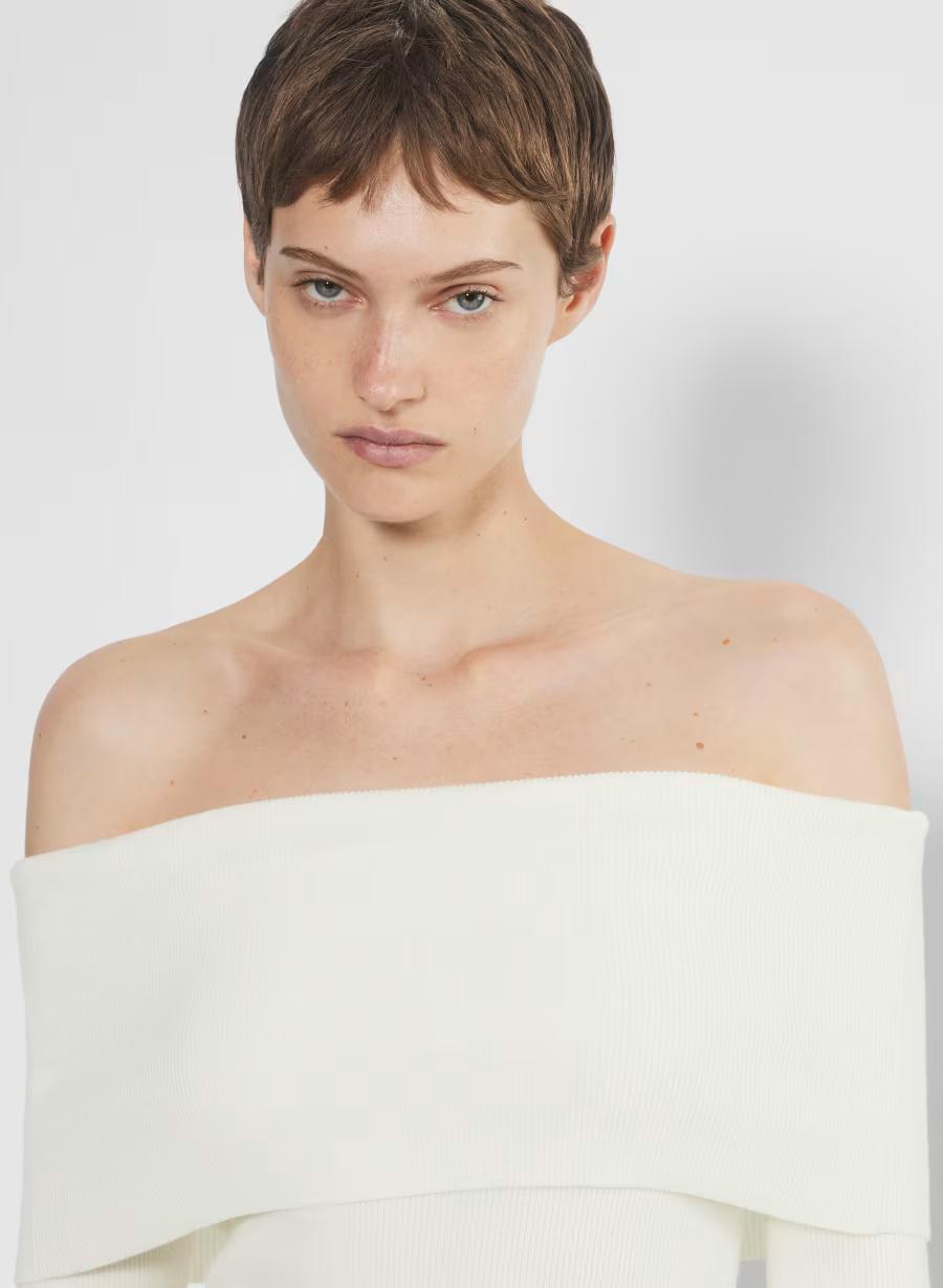 This is an off-the-shoulder sweater with a slim fit and fully fashioned construction. It’s made with Wonder Yarn — the lightweight yarn that lives up to its name. This peachy soft yarn offers the all-season warmth of wool, without the wool. It’s made with LENZING™ ECOVERO™ Viscose — responsibly sourced wood-based fibres produced through a process that reduces impact on forests, biodiversity and water supply. This sweater is constructed using a Half Cardigan stitch with vertical ribs for a textural look and feel.