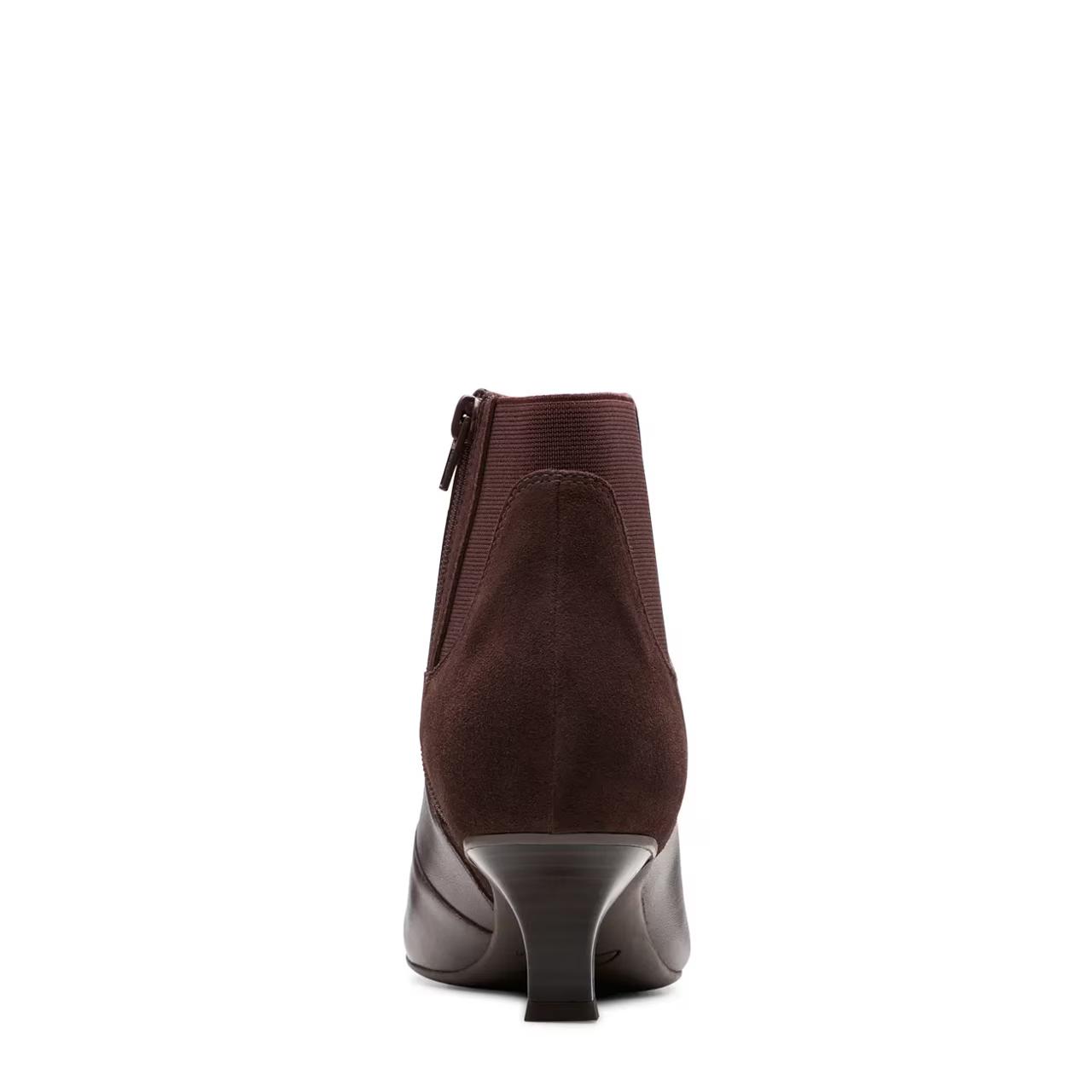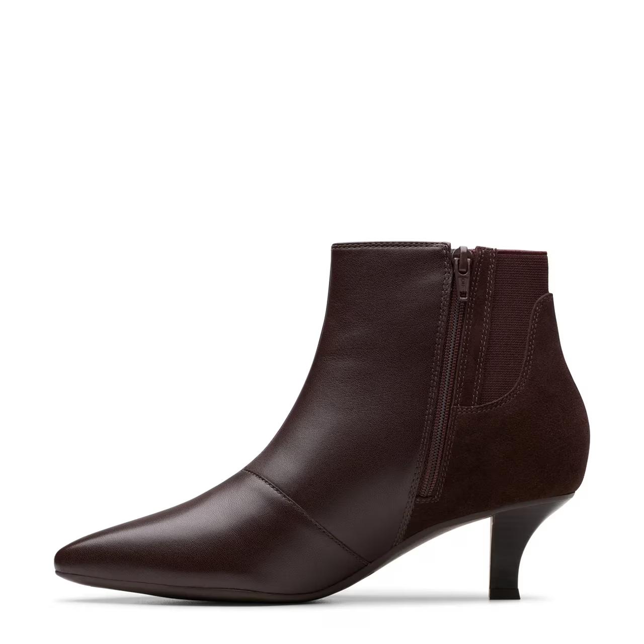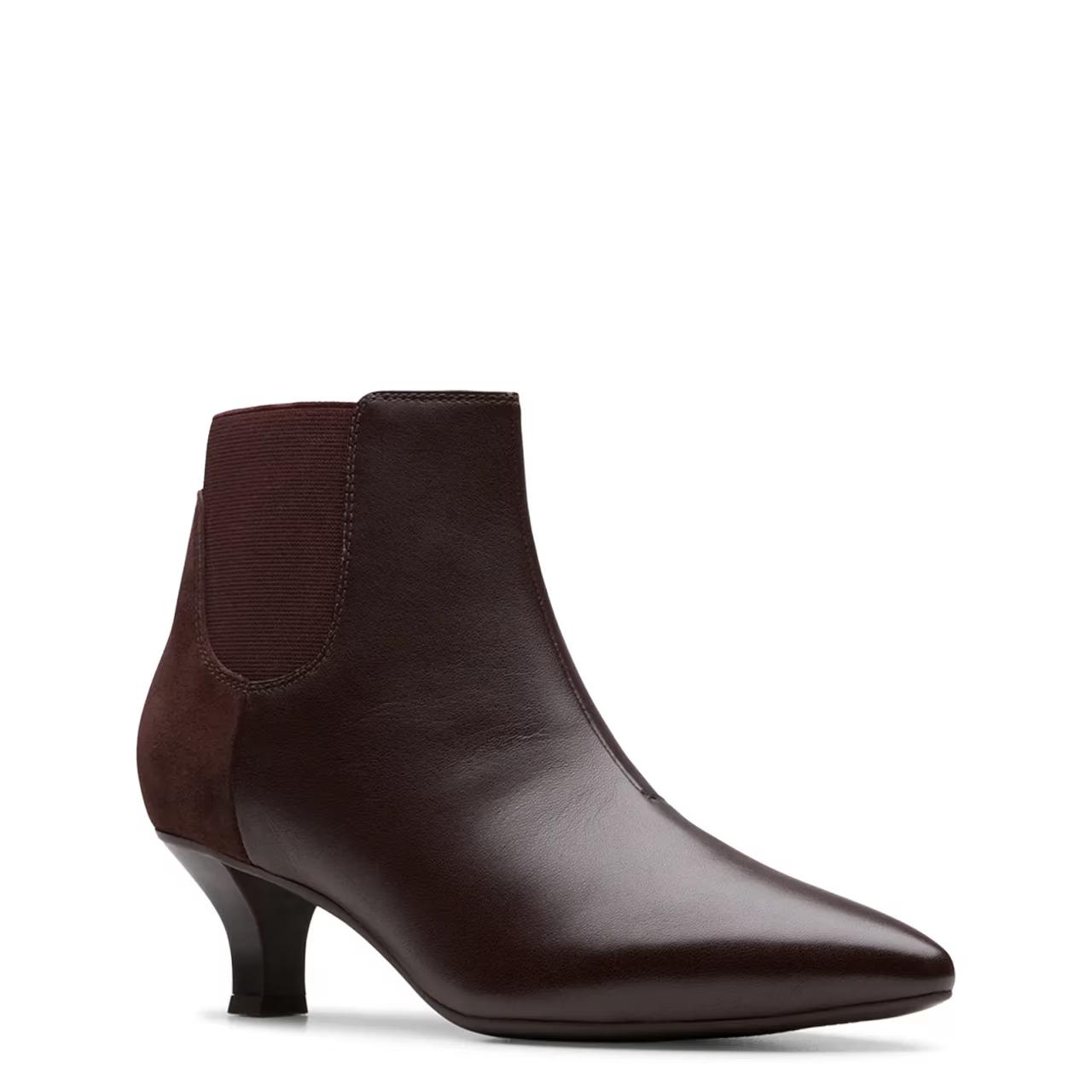 You’ll love the classic style, comfort, and versatility of these women’s Kepley Erin dark brown Chelsea booties by Clarks. Crafted with smooth leather and suede upper, these fashion ankle boots have a sleek pointed toe and a quick access inside zipper closure. Smooth synthetic and textile lining keep your feet feeling comfy while the Ultimate comfort footbed with targeted cushioned heel pad offers superior underfoot cushioning. The TPR outsole with low kitten heel offers a balance of style, comfort, and good grip.