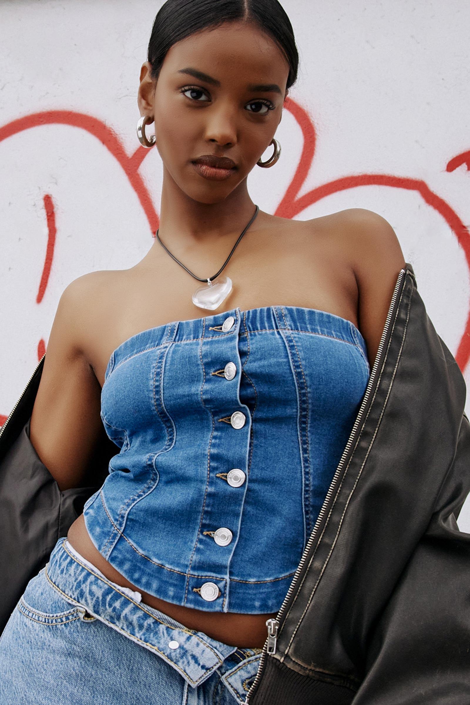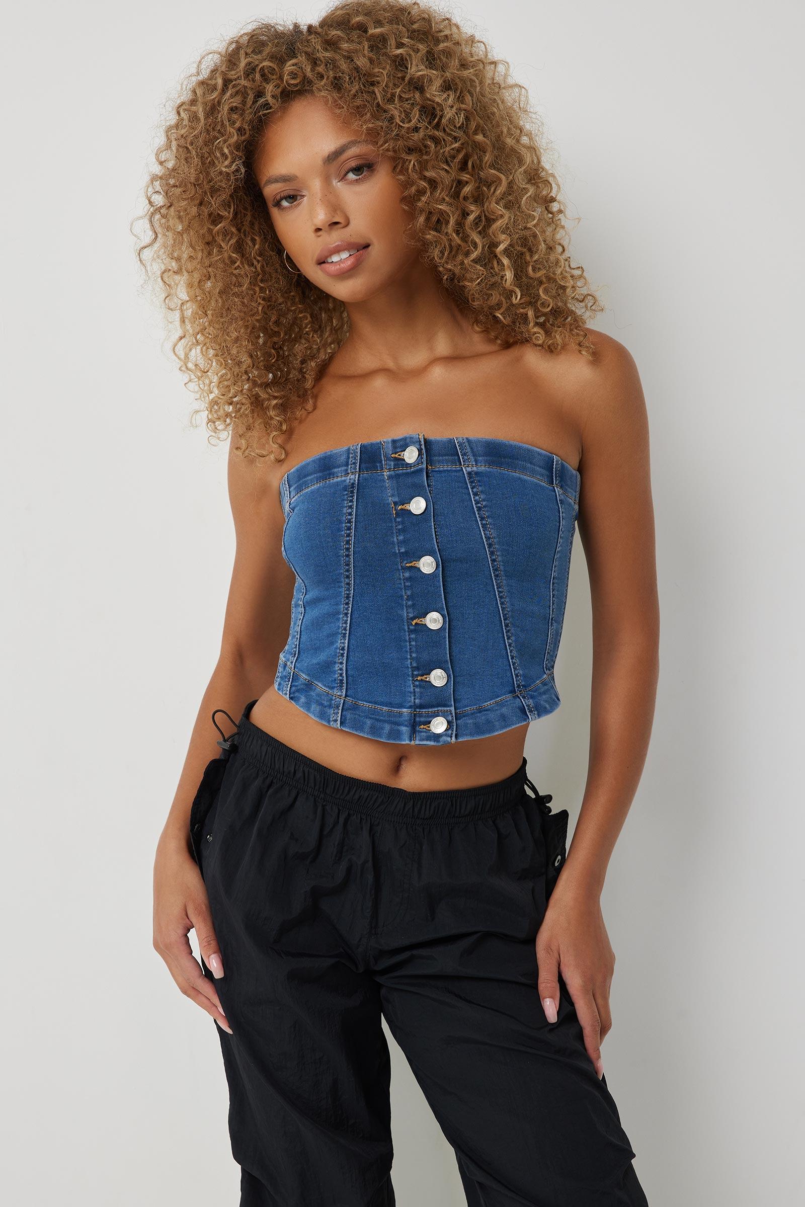 Ardene Denim Bustier in Blue | Size XS | Polyester/Cotton/Elastane