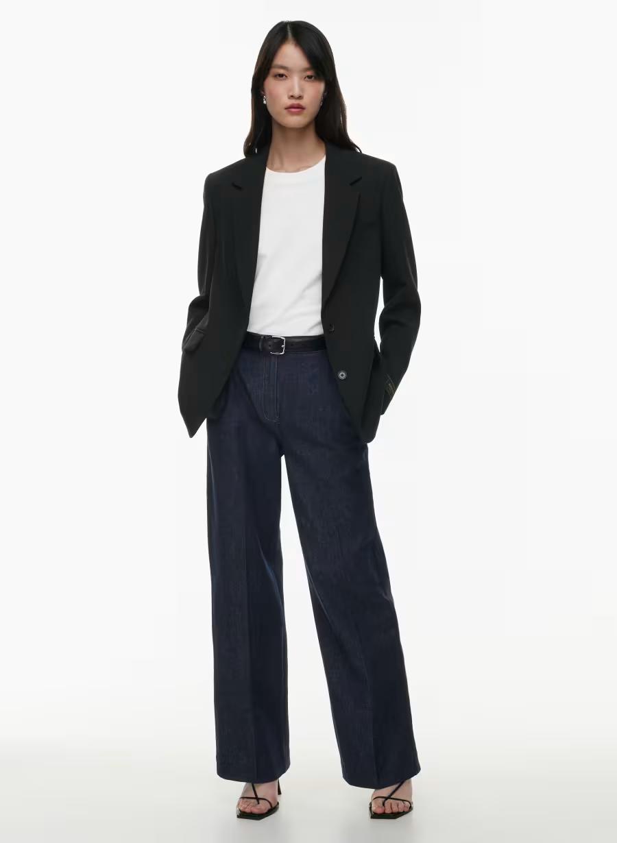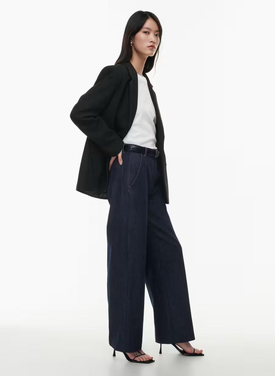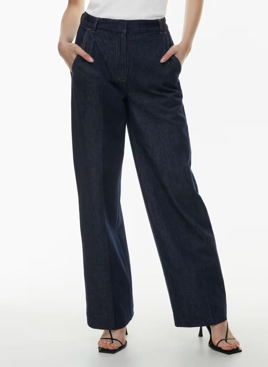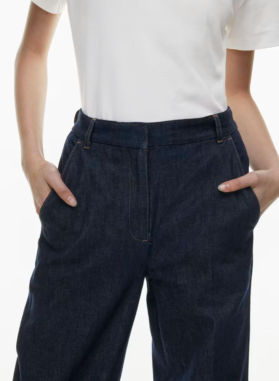These are relaxed jeans with a flat front, front slash pockets and back welt pockets. They’re cut from soft, drapey non-stretch denim that only gets better with wear. This version comes in a dark blue wash.