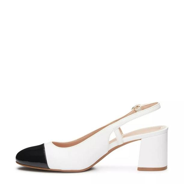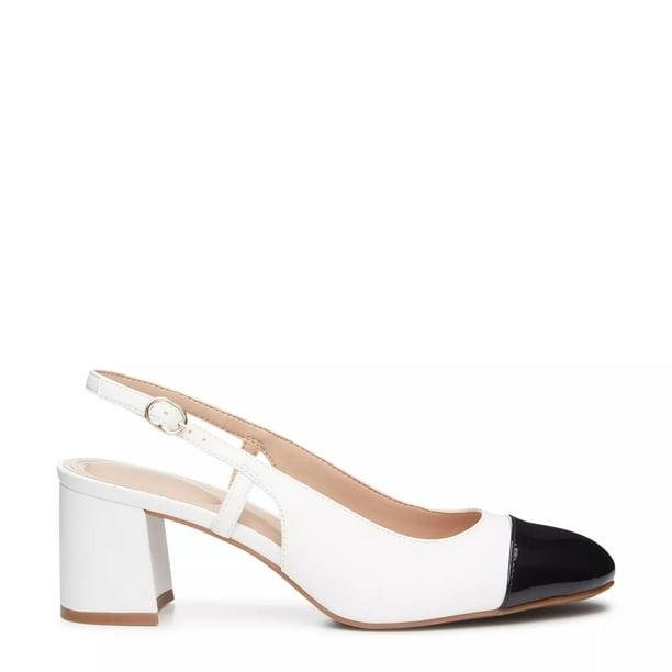 These Kelly & Katie's Eliana white/black slingback pumps are a must-have for the modern woman. Crafted with synthetic upper, these dressy shoes have an almond cap toe and an adjustable slingback strap with buckle closure for a precise fit and timeless look. Smooth synthetic/textile lining and a lightly foam padded footbed offer a comfy feel. A mid heel adds a touch of sophistication. This style is exclusive to Designer Brands Canada.