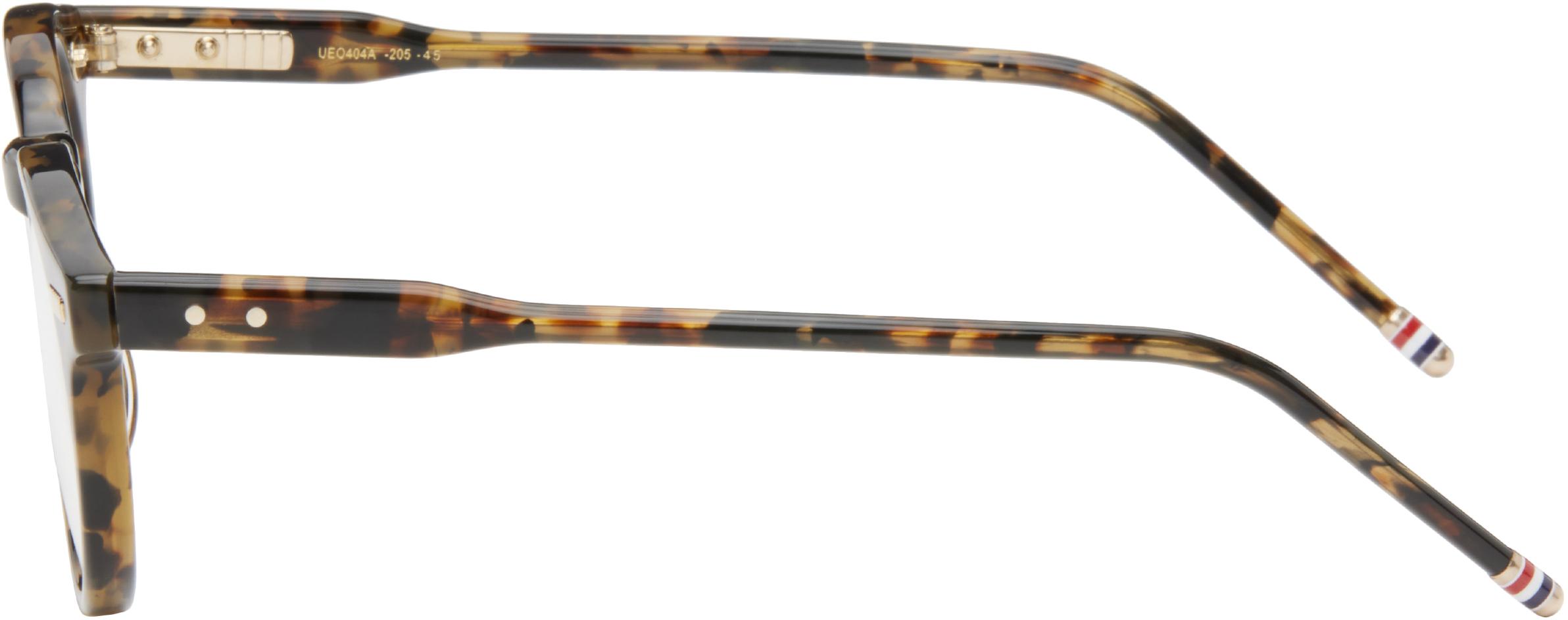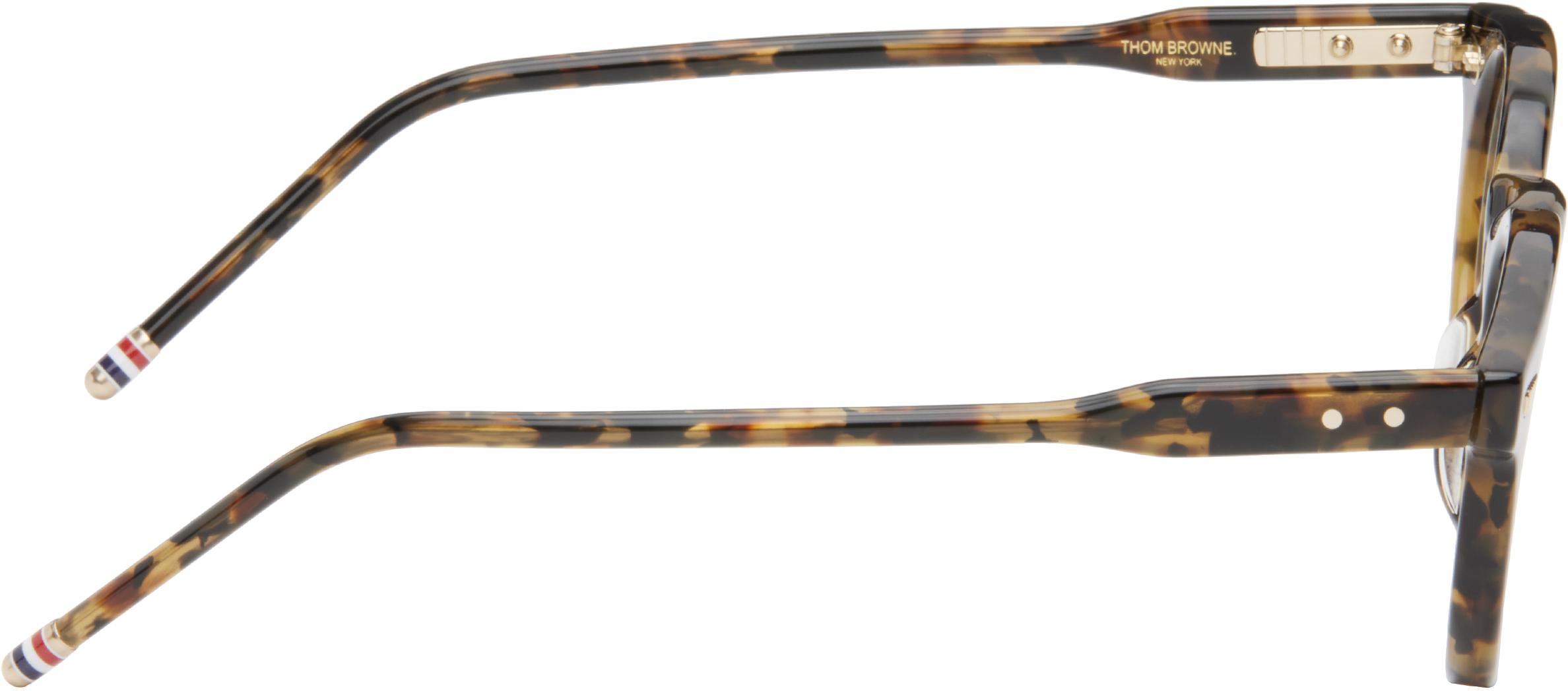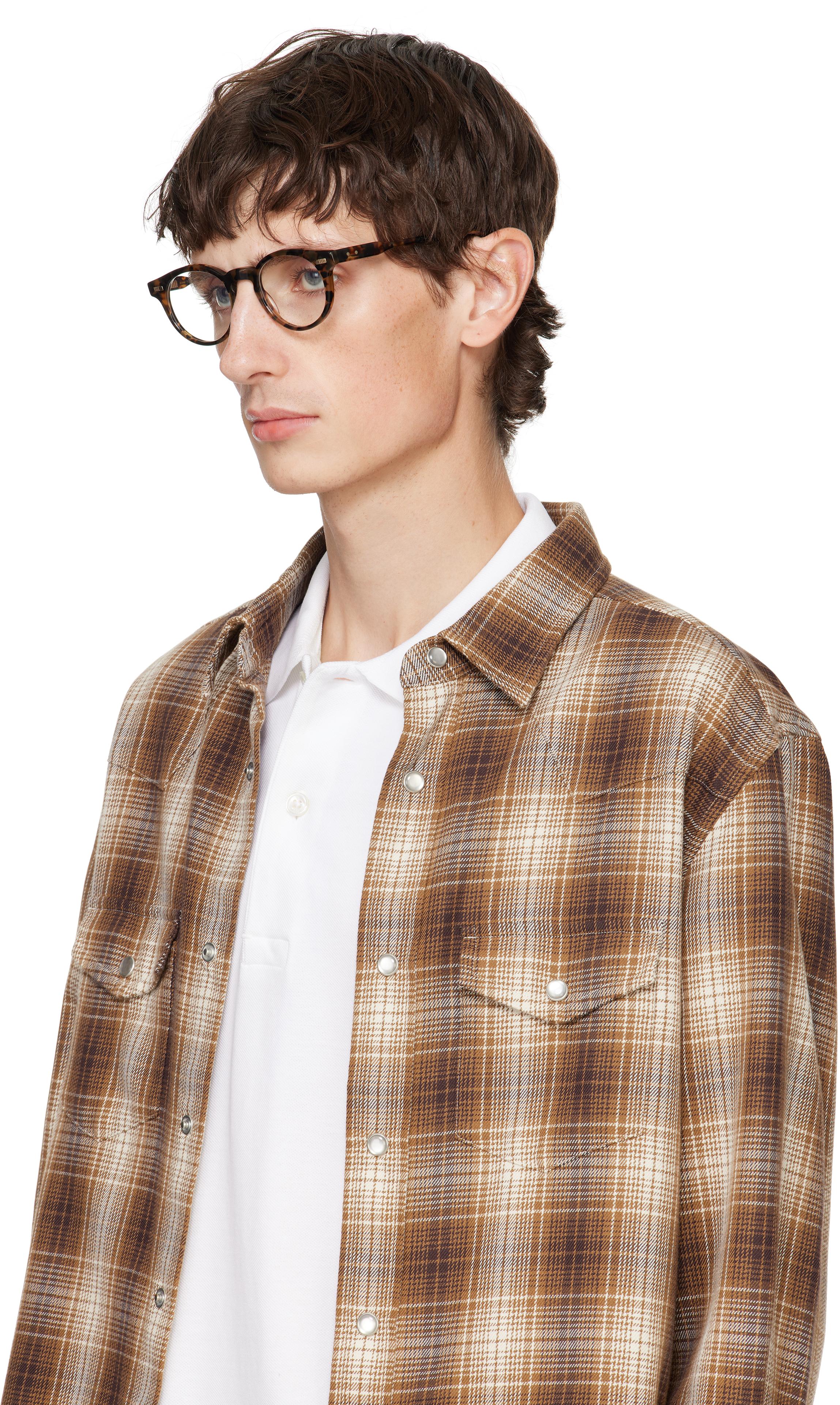 Round tortoiseshell acetate-frame optical glasses in brown. · Integrated nose pads · Stripe hardware at face · Exposed wire core · Tricolor detailing at temple tips · Includes leather case · Size: 45.22 146 Supplier color: Dark brown
