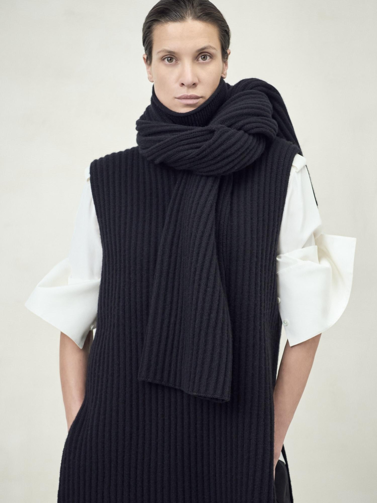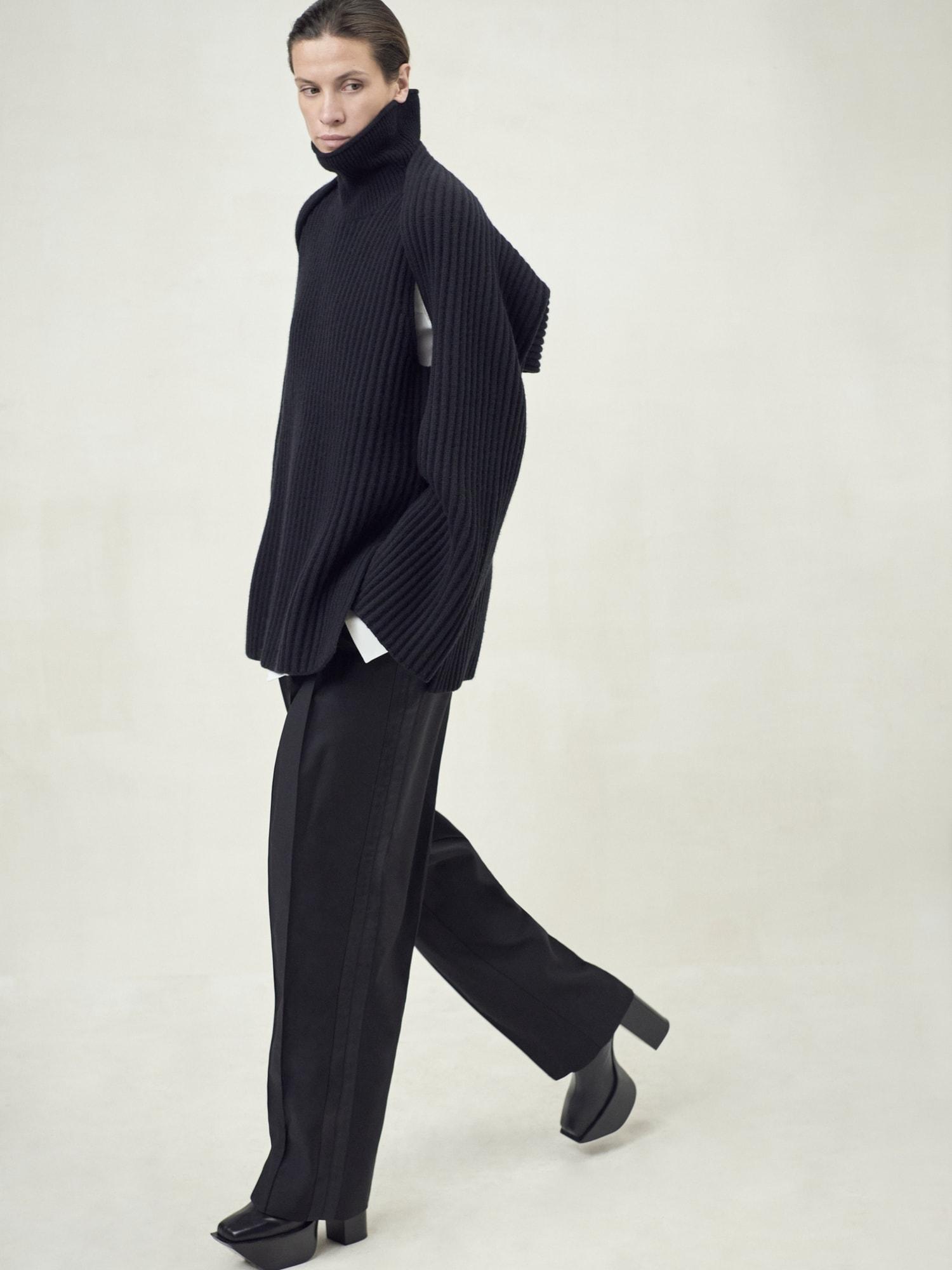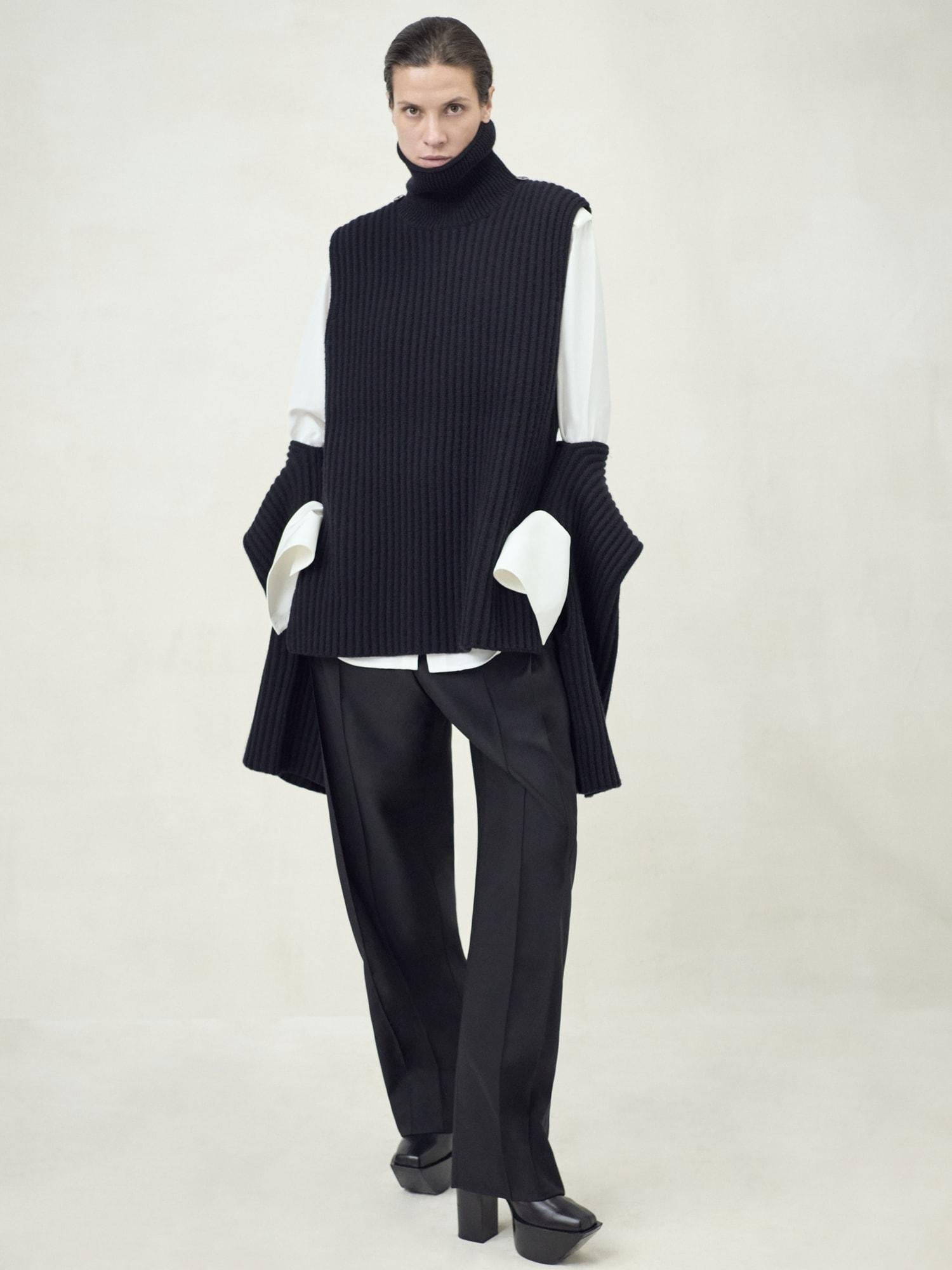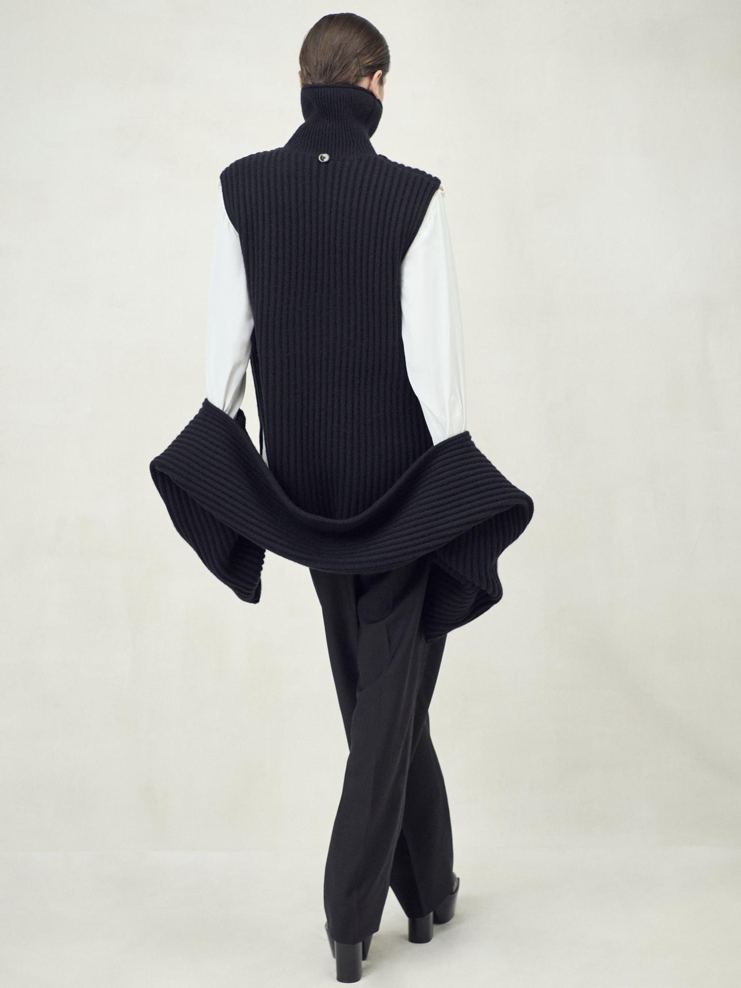 Celebrated designer Peter Do leverages iconic Banana Republic silhouettes in this limited-edition capsule collection, reimagining them in modern, multifunctional pieces marked by refined tailoring. Borrowing from a classic BR sweater from the 1990s, this signature two-piece design is knitted from ribbed cashmere with an oversized mock vest and detachable shrug whose cape-like sleeves can be worn multiple ways. Turtleneck. Detachable shrug attaches with button at back neck. Straight hem.