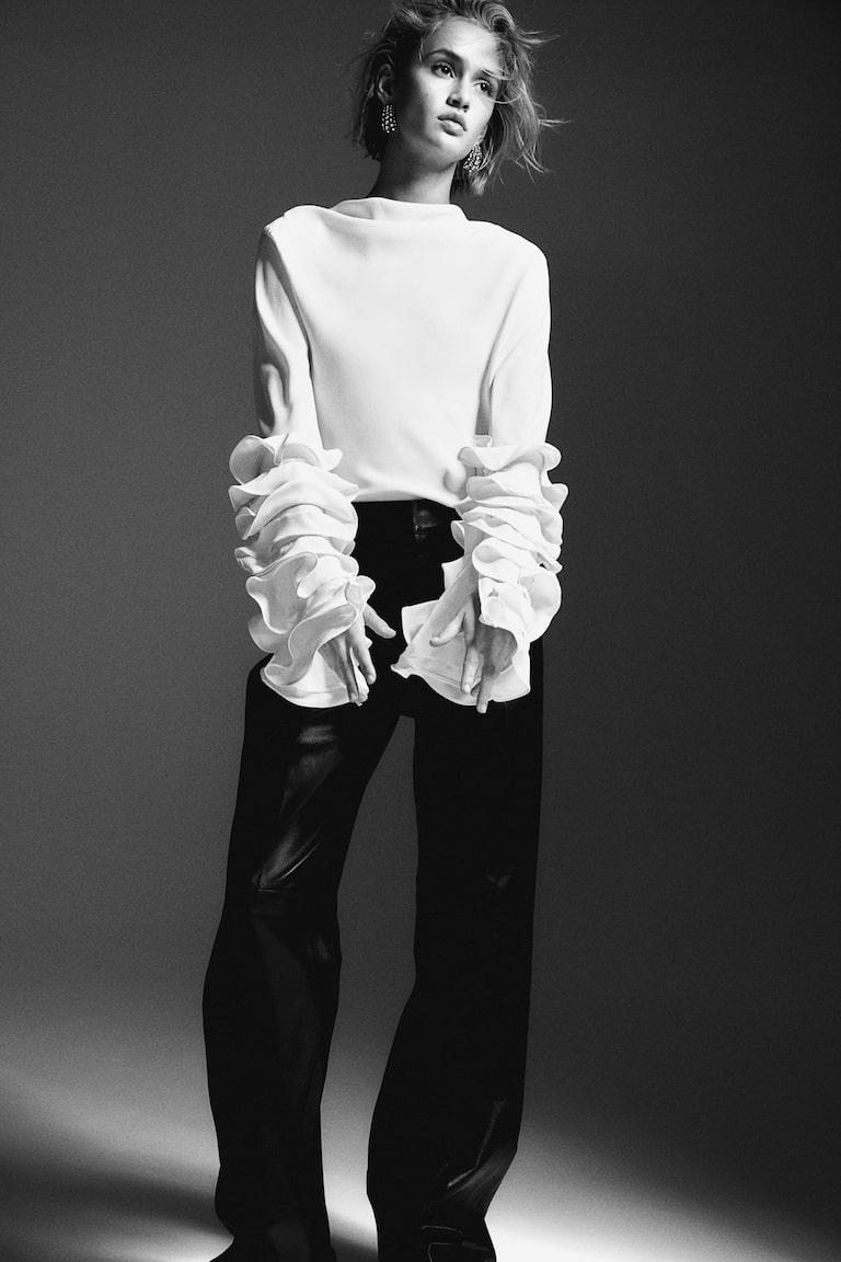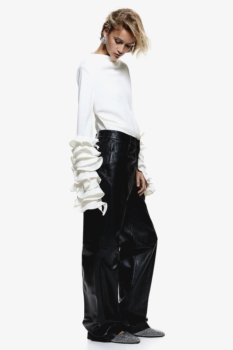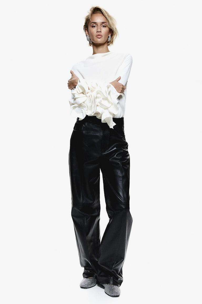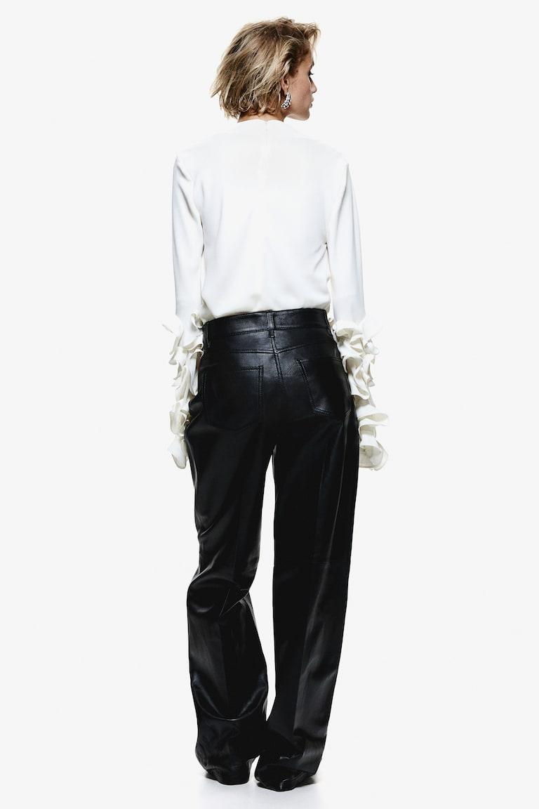 H&M Premium Selection 5-pocket pants in soft leather. Zip fly with concealed hook-and-eye fastener and straight legs with creases at front and back. Art. No.: 1242619001 Model size: The model is 174cm/5'9" and wears a size 4 Size: Inner leg: Length: 84.5 cm (Size 8) Waist: Circumference: 82.0 cm (Size 8)