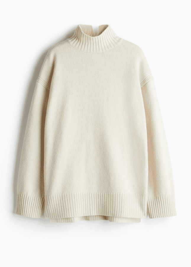 Oversized sweater in a soft knit with wool content. Rib-knit turtleneck with V-shaped opening at back of neck. Dropped shoulders, long, wide sleeves, and ribbing at cuffs and hem. High slits at sides of hem.
