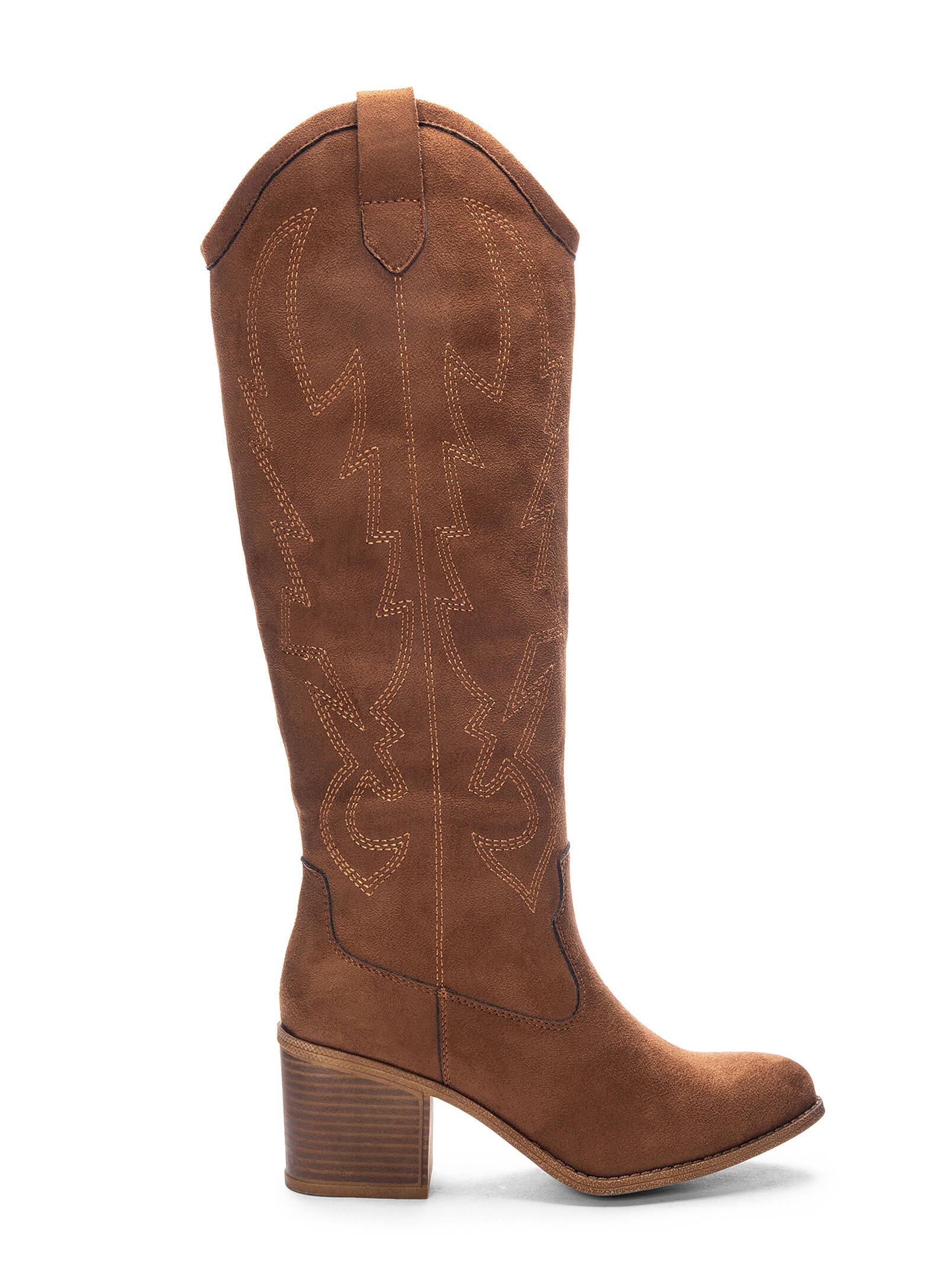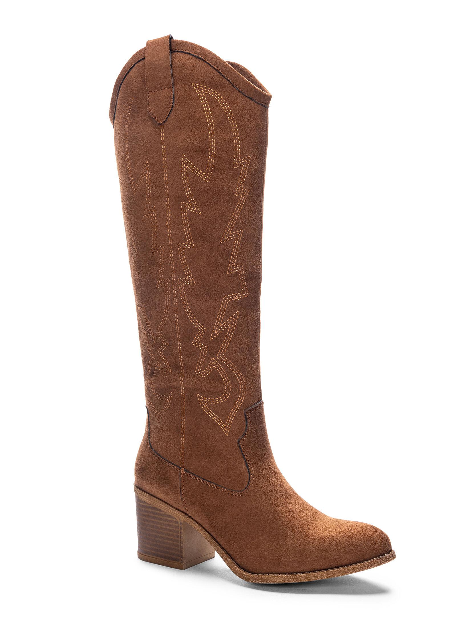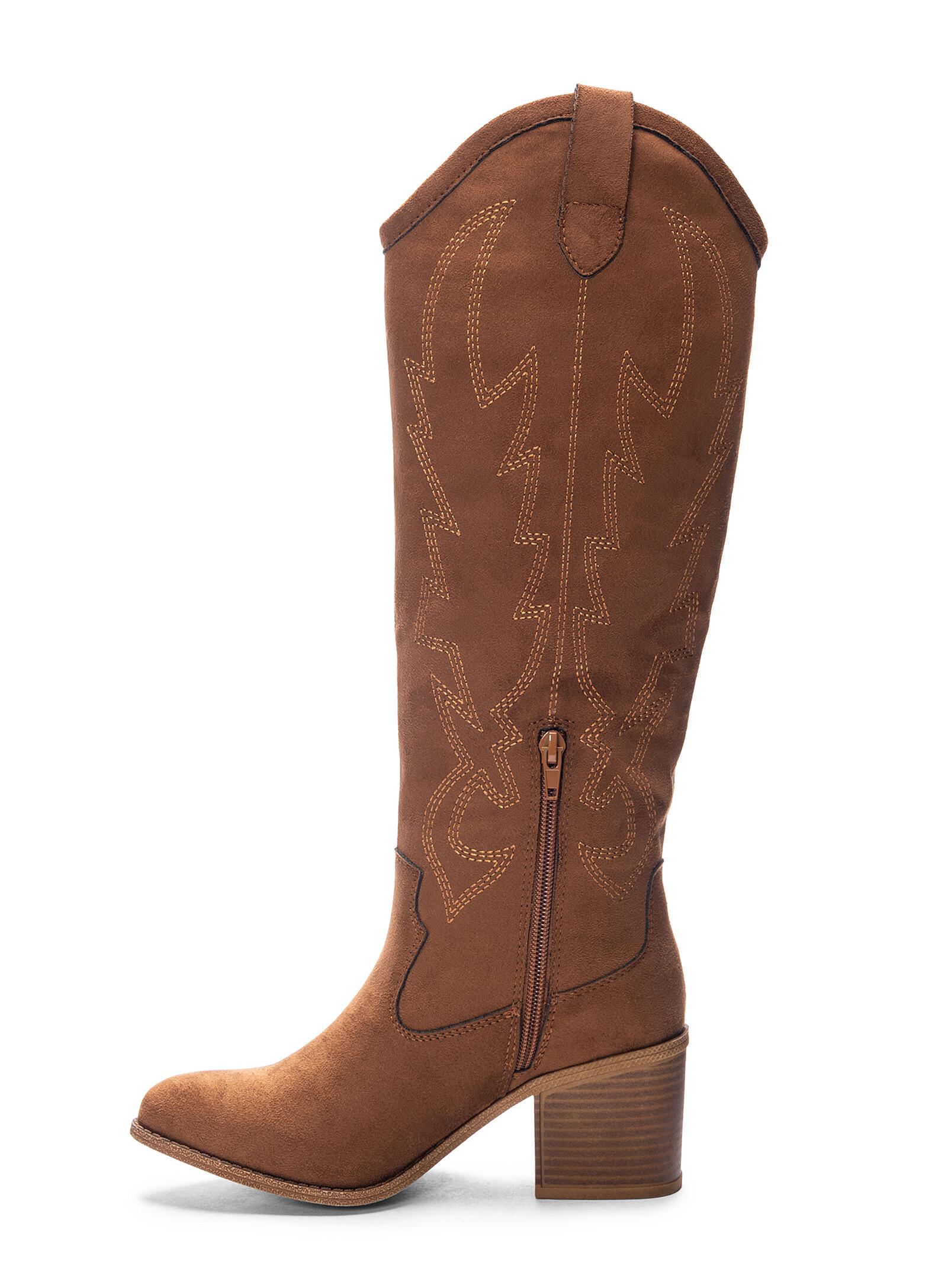 Dirty Laundry at Simons Micro-suede upper with a soft and elegant finish enhanced with cowboy-style ornamental topstitching Iconic pulls and half-zip closure so you can slip them on easily Elegant almond-shaped toe Synthetic lining and lightly cushioned footbed Heavy-duty thermoplastic rubber (TPR) outsole with stable block heel Heel height: 2.75" (7 cm) Shaft height: 15.25" (38.75 cm)
