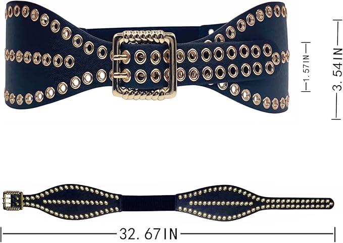 【Material】---Faux leather and elastic waist band 【Size】---32.67*3.54Inch, suitable for waist size 26in to 33in. 【Vintage Design】---The retro cinch belt is decorated with matal rivets design. 【Elegant Women's Belt】---No bound felling, behind of the waist belt is elastic, adjustable comfortable wearing experience. 【After-Sale Service】---30Day Items Exchange or Money Back; Fast Respond Any Questions at Any Time.