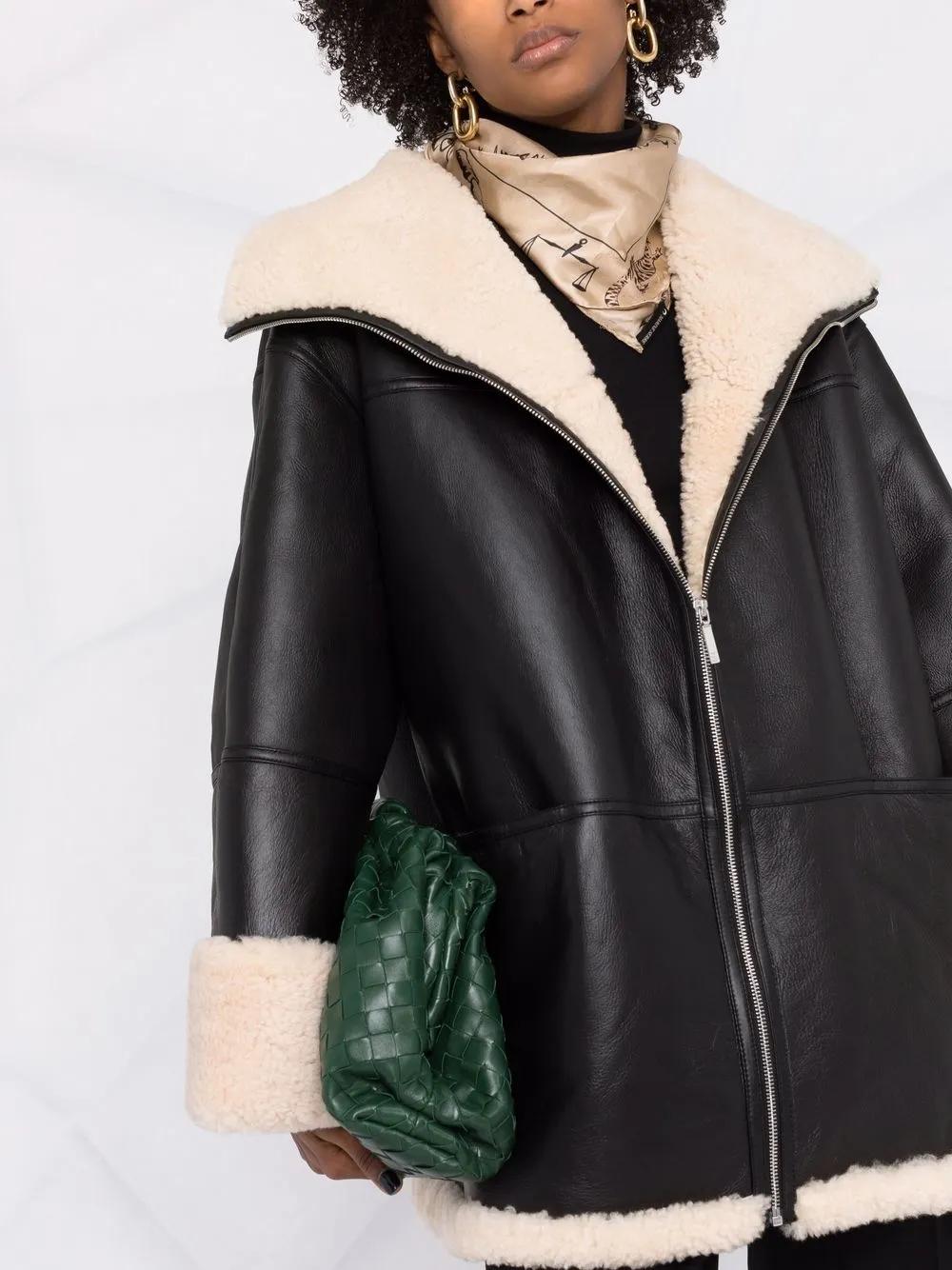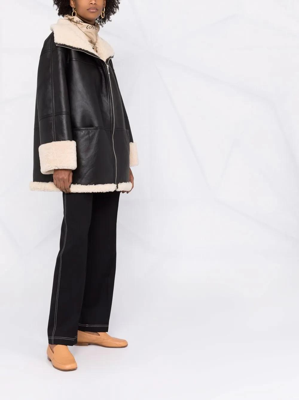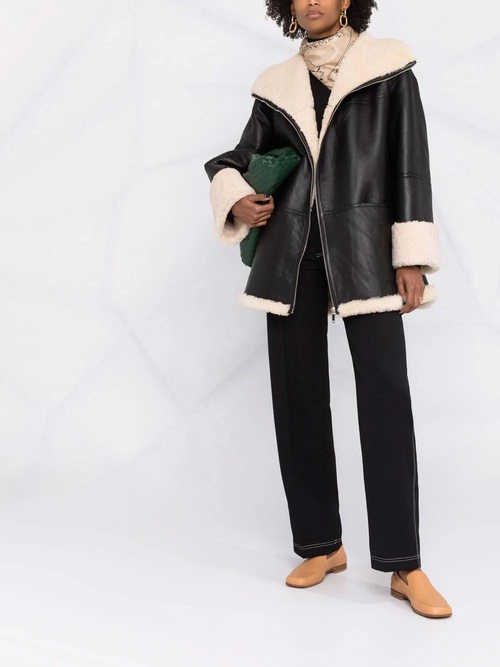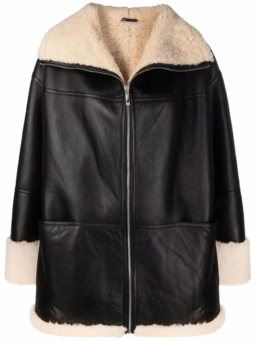 TOTEME Signature shearling jacket This slouchy TOTEME jacket is produced in supple black leather and is lined with soft shearling. Designed for an oversized fit, the two-tone garment features a contrasting wide collar, turned-up hem and cuffs. Highlights black cotton shearling spread collar front zip fastening long sleeves two front welt pockets