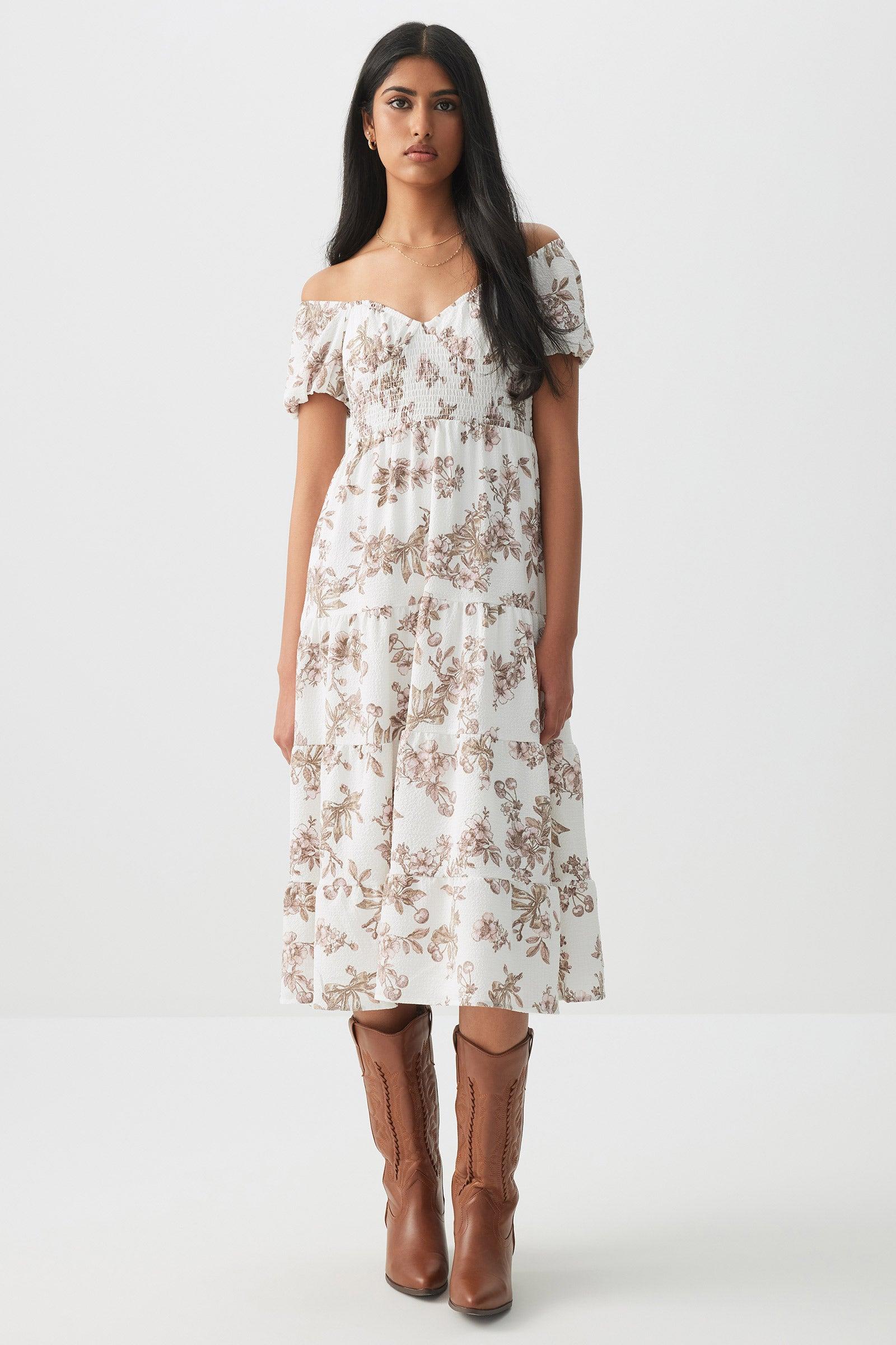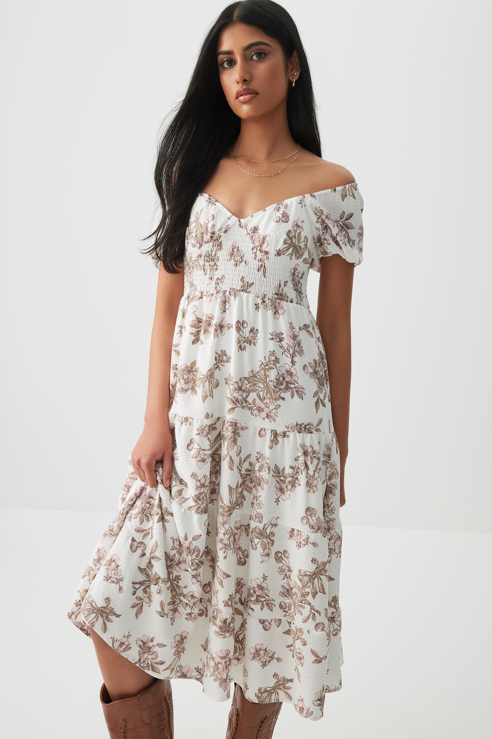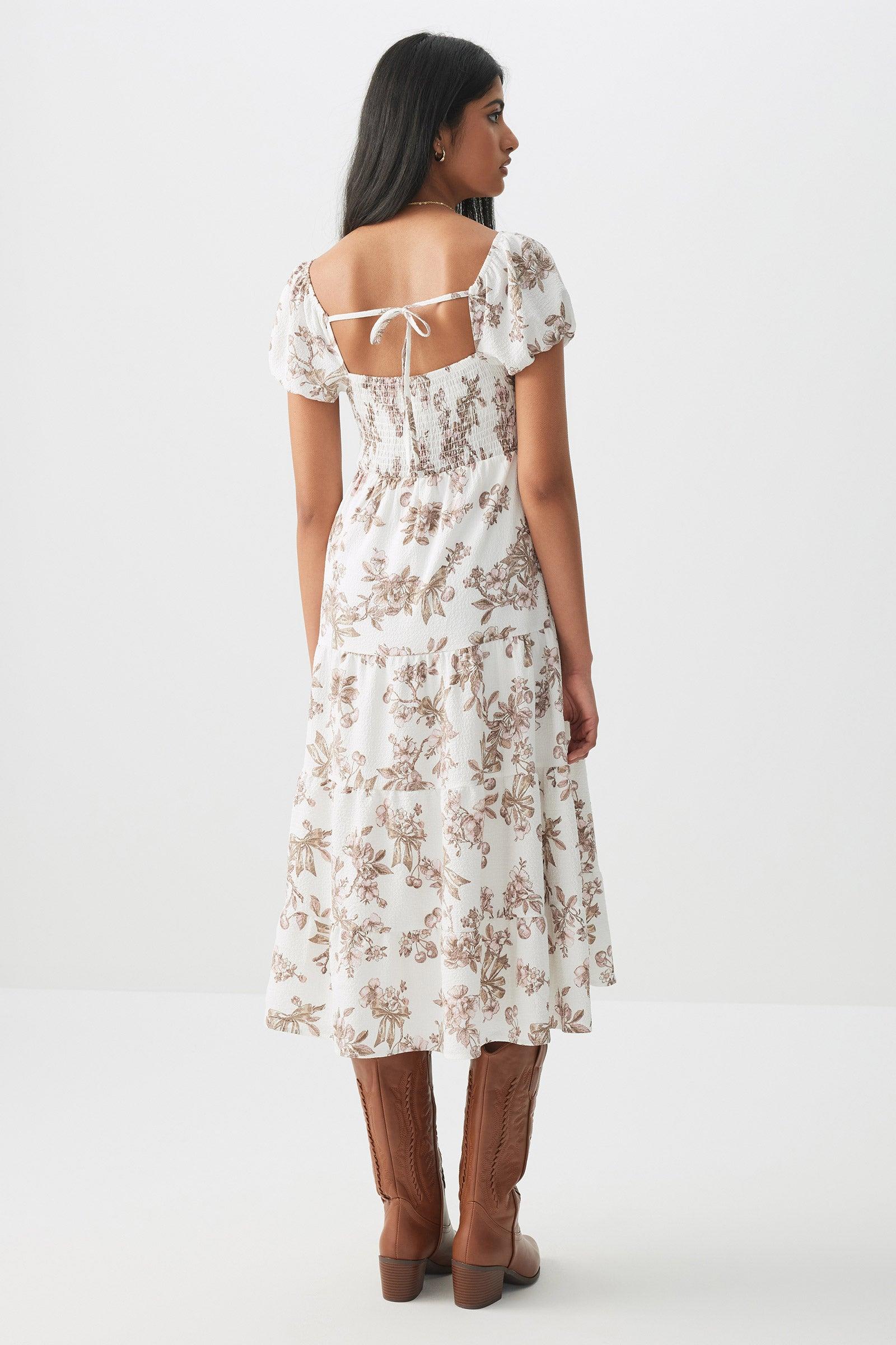 Woven midi dress. Sweetheart neckline Short puff sleeves Tiered skirt Choice of prints Shell: 97% polyester, 3% elastane Lining: 100% polyester Model is wearing size S | Ardene Midi Tiered Milkmaid Dress in White | Size Small | Polyester/Elastane