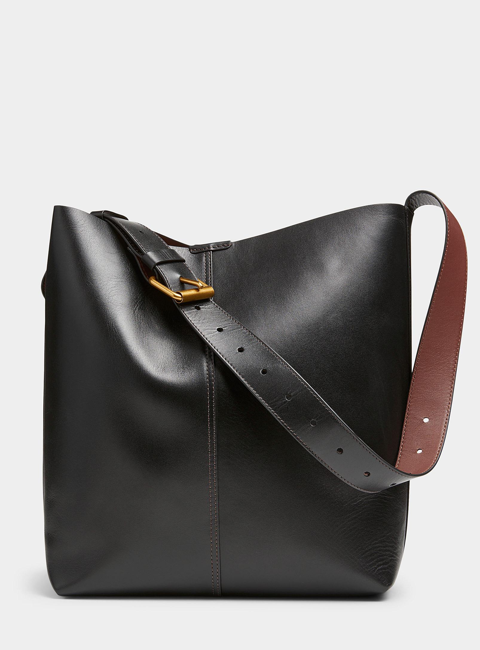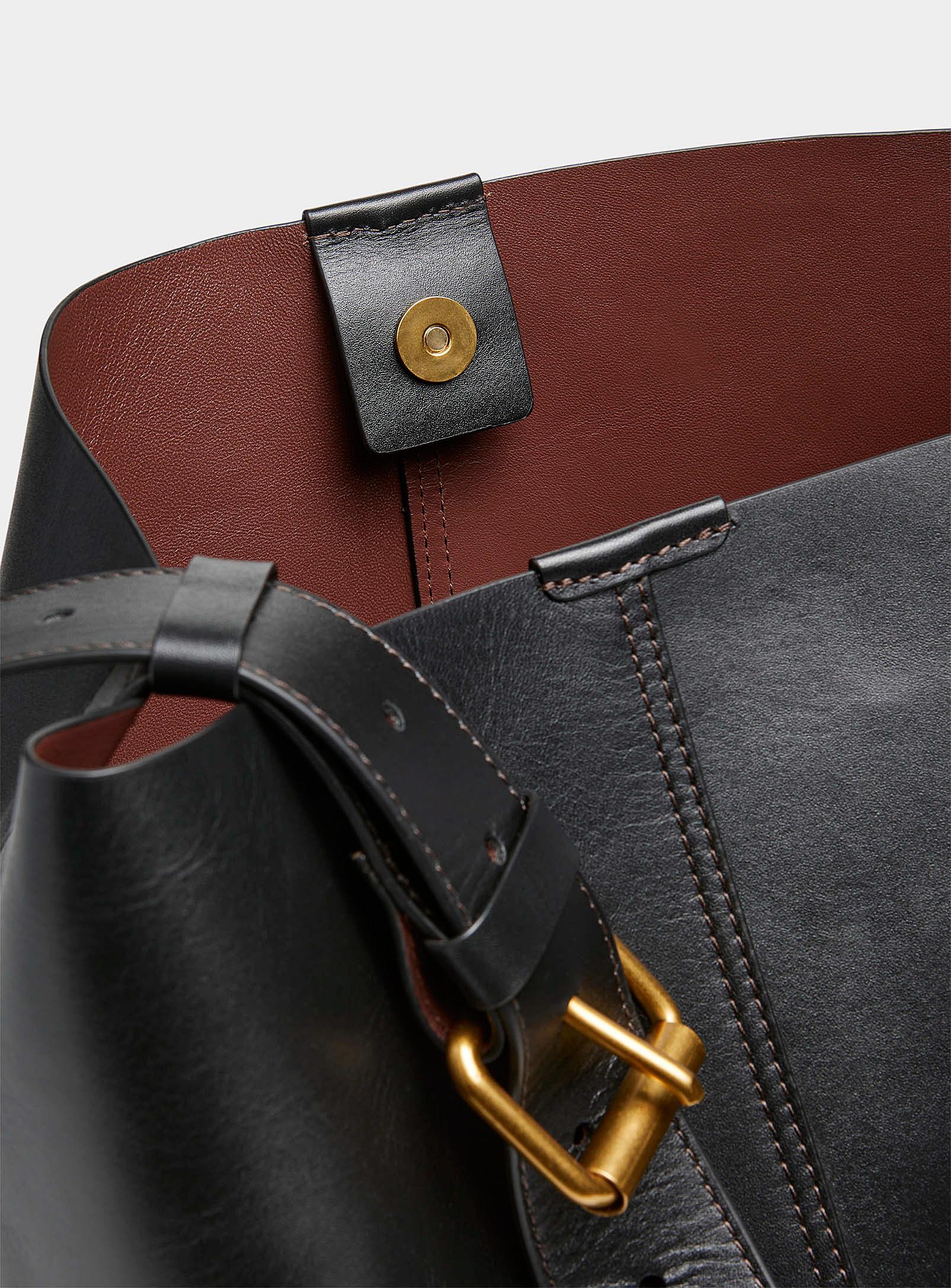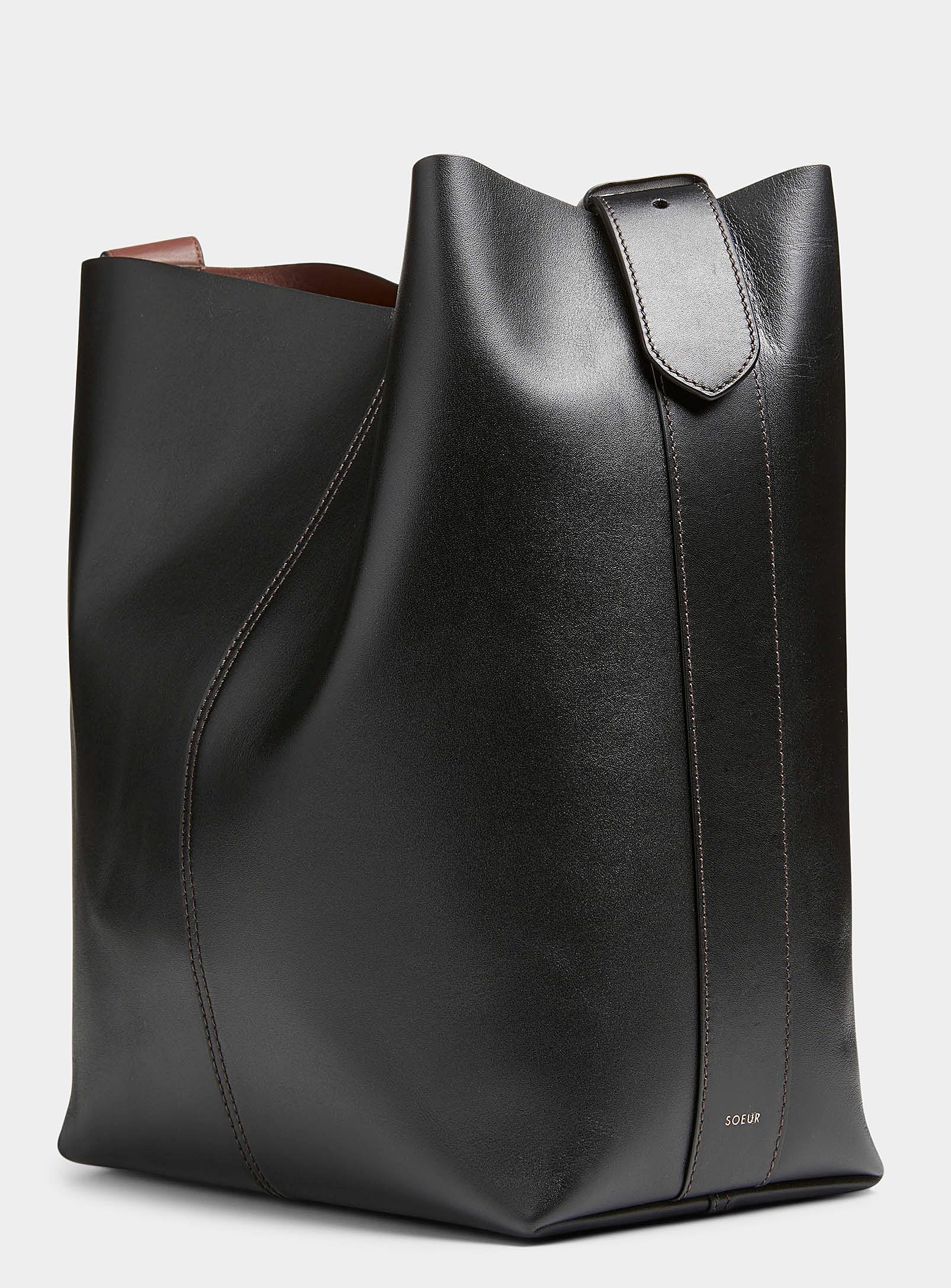 Soeur - Saudade belt strap bucket bag Soeur Expressing sensitivity and simplicity through its designs, Soeur presents this creation featuring an elegantly topstitched minimalist silhouette and a belt-inspired strap. Carry your daily essentials in style with this bag exuding sincere and authentic chic. Smooth genuine leather Magnetic button closure Ajustable grab handle or shoulder strap Signature dust bag included Height: 14" (35.5 cm) Length: 11.75" (30 cm) Width: 6" (15 cm)