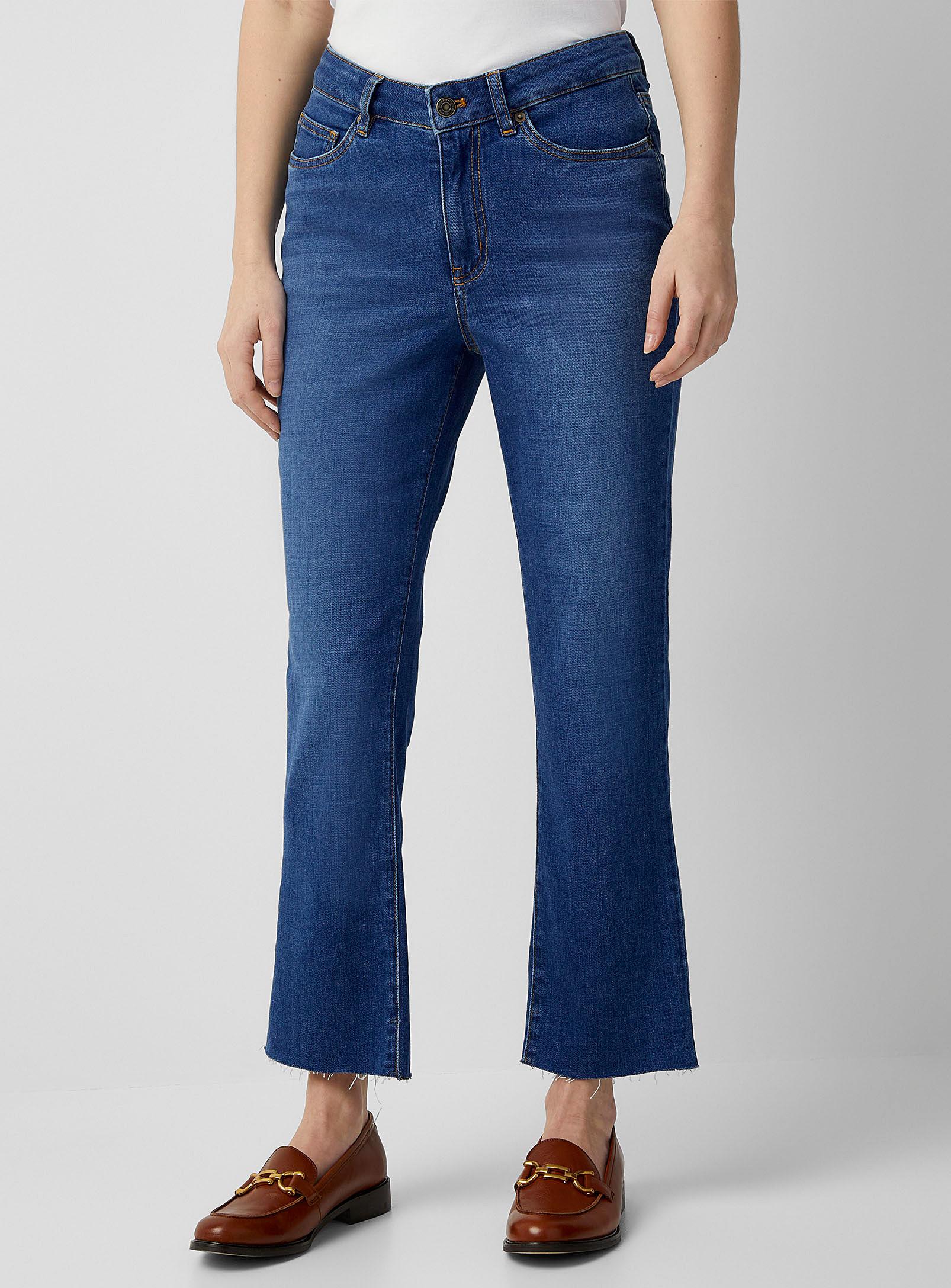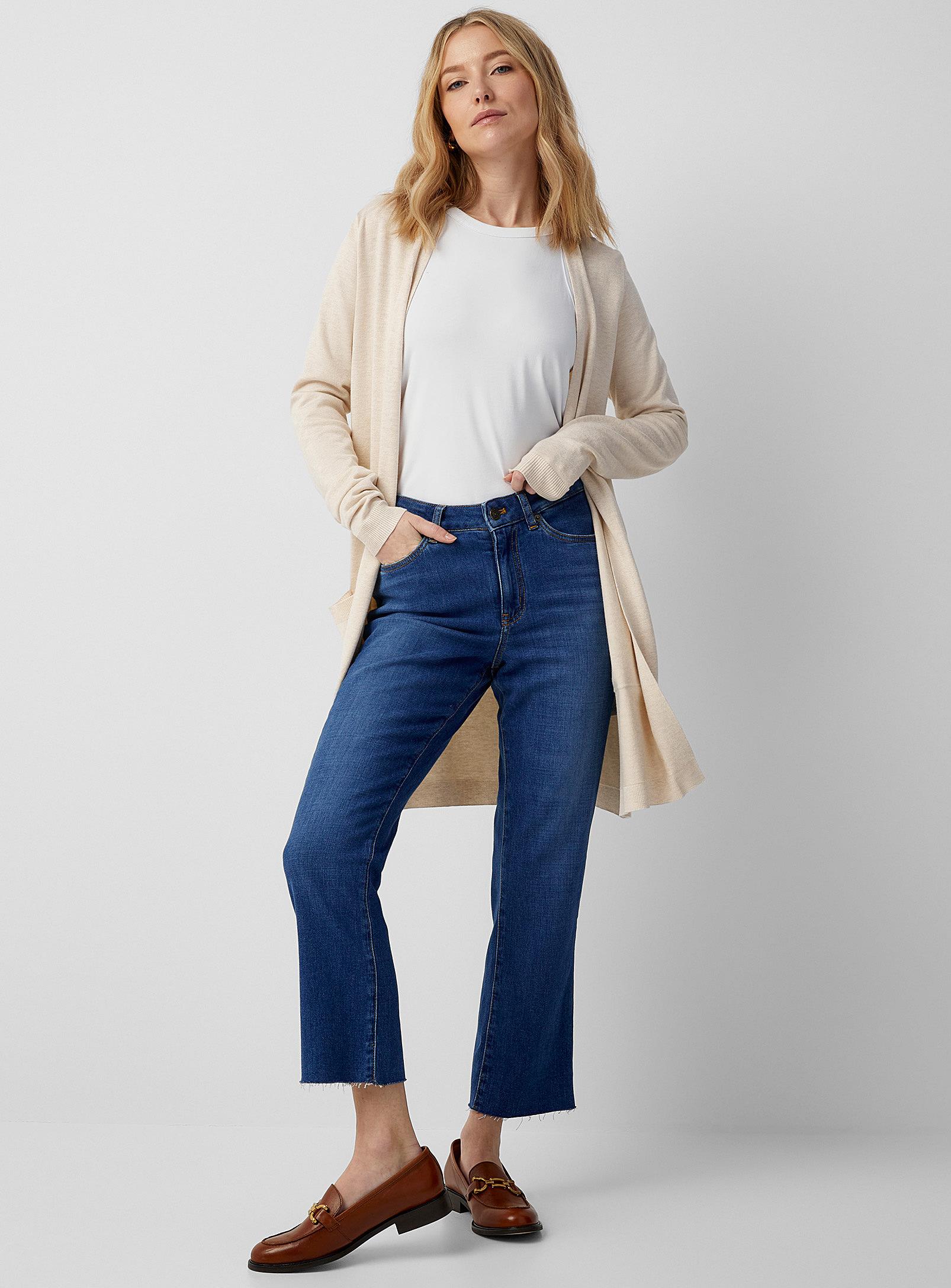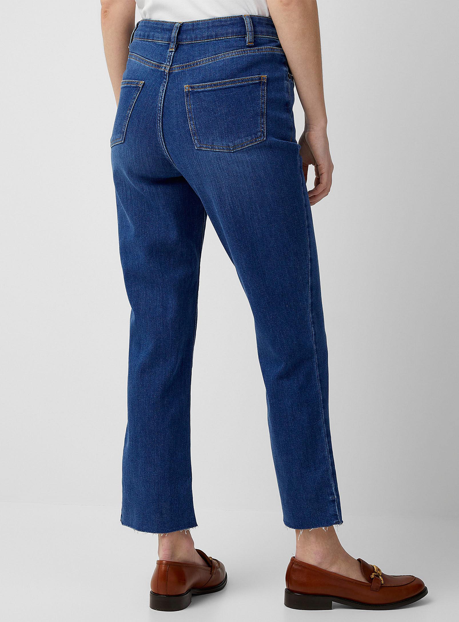 Contemporaine - Raw hem slim straight jean Contemporaine Contemporaine exclusive Fit Straight, slim leg High rise Fabric Soft, stretch denim made of organic cotton EIM© score*: 19 (low impact) Details Five pockets Slightly frayed cut hem Measures Front rise: 10.5" (26.5 cm) Inseam length: 26" (66.5 cm) *The EIM© score measures the environmental impact of its treatment and denim wash processes. A score between 0 and 33 is considered to be low impact. The size of the item pictured is 28