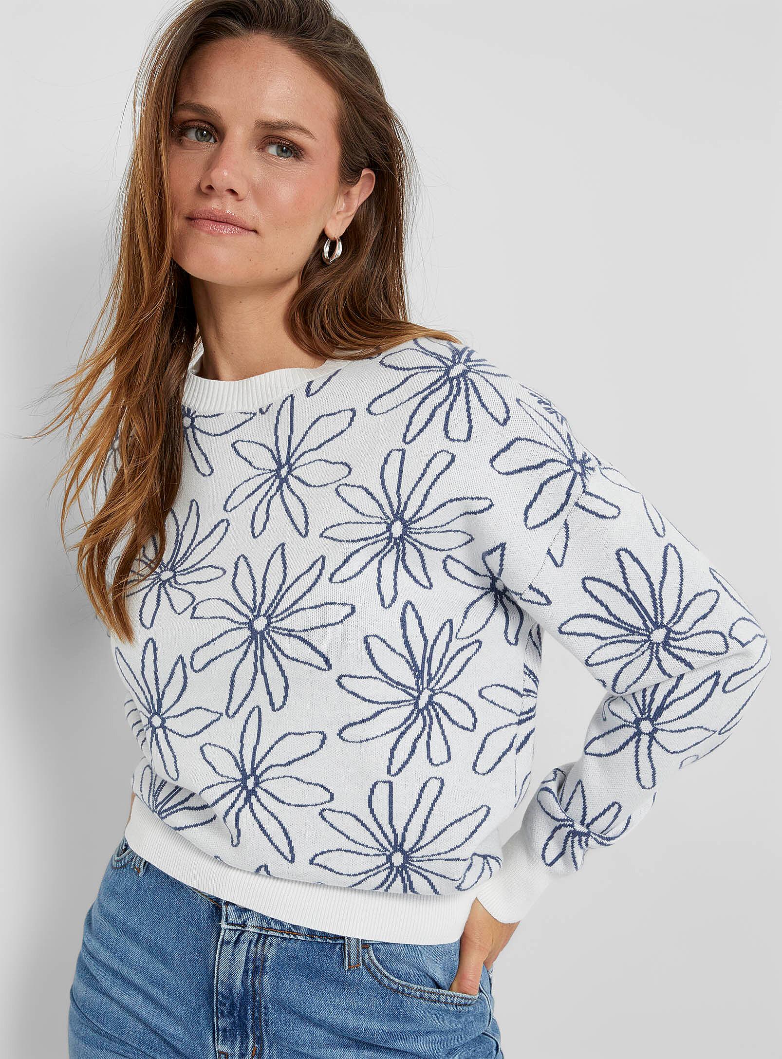 Contemporaine - Floral design jacquard sweater Contemporaine Contemporaine by Simons: an exclusive designed in Canada Fine, yet dense and soft jacquard knit Relaxed fit with drop shoulders Ribbed edging Designed in Canada The size of the item pictured is small