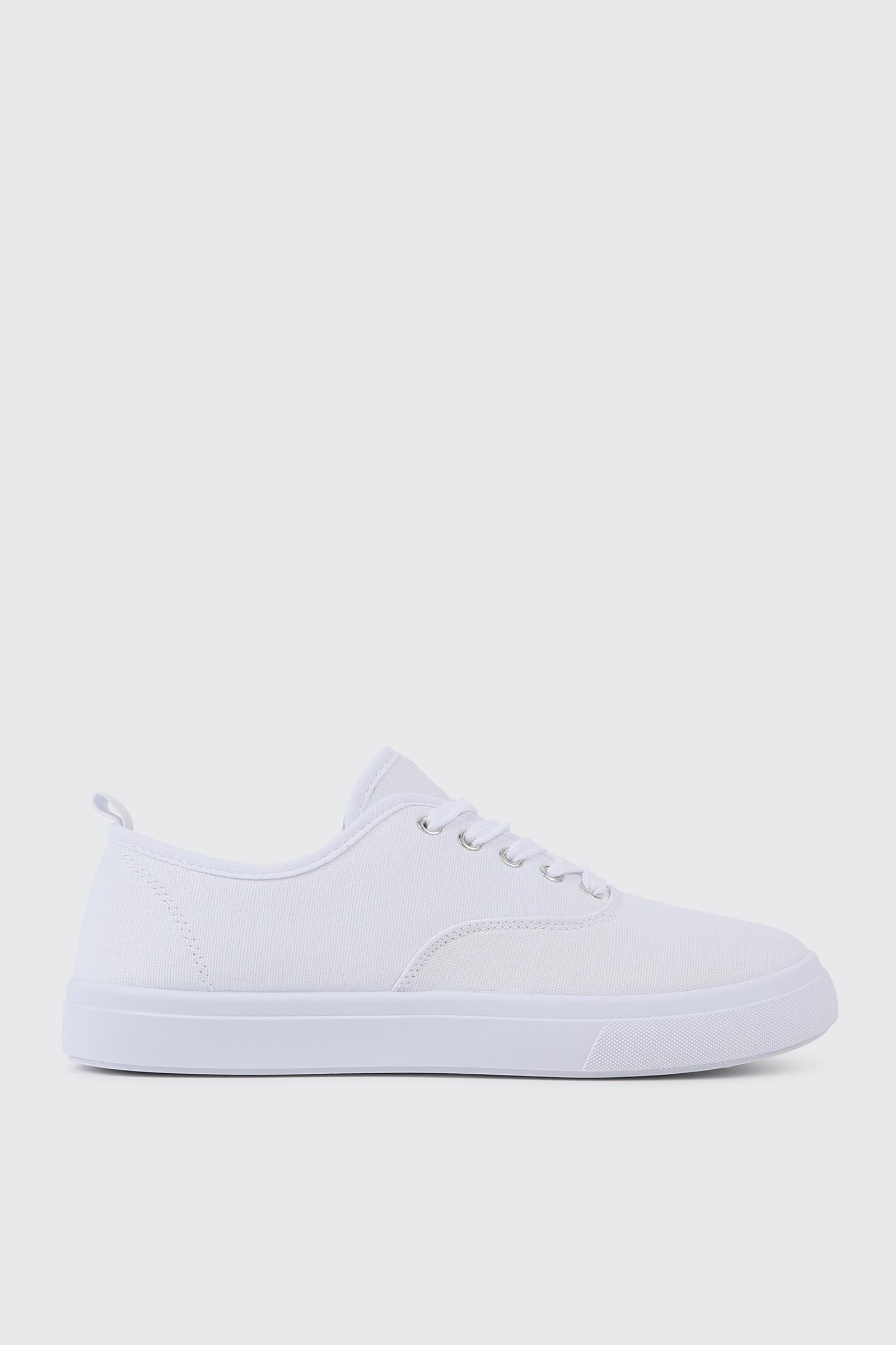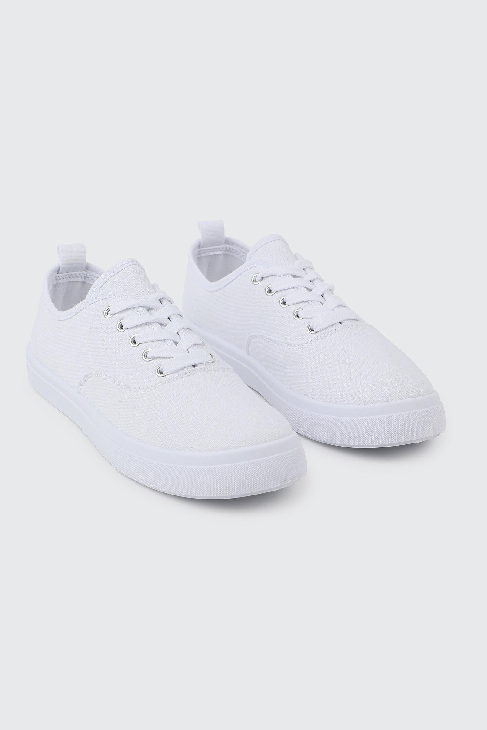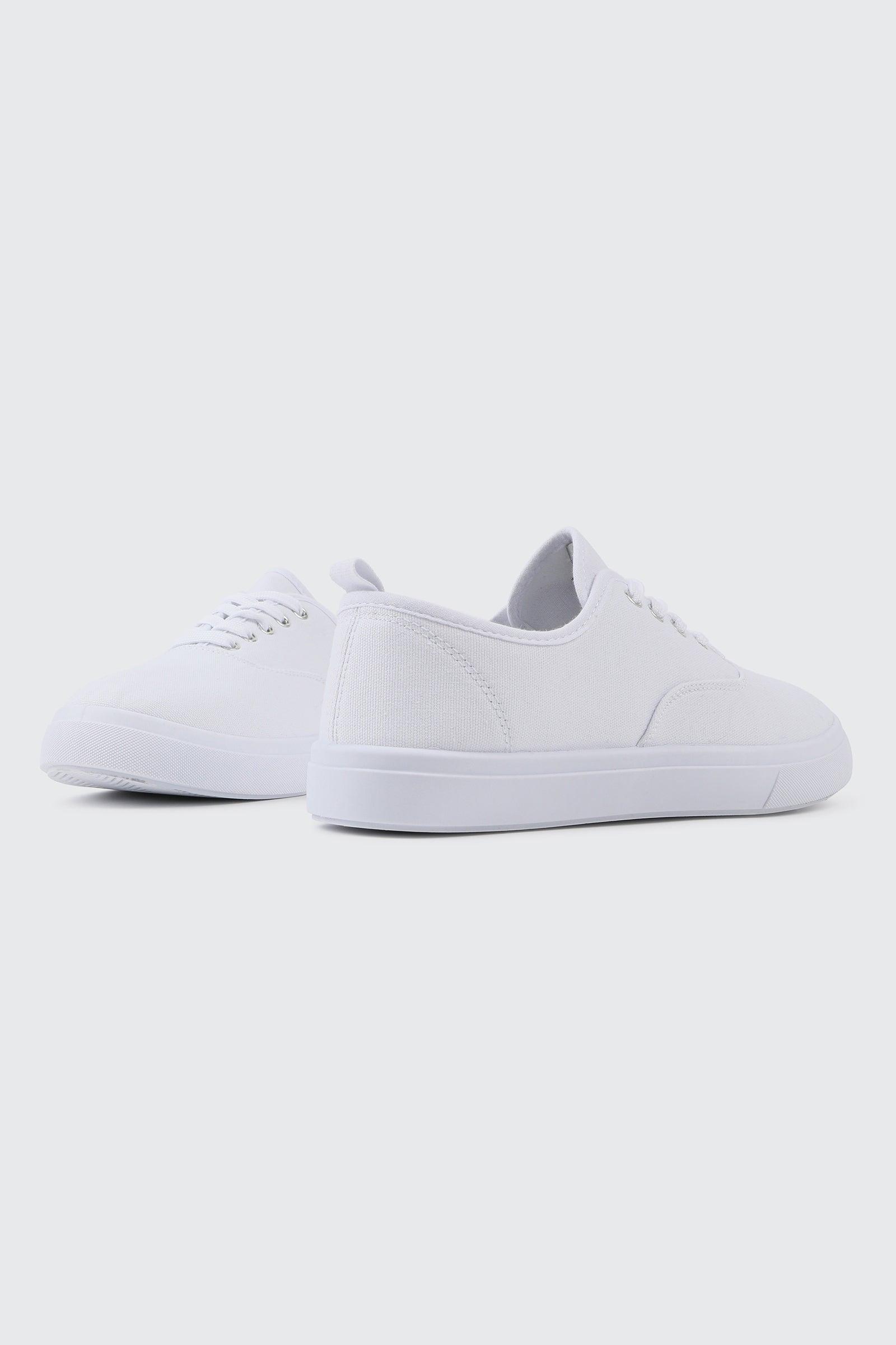 Eco-conscious canvas laced sneakers. Pull tab Upper and lining in recycled canvas Comfort foam+ insole Outsole: PVC | Ardene Low Top Canvas Sneakers in White | Size 7 | Eco-Conscious