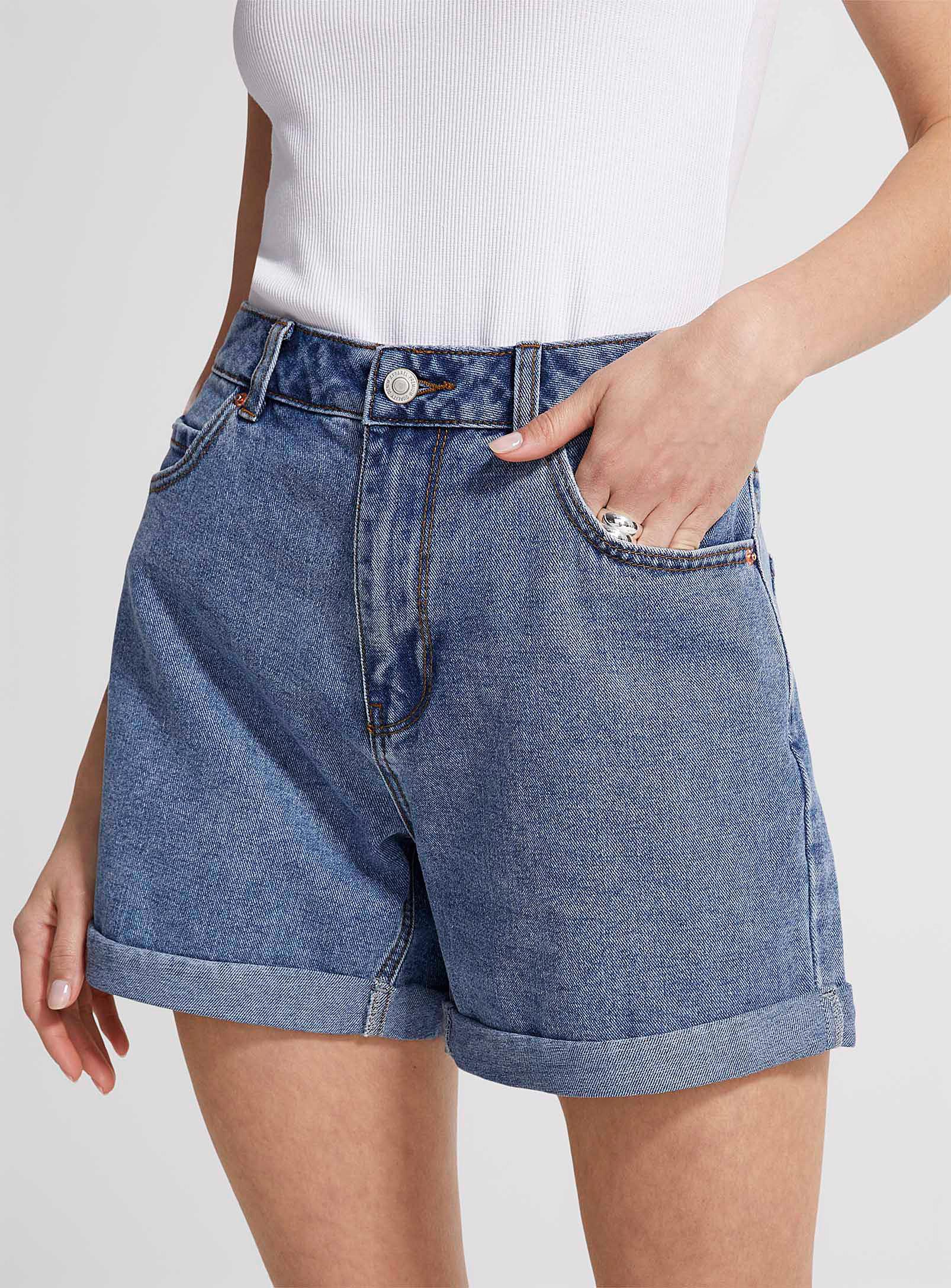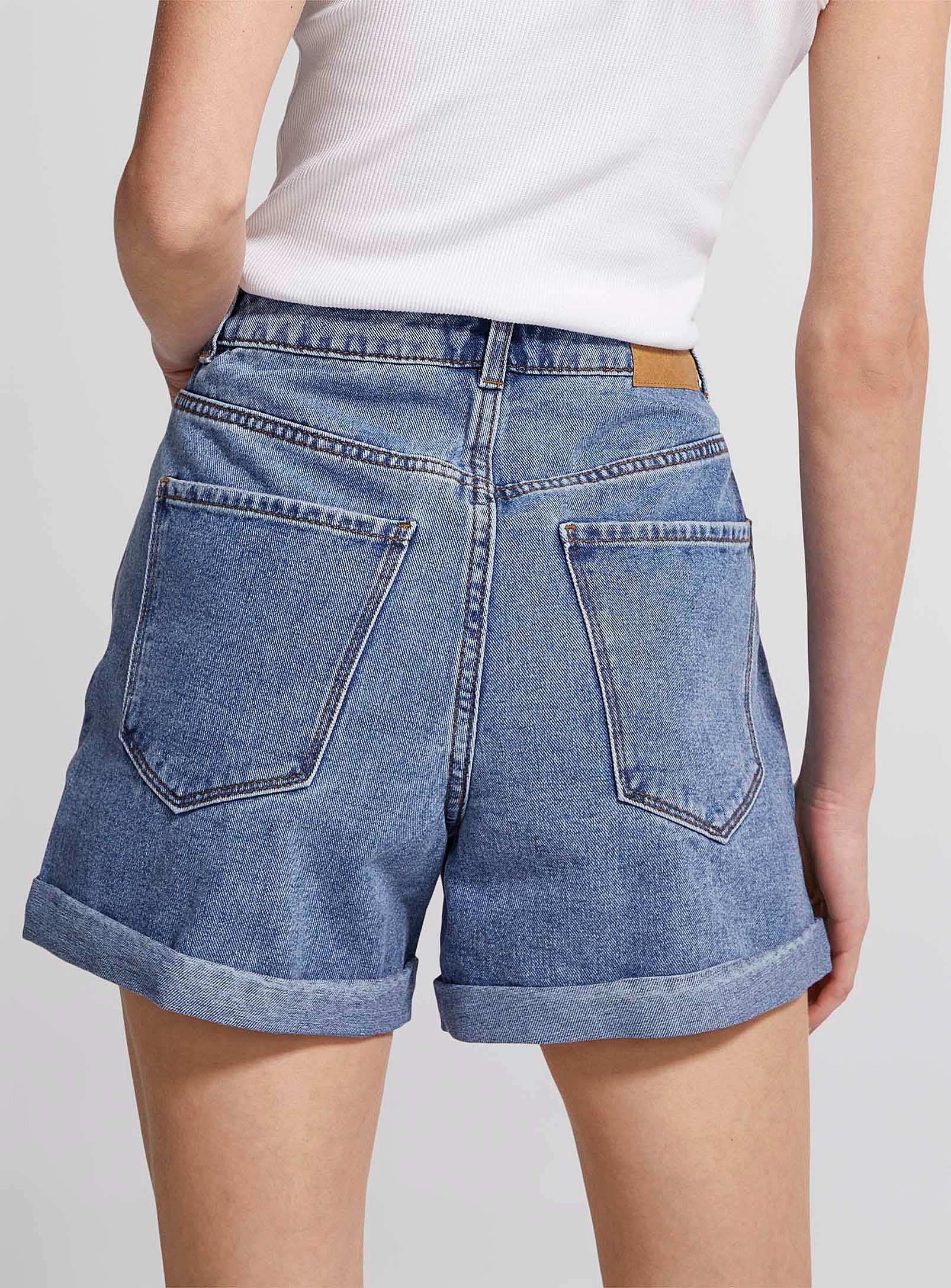 Women > Shortsbr>Vero Moda - Sewn cuffs denim mom short Vero Modabr>ul>li>Vero Moda at Icône/li>li>Cotton-polyester denim/li>li>5-pocket design/li>li>Sewn cuffs at the hem/li>/ul>br>b>Details/b> (size small)ul>li>Rise: 11" (28 cm)/li>li>Inseam length: 4.25" (11 cm)/li>/ul>br>br>The size of the item pictured is small