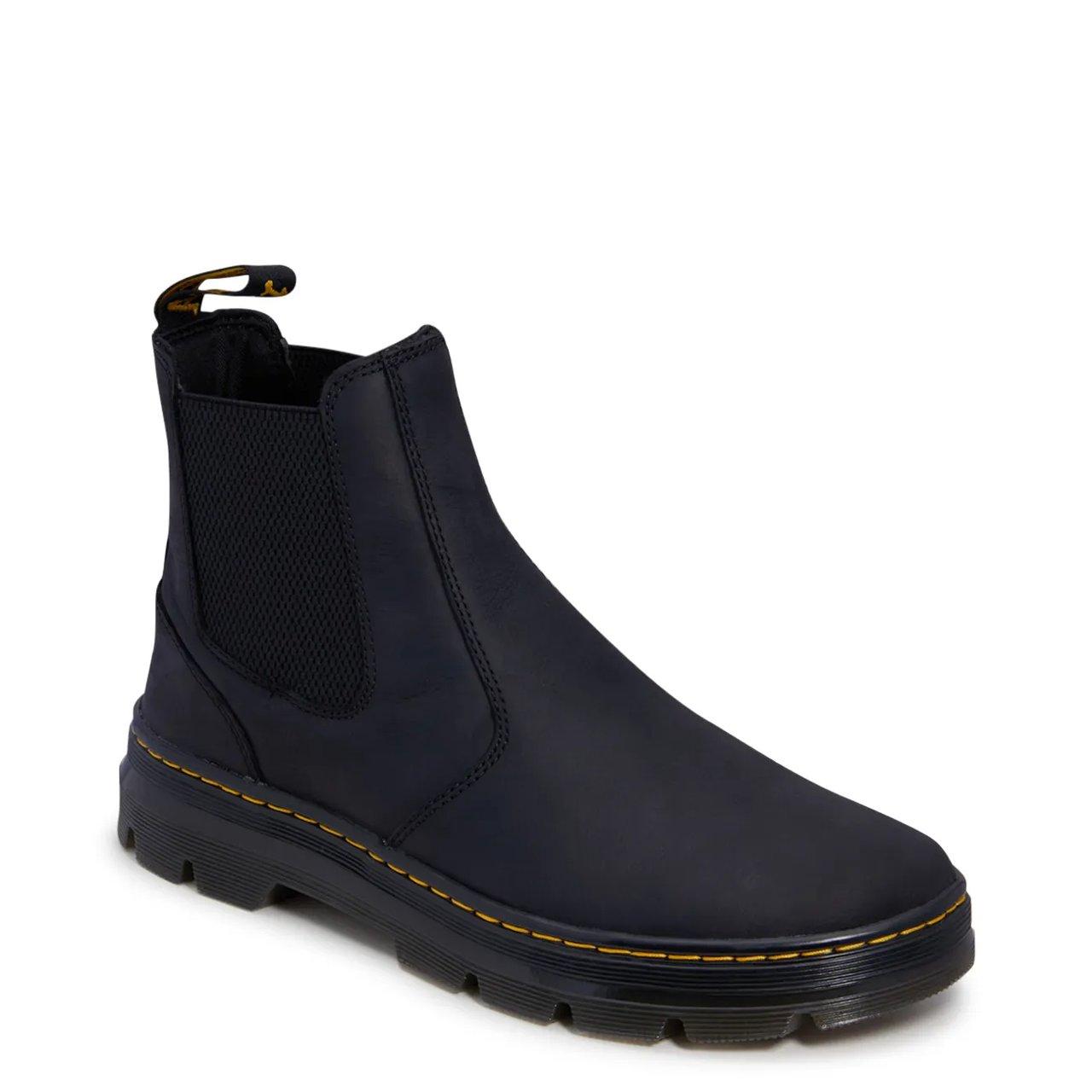 This product is in UK sizing, please select 1 size down from your actual size. Experience top-notch comfort in these unisex Dr. Martens Embury black hiking boots. Built with Wyoming leather upper, these Chelsea boots feature a classic round toe front, slip-on entry with gore elastic mesh gussets for style and a snug fit, grooved sides, cushioned textile footbed, sidewall stitch construction and a super-lite PVC outsole with patterned traction lugs. | Dr. Martens Men's UK Sizing Unisex Embury Chelsea Boot in Black Size UK 9/US 10 Medium