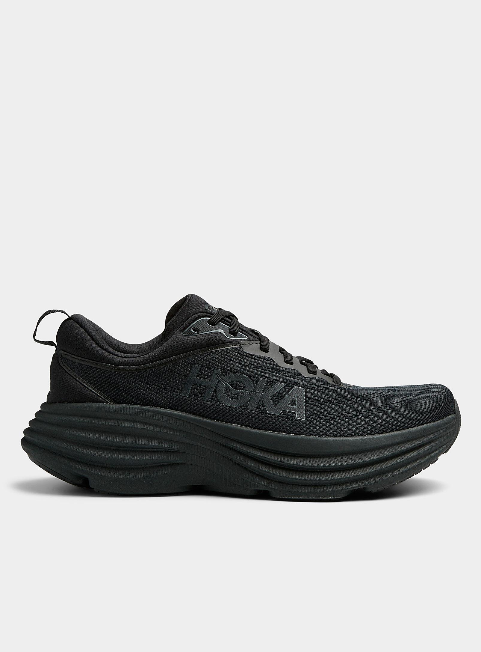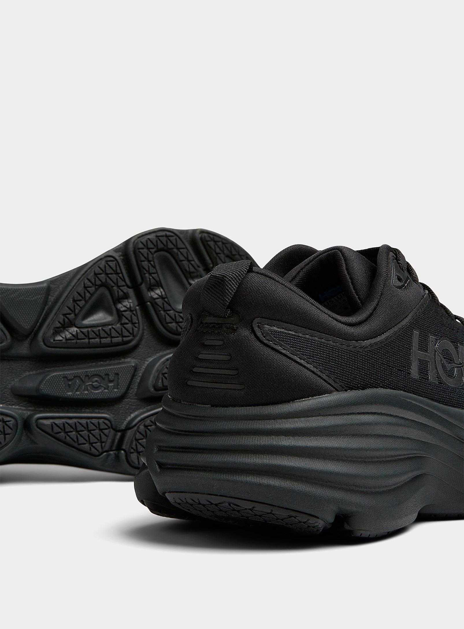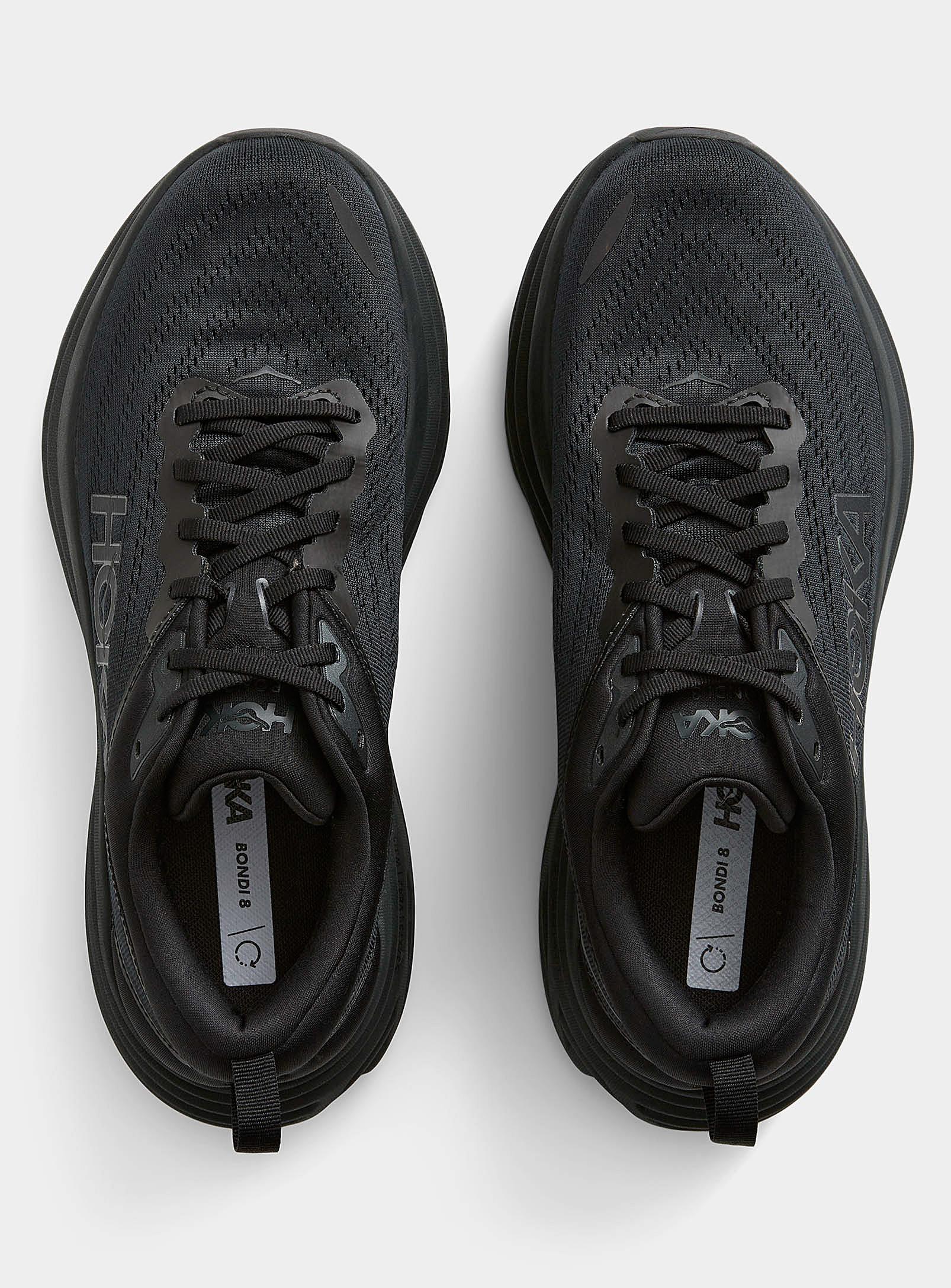 Hoka - Bondi 8 sneakers Men Hoka HOKA at Simons Reworked with softer, lighter foams and all-new extended heel geometry, the Bondi 8 takes a bold step forward. Designed to provide neutral support, it features a balanced crash pad (with no pronation-correcting technology) that is higher and softer, for an incredibly cushioned heel strike and a smooth stride. Breathable engineered mesh upper Recycled content lining mesh Memory foam collar to accommodate a wide variety of ankles Early stage Meta-Rocker technology: the curved Meta-Rocker is engineered into the sole to prevent flat landing and propel you forward. The early stage type is made to go fast, positioned in the rear for faster heel-to-forefoot transitions. Wider beveled heel Removable foam footbed Ultralight resilient foam midsole delivers the perfect blend of soft and bouncy Highly abrasion-resistant strategically placed rubber insert on the outer sole Rear crash pad provides a balanced ride from heel-strike to forefoot transition Model number: 1123201-BBLC
